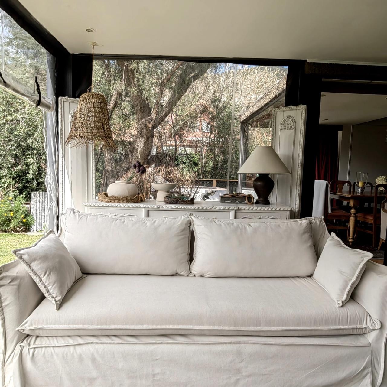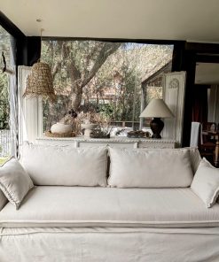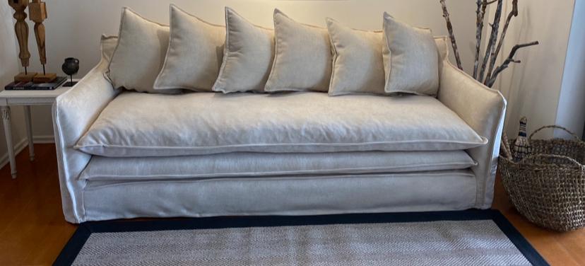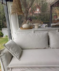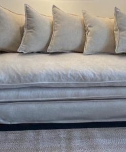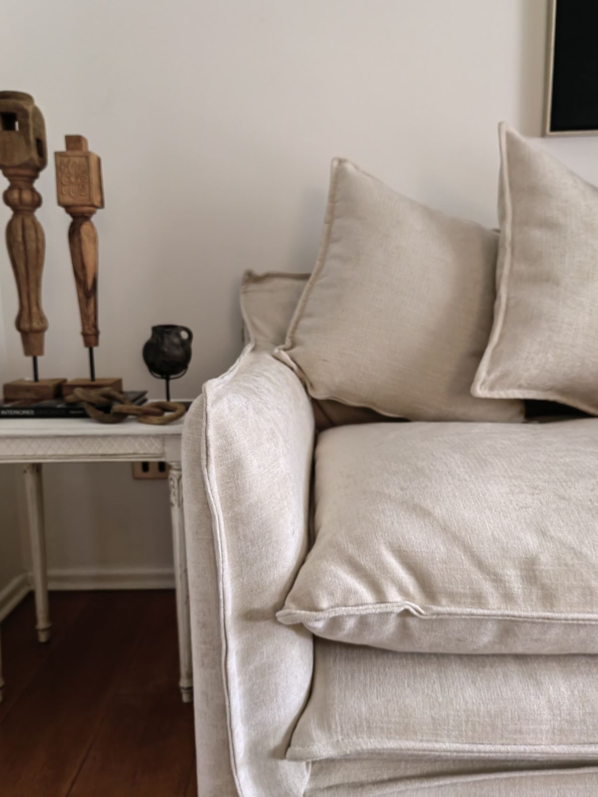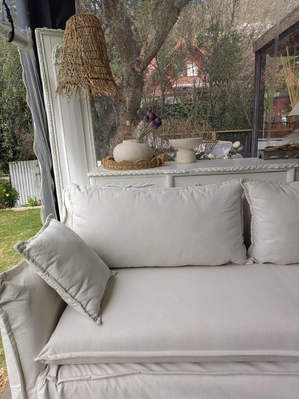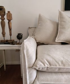 patas de 4 cm, funda de la misma tela, cojines de alta densidad y cojín asiento relleno plumas