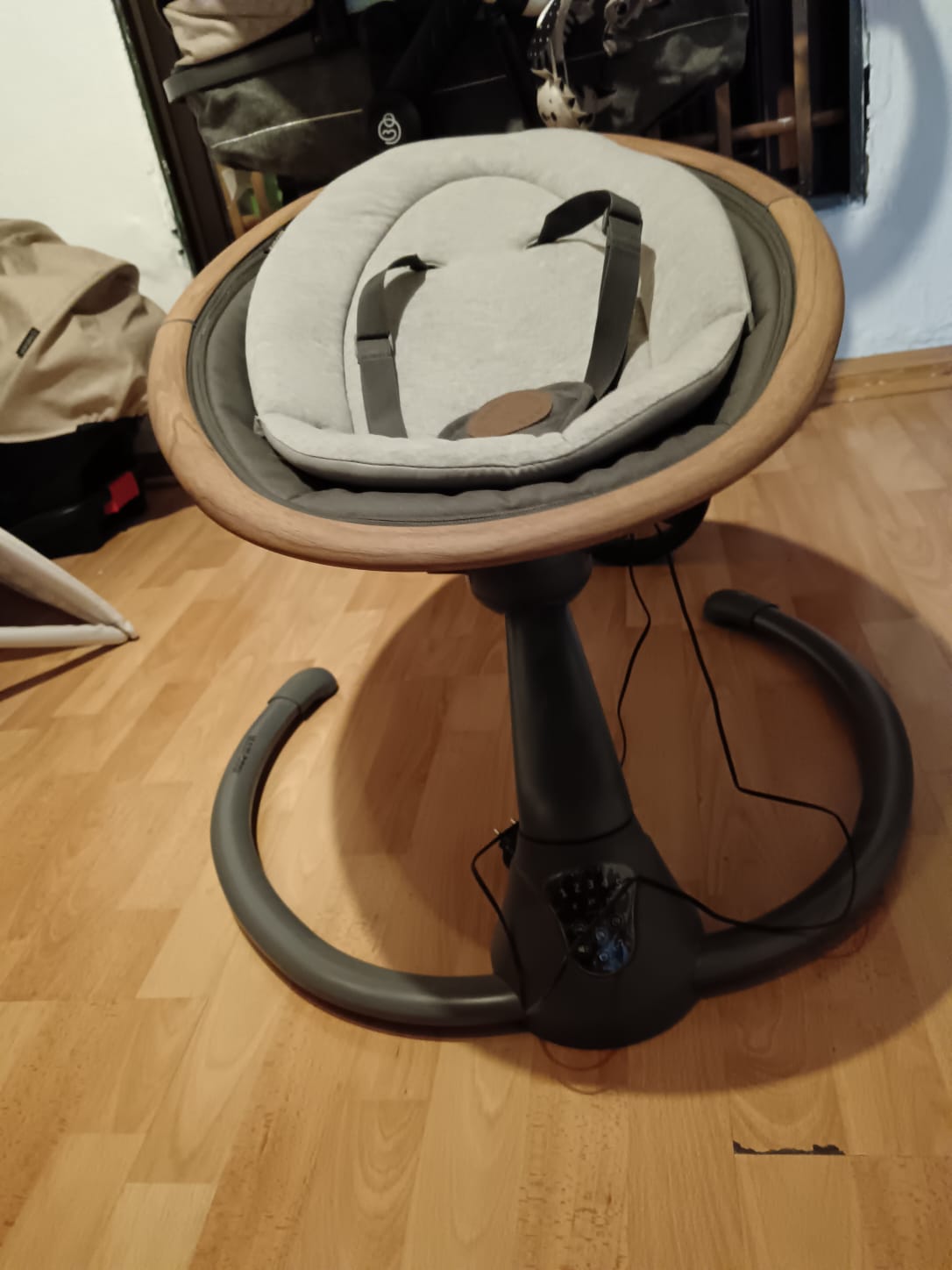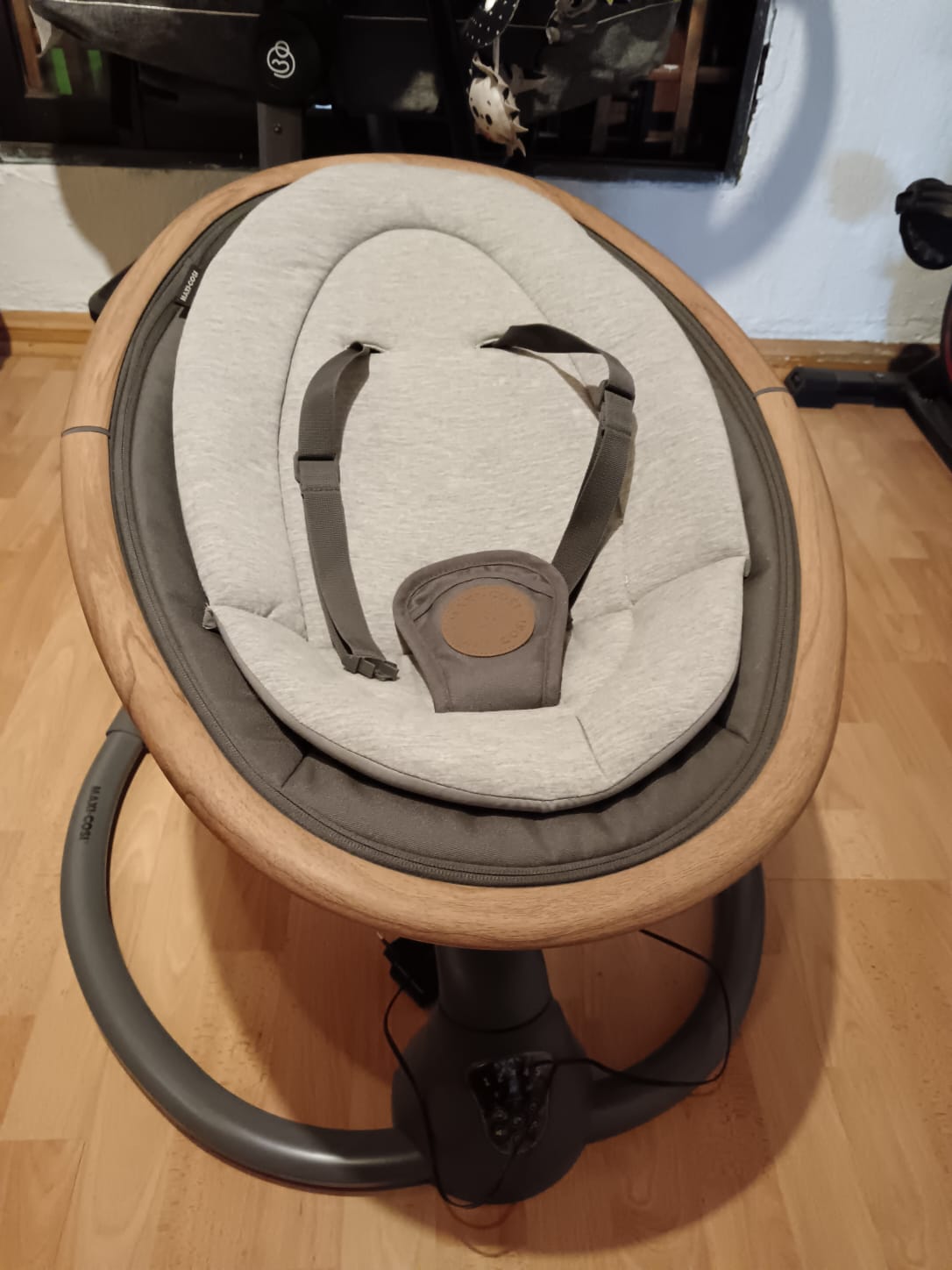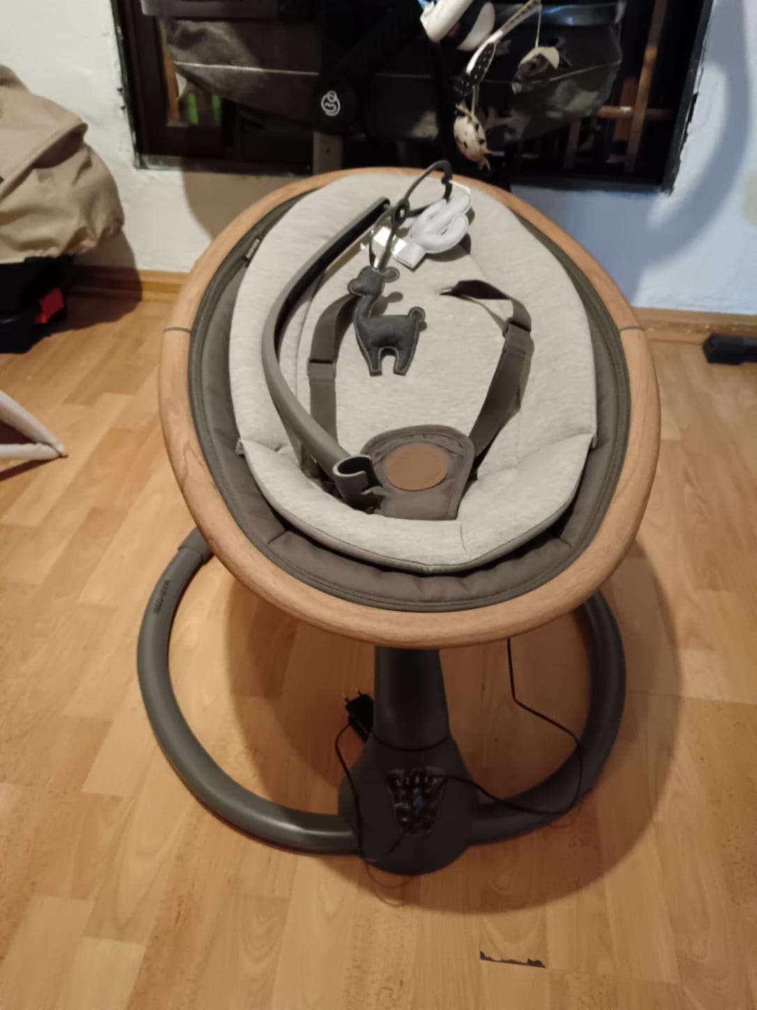 2 posiciones de reclinación y 5 velocidades de balanceo. Rotación de 360°, pantalla táctil, almohadilla extraíble, 16 melodías, sonidos relajantes.