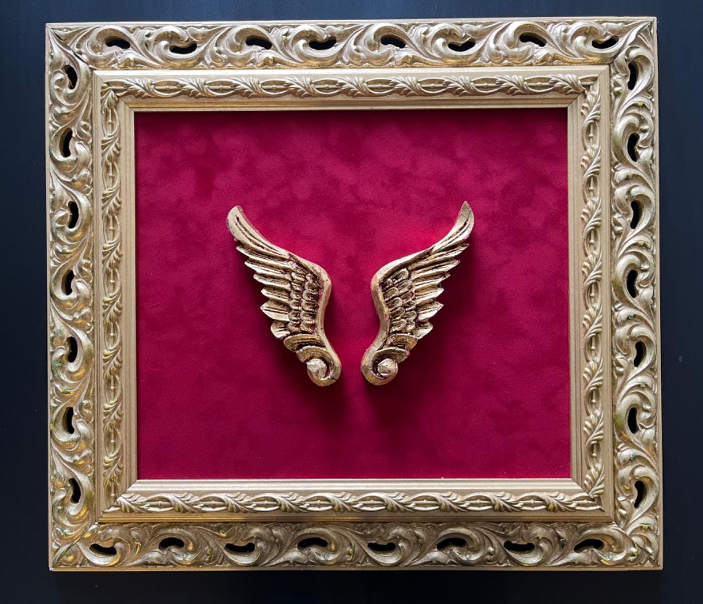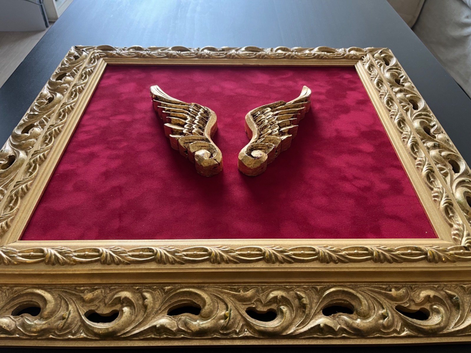Etiquetas: alas, dorada, folia, madera, terciopelo rojo