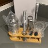 Medidas: coctelera 10×25 cm, copas 6×12 cm y bandeja 30 cm diam