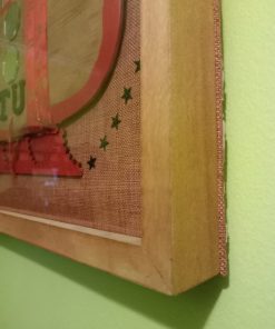 Obra única, fondo arpillera, telas y caras de género, enmarcado