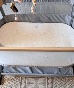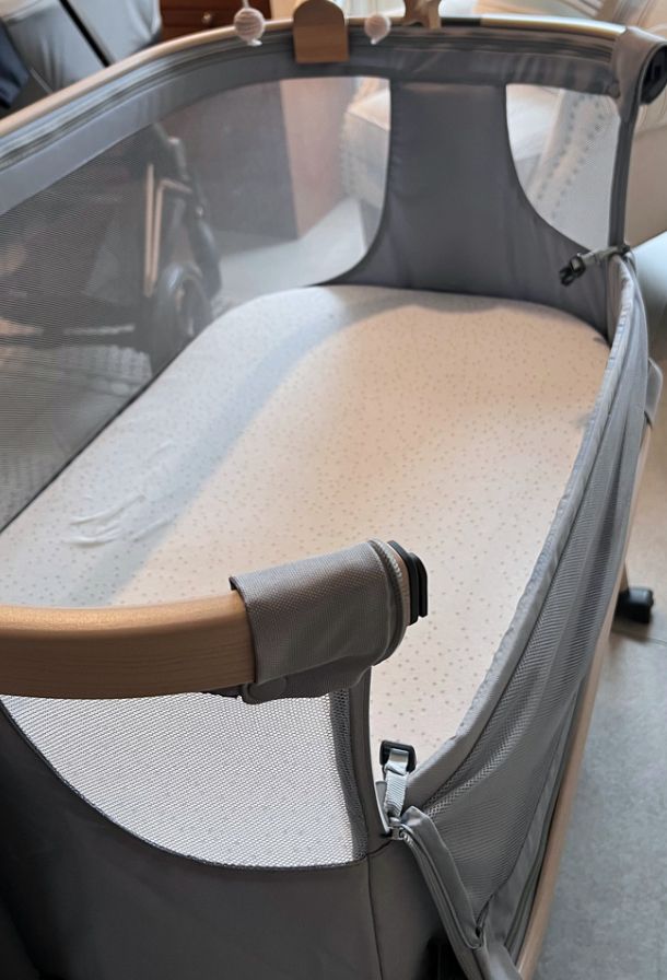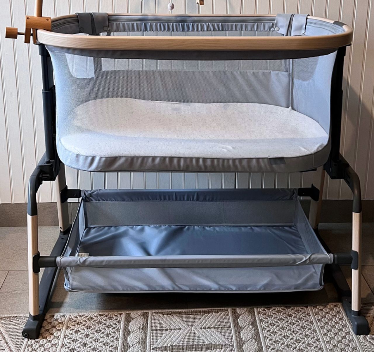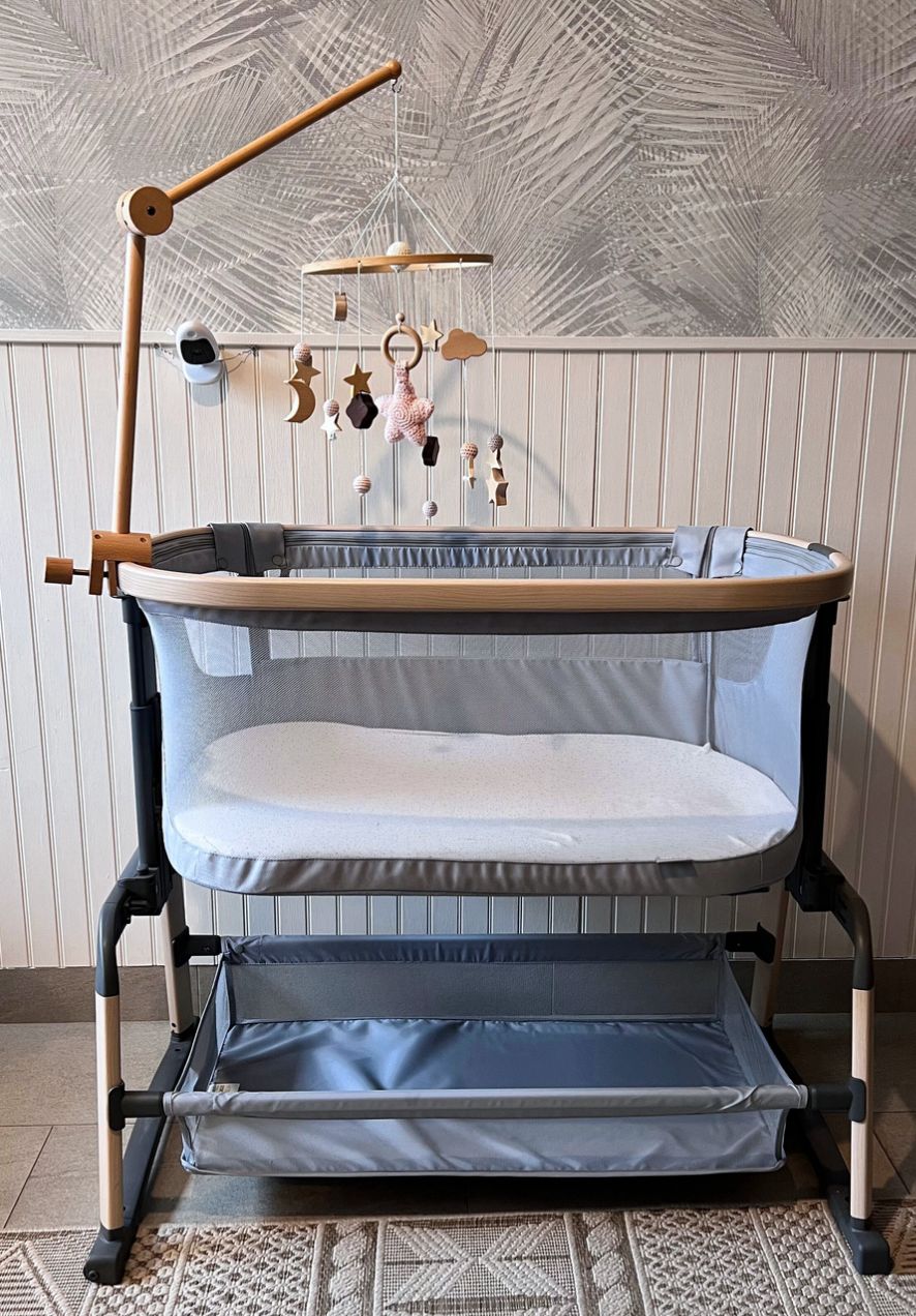Incluye correas, colchón, bolsa para guardar y juego de sábanas de regalo, y móvil (fue reparado)