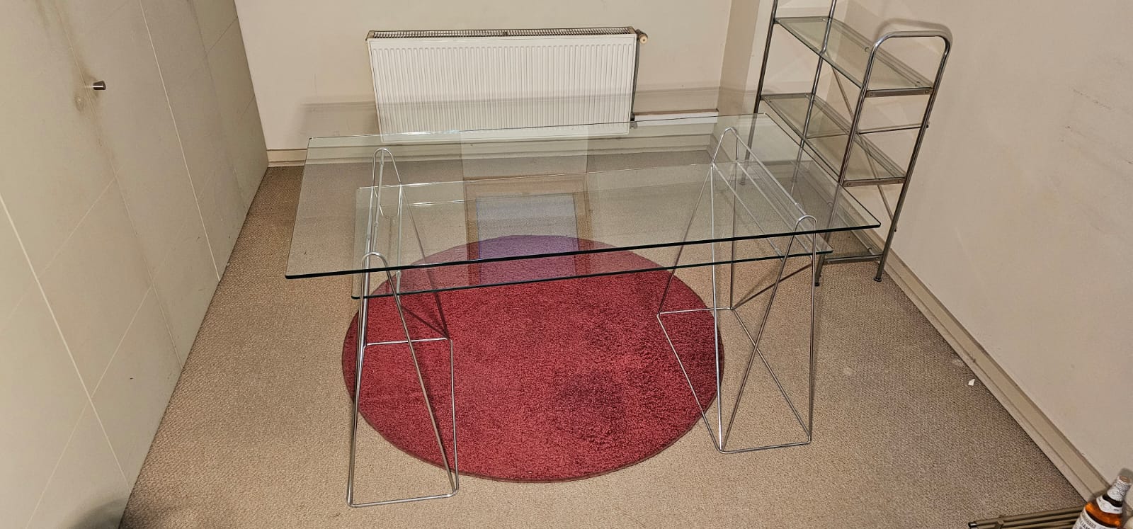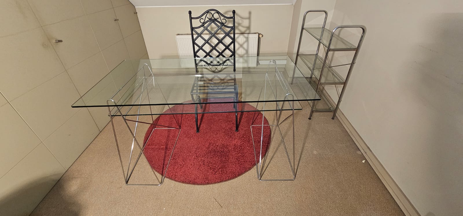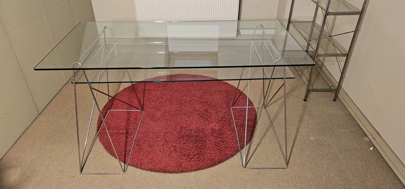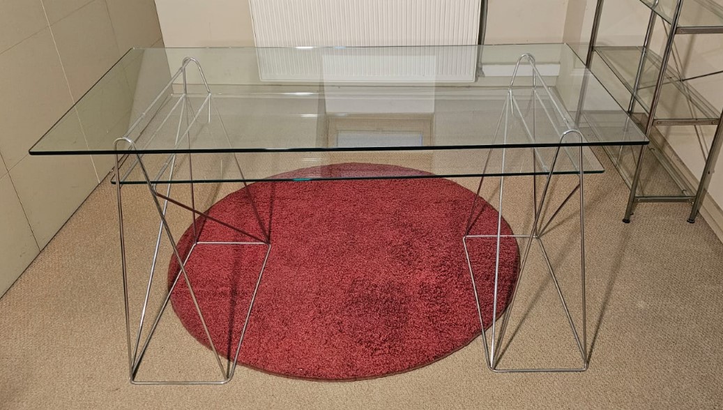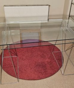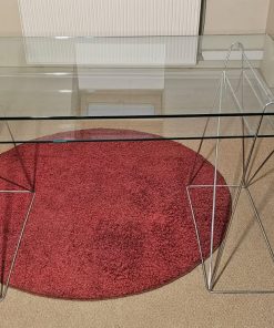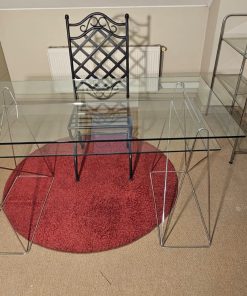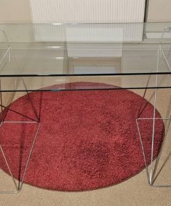 Dos cubiertas de vidrio y base de acero inoxidable. Incluye silla de regalo