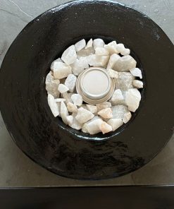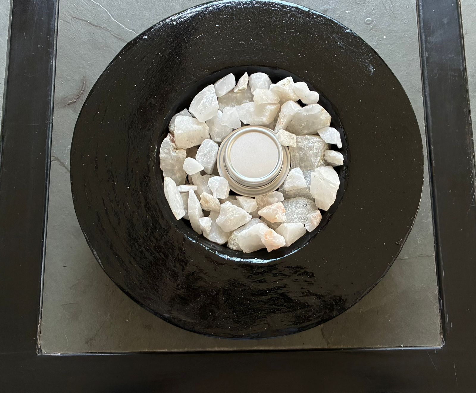 Hecho de cemento mezclado con cuarzo blanco del Valle del Elqui, empastado con algo de yeso y pintado en negro brillante