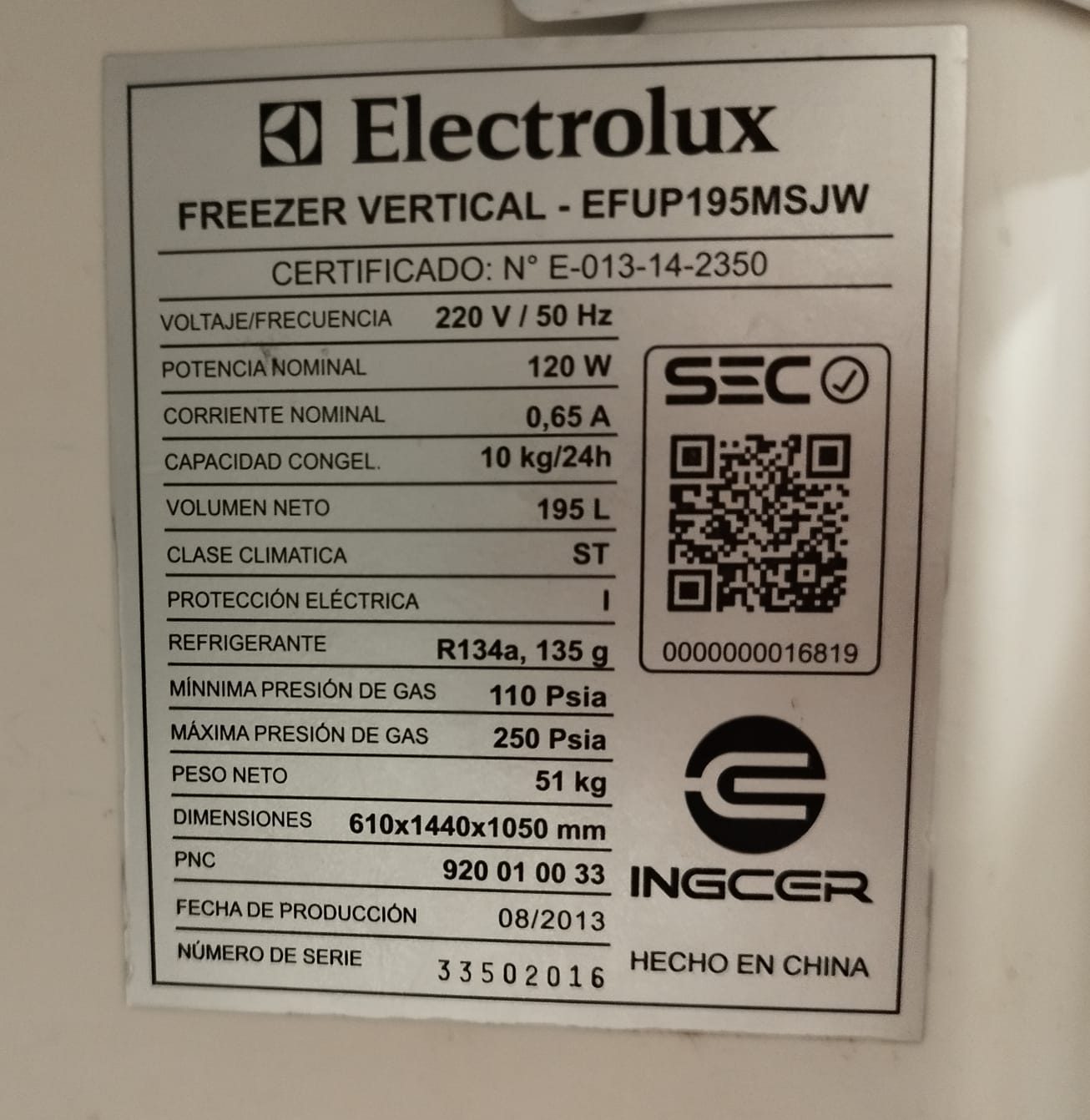 Freezer vertical Electrolux 195 Lts