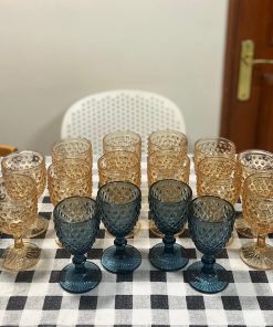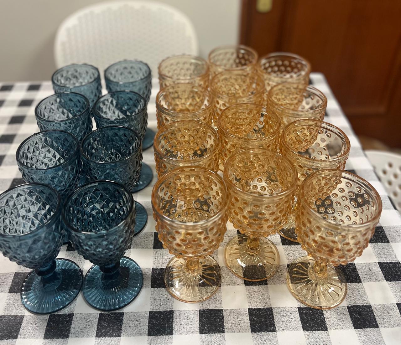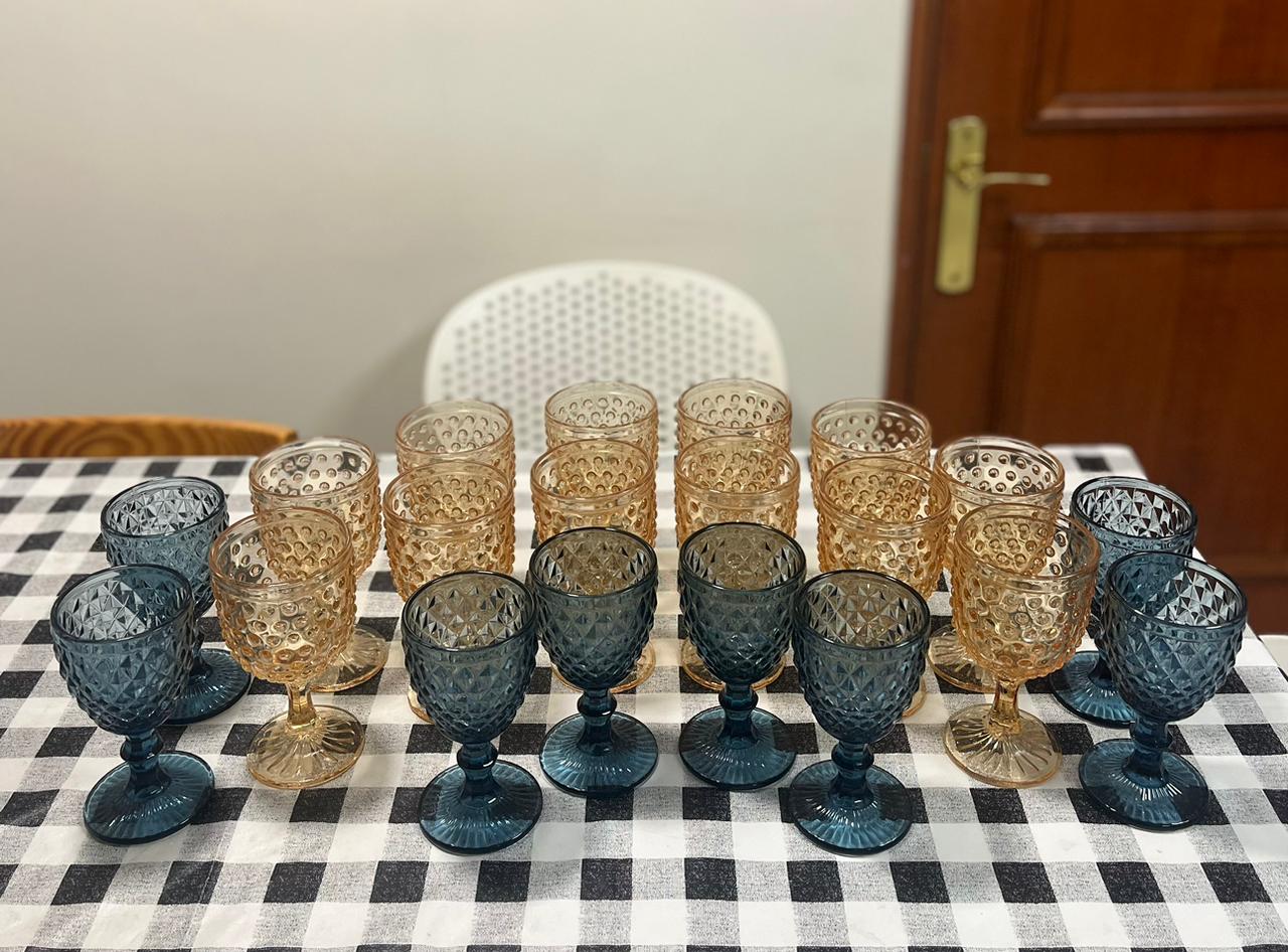 Distintos tamaños, son 12 copas naranjas y 8 azules
