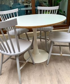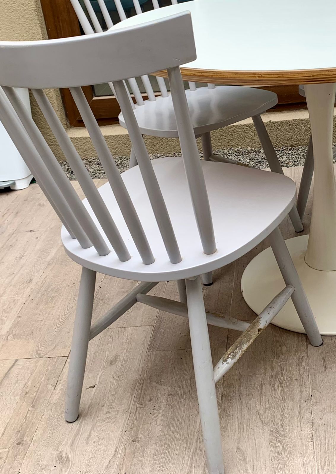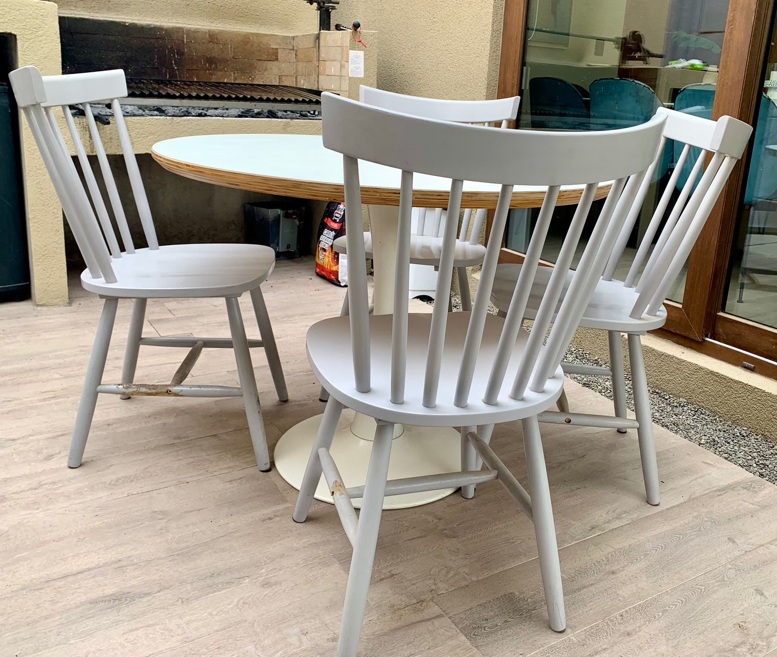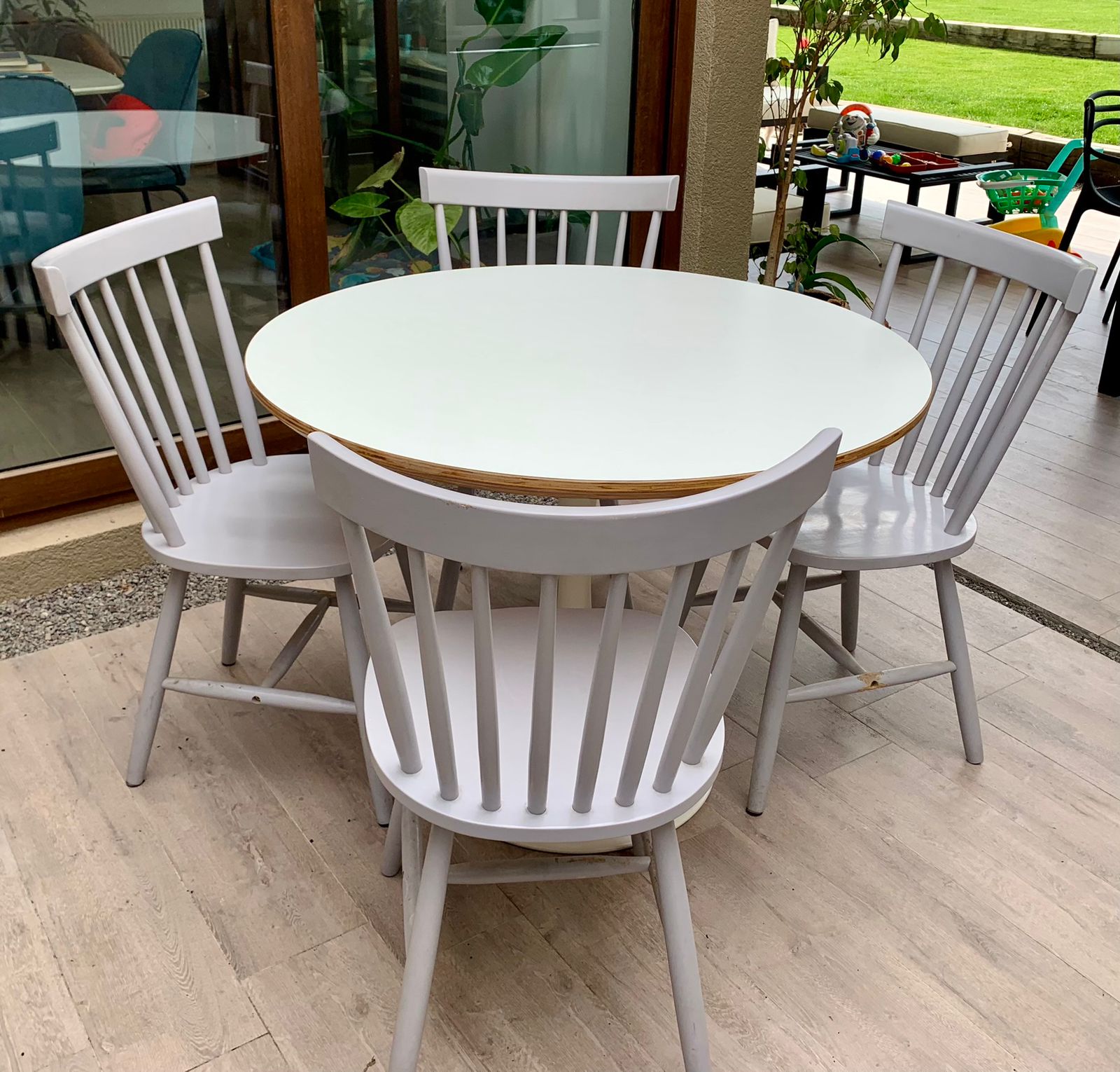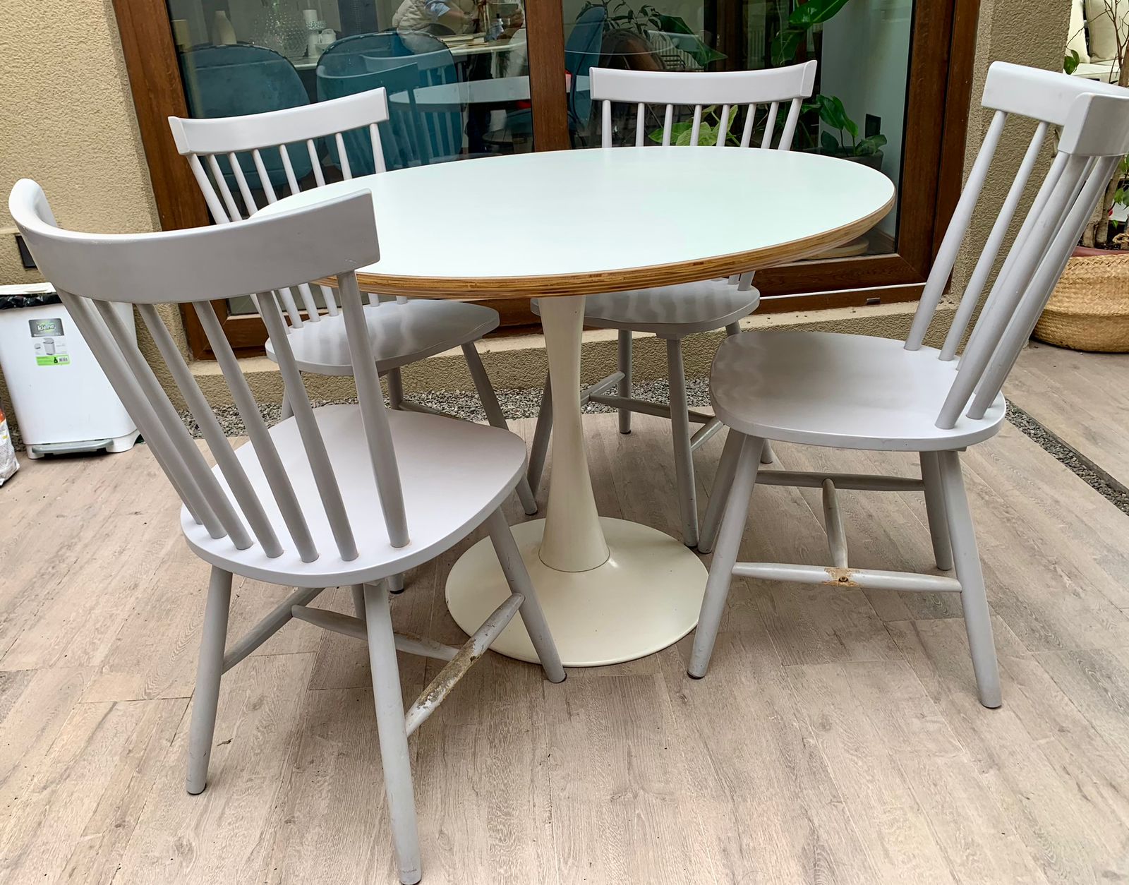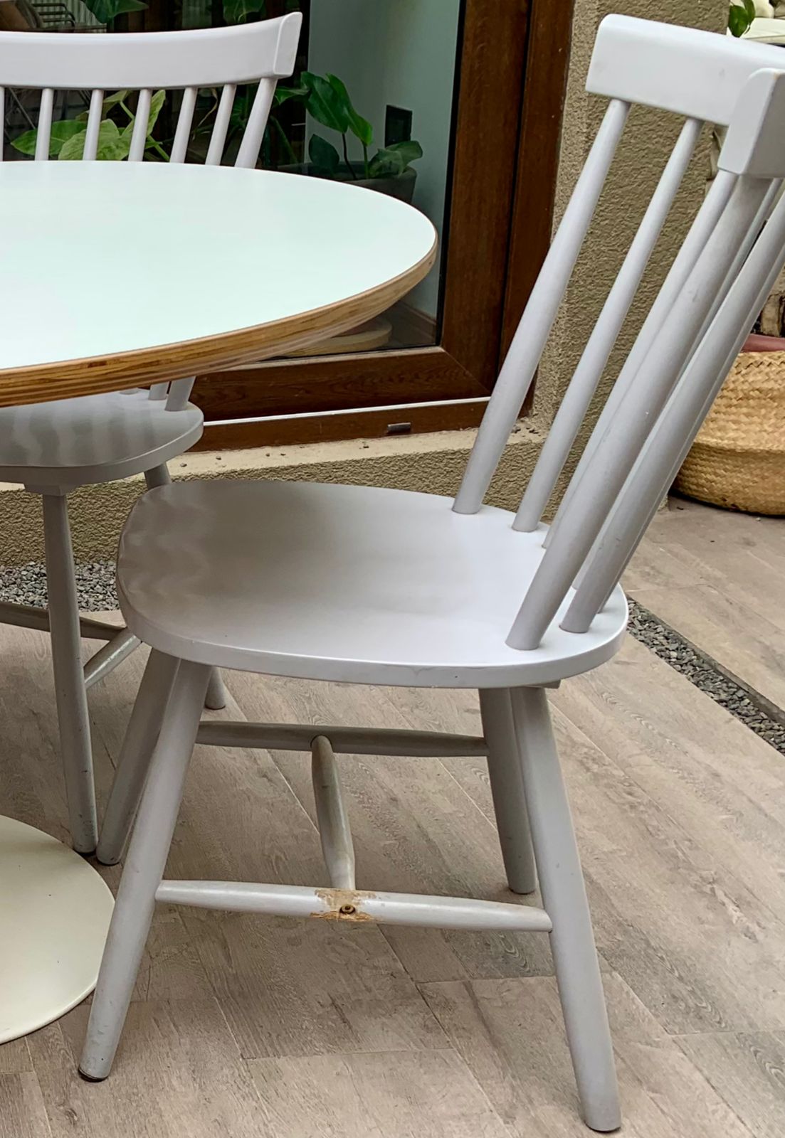 5 años uso, mesa muy buen estado. Una silla con mordidas de perro, estético no estructural