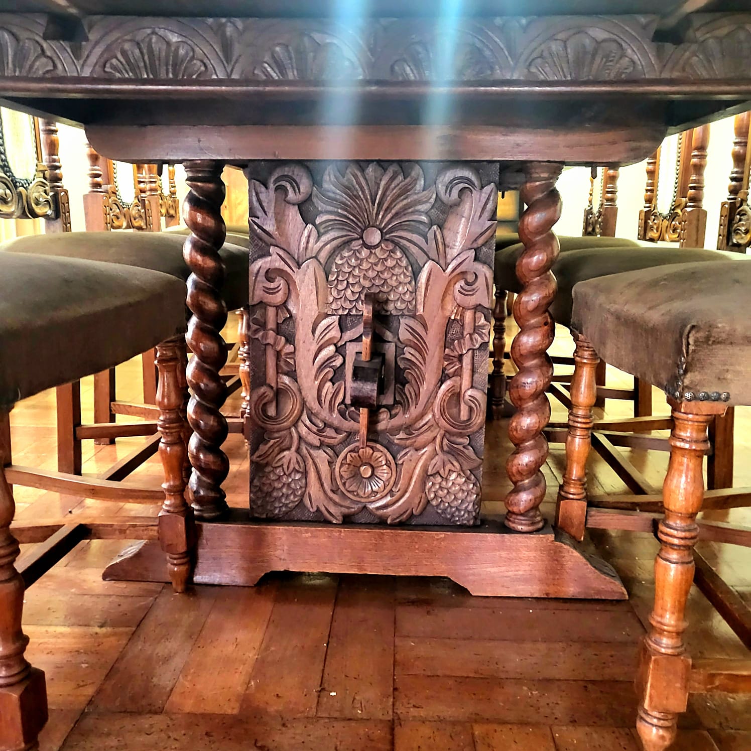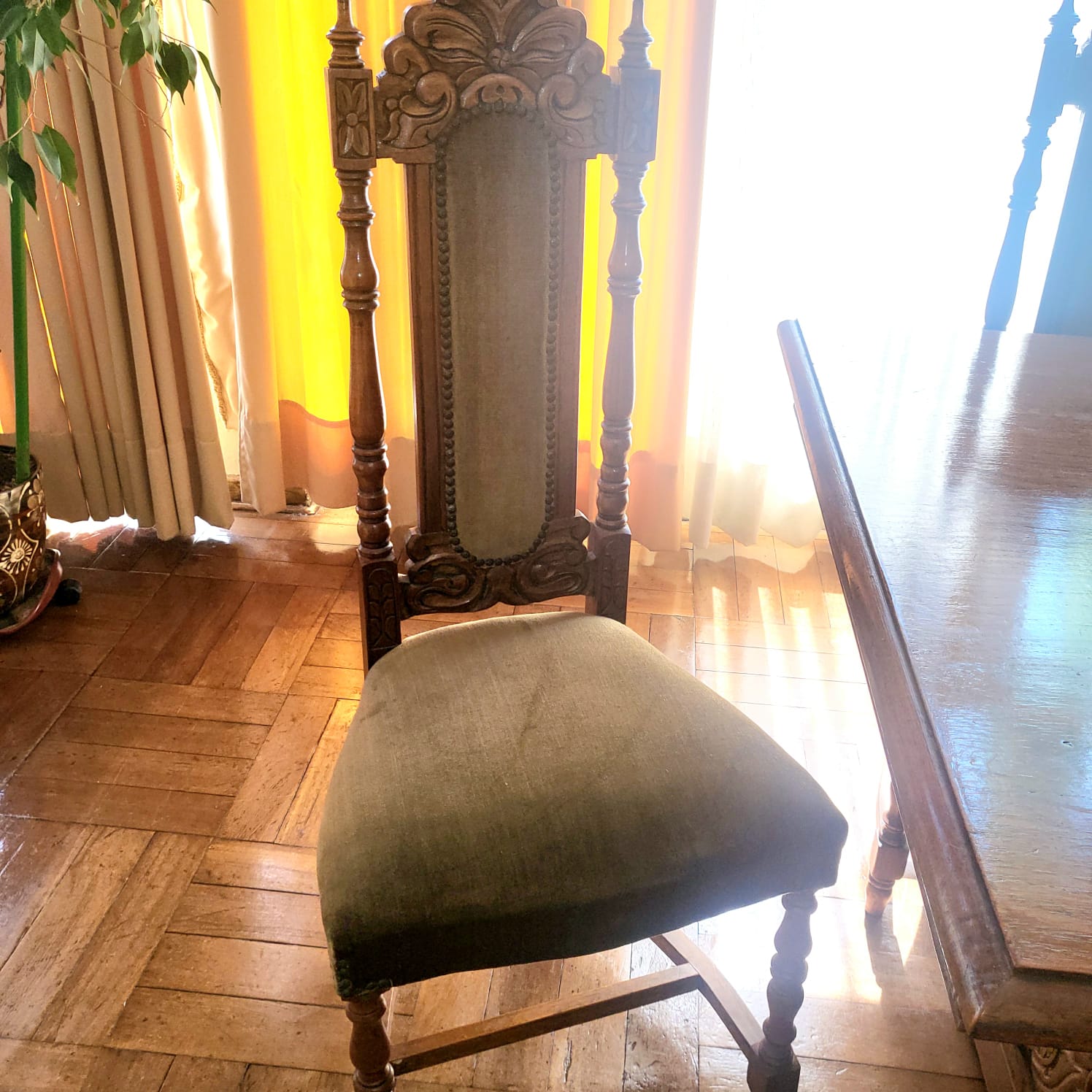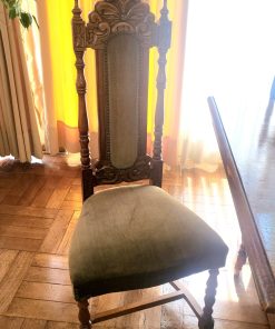 Detalles de manchas en tapiz de sillas y algunas hendiduras en madera por el uso