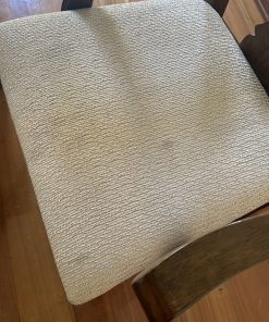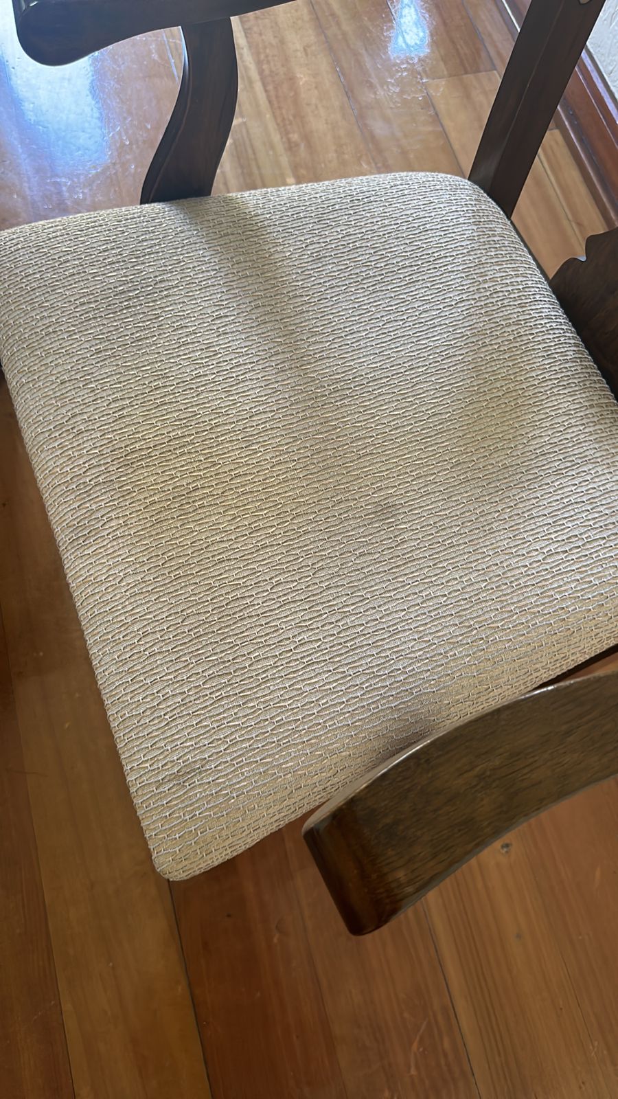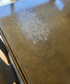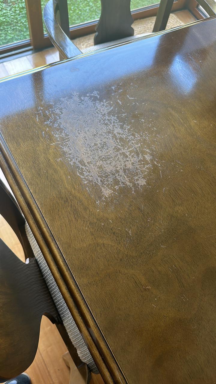 Detalles de manchas en tapiz y marcas en un costado de la mesa