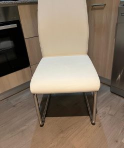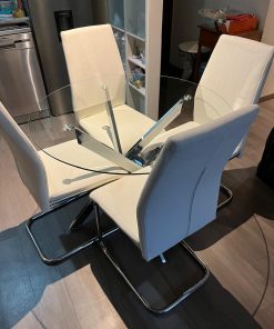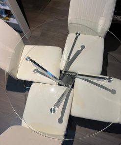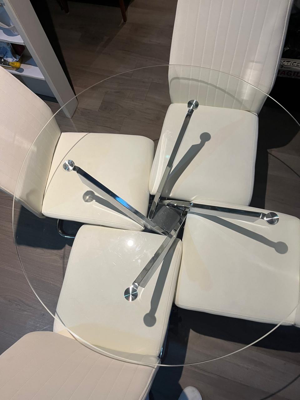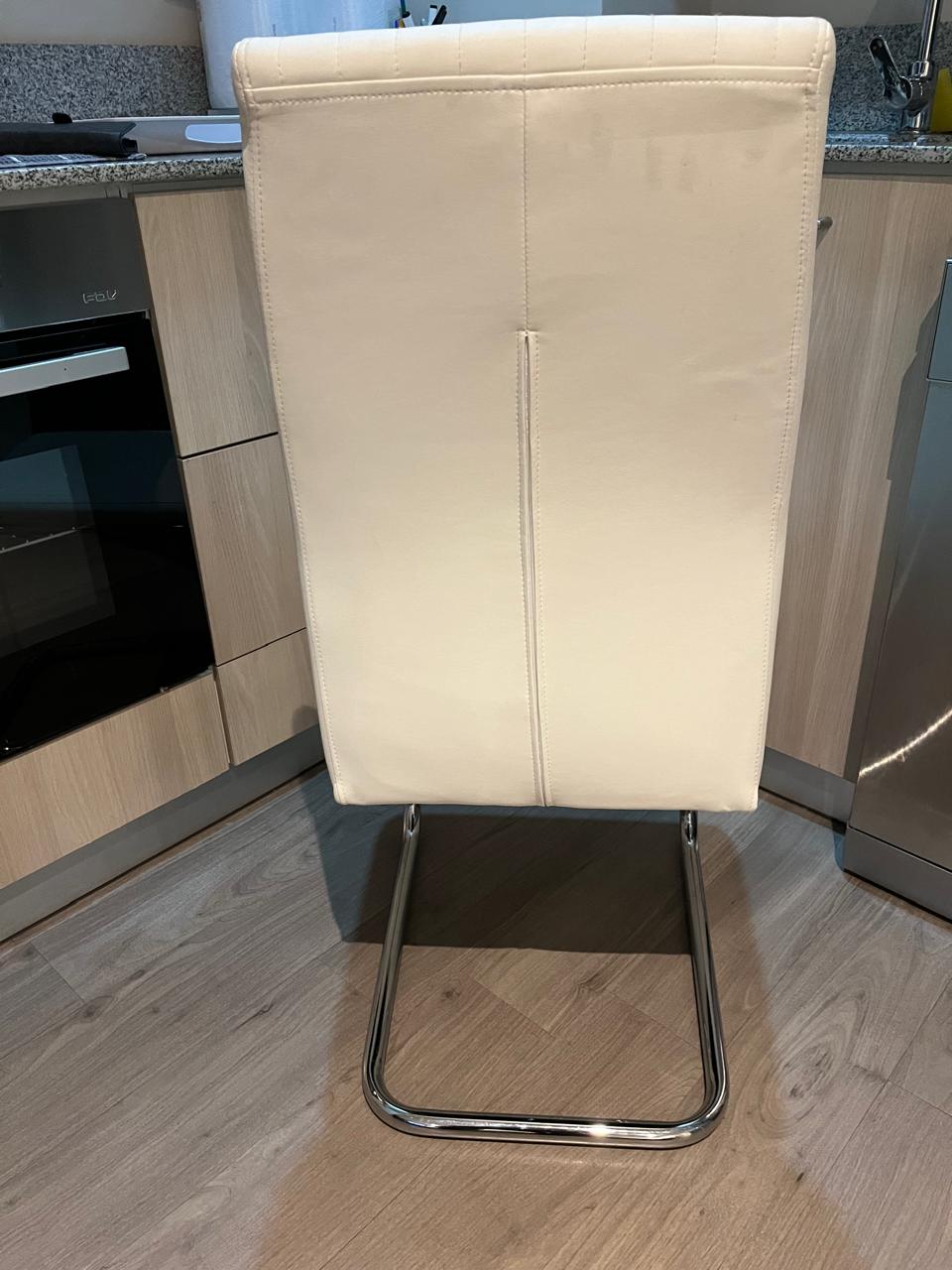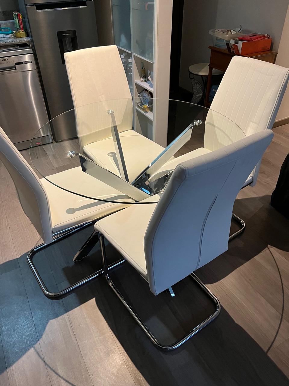 Base mesa cromada, sillas ecocuero blanco y patas cromadas
