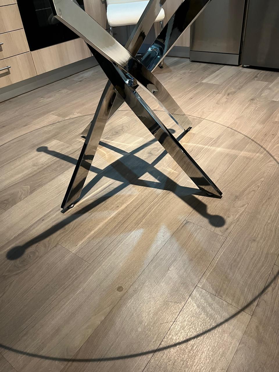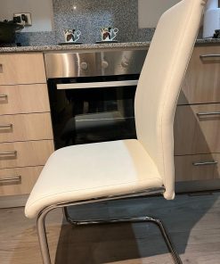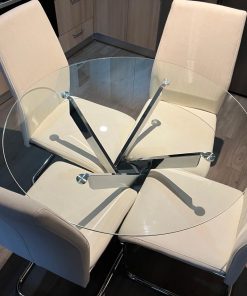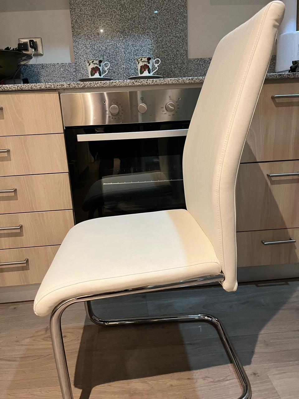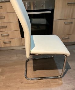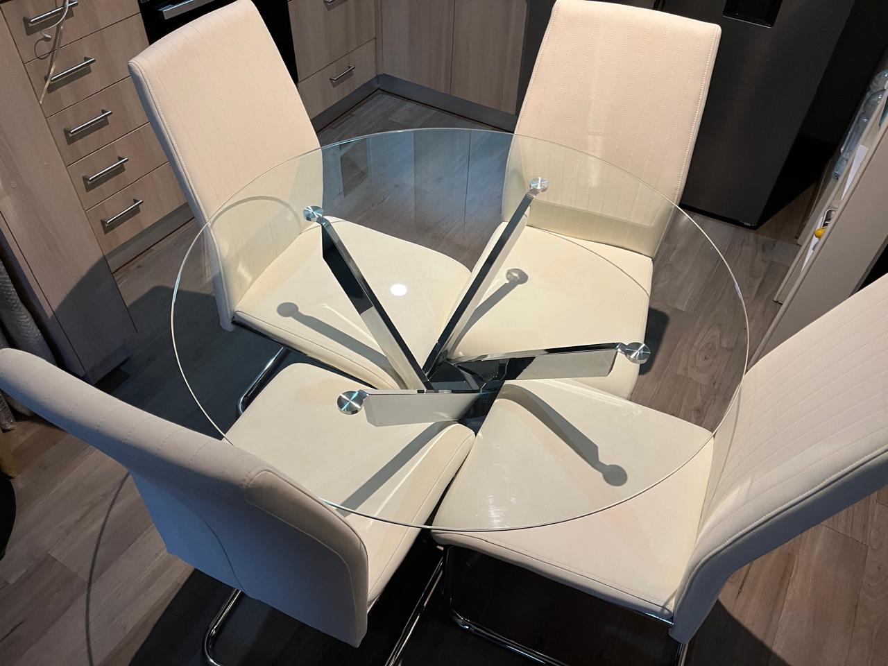 Base mesa cromada, sillas ecocuero blanco y patas cromadas