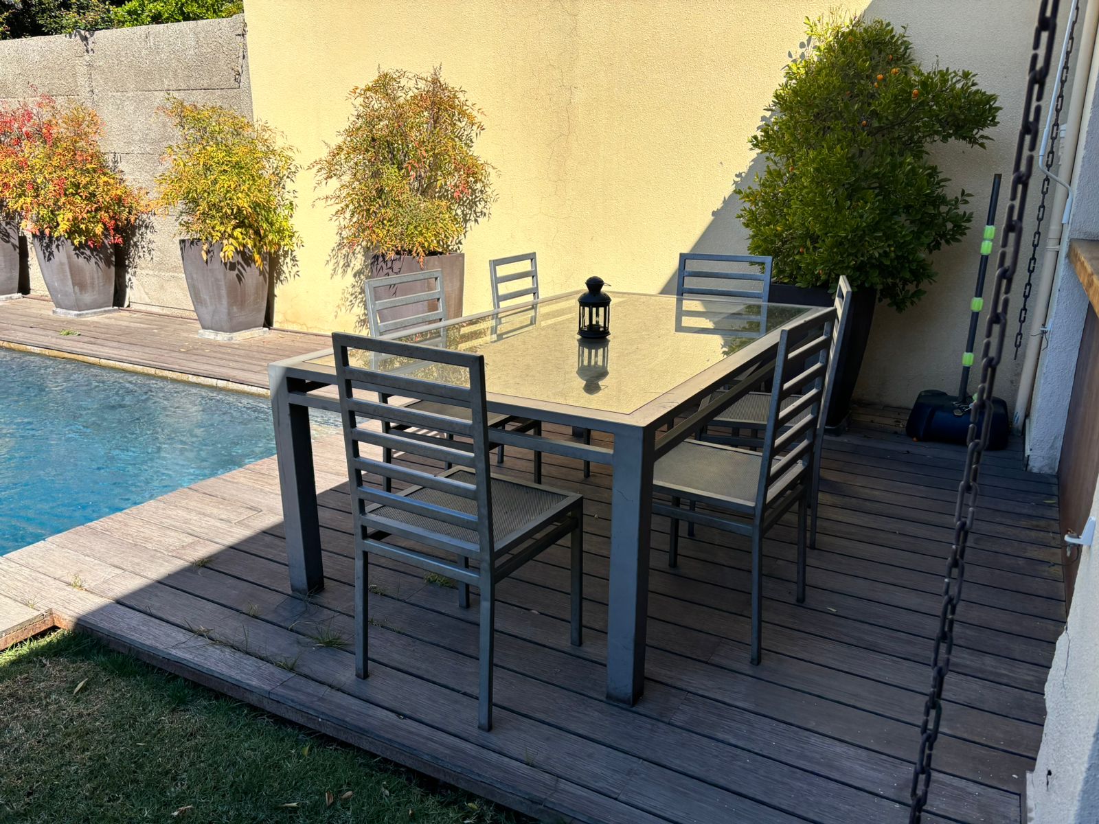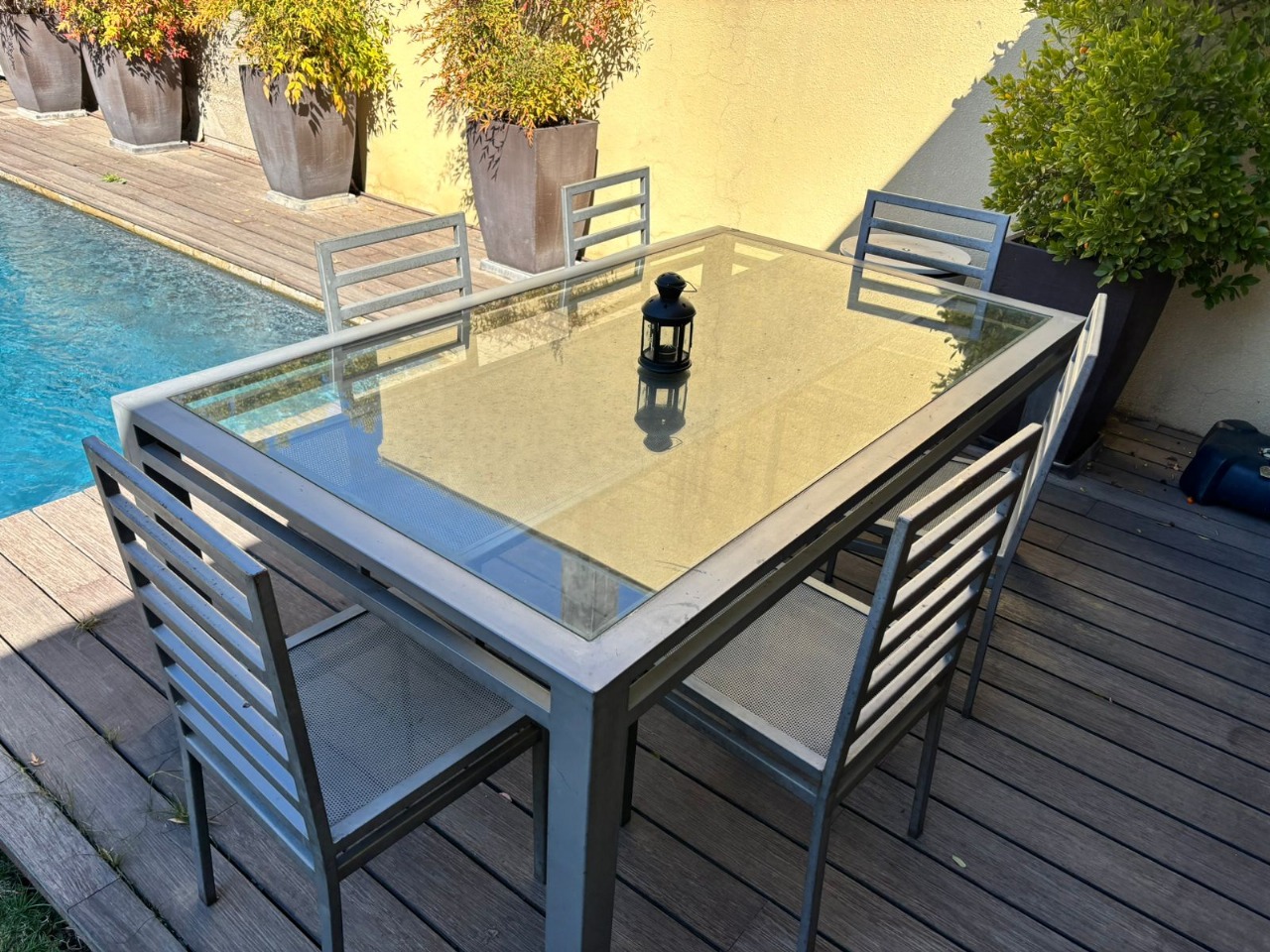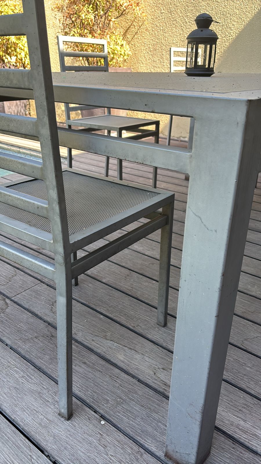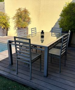 Juego comedor terraza gris fierro y vidrio 6 sillas