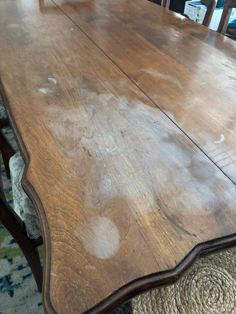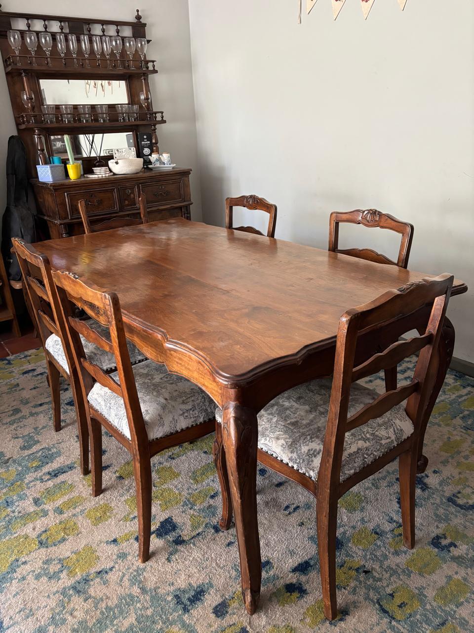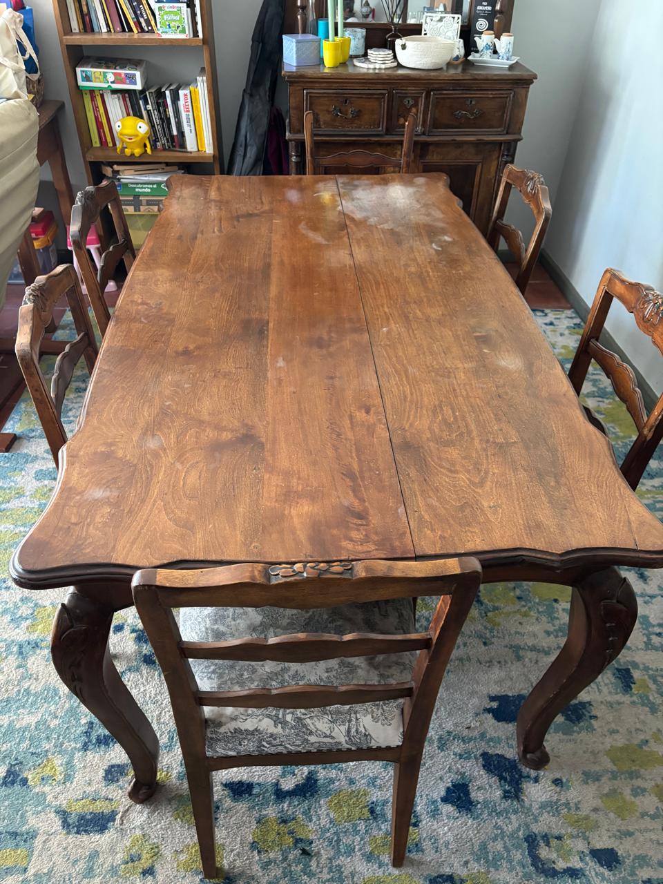 Requiere restauración, sillas sueltas y una sin respaldo, manchas en cubierta de mesa