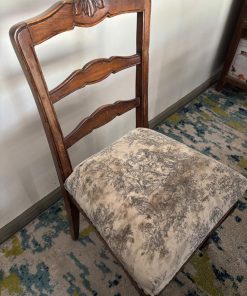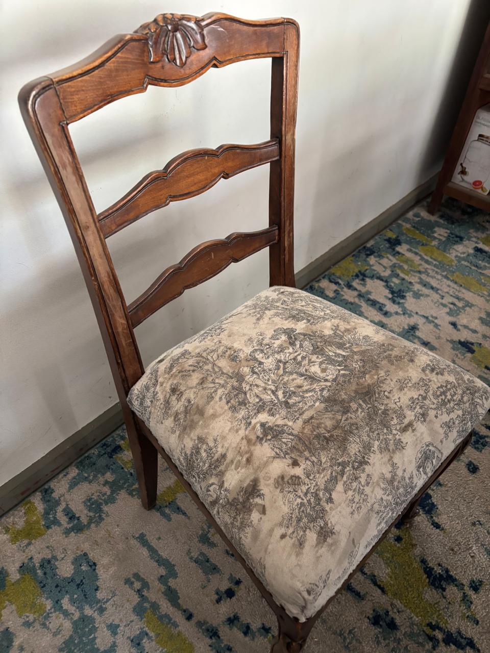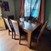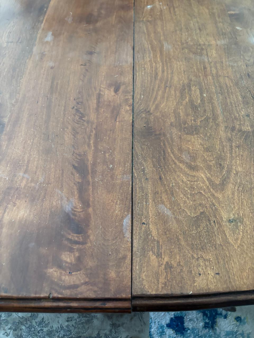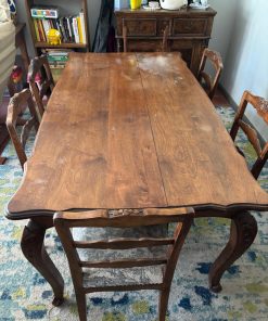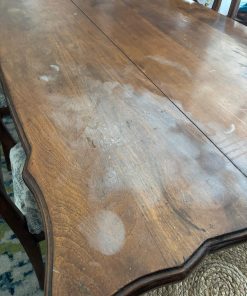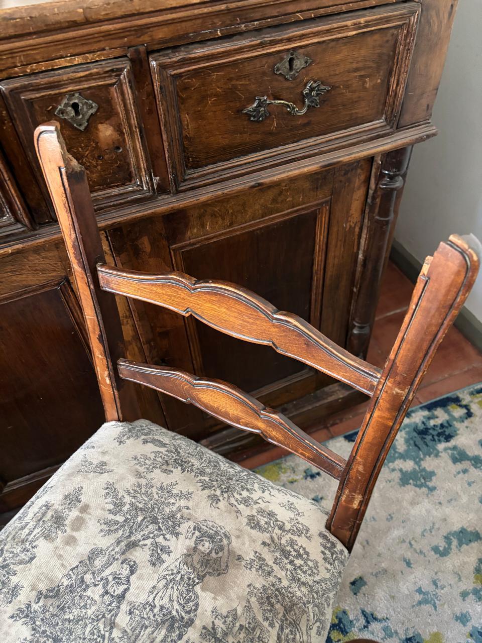 Requiere restauración, sillas sueltas y una sin respaldo, manchas en cubierta de mesa