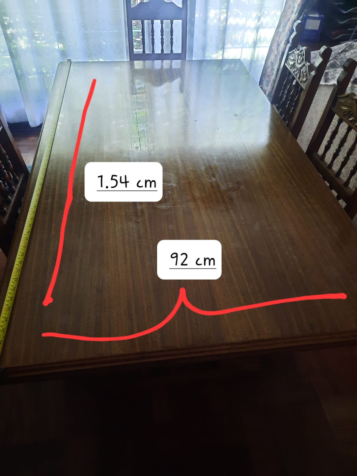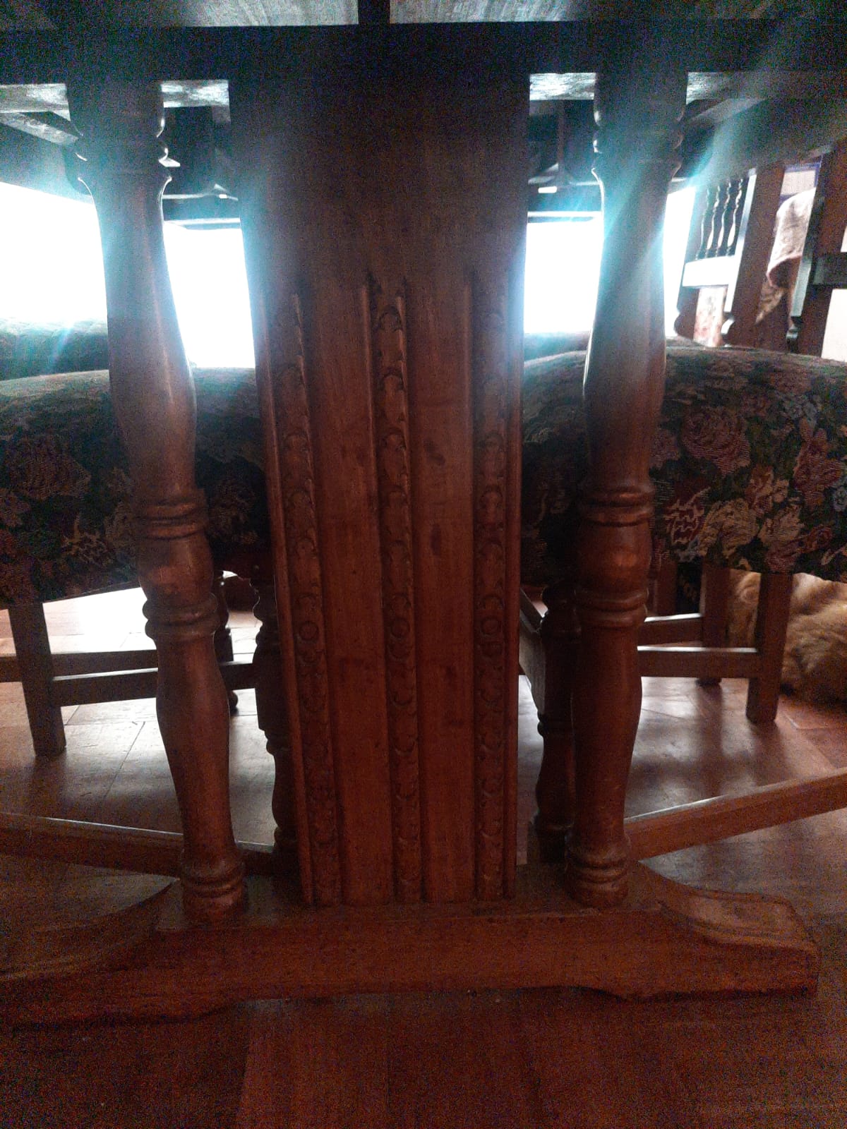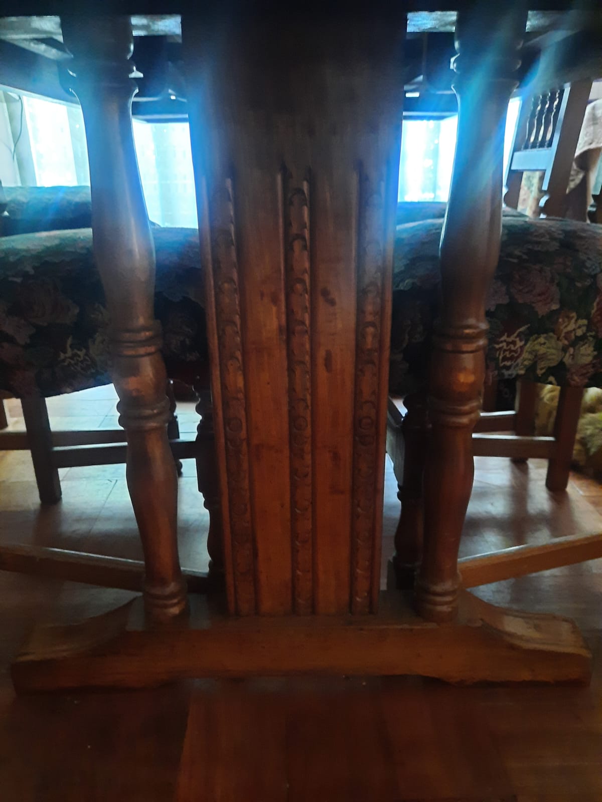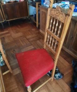 Detalle en asiento de sillas, son 6 iguales y 2 diferentes. cubierta de mesa con manchas
