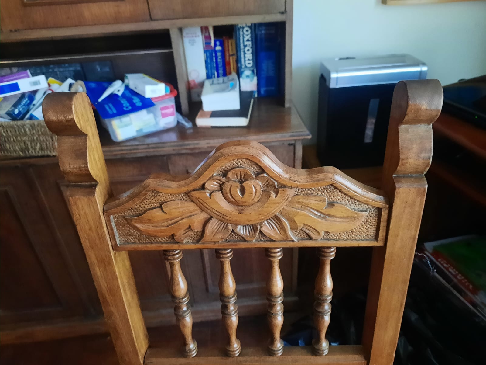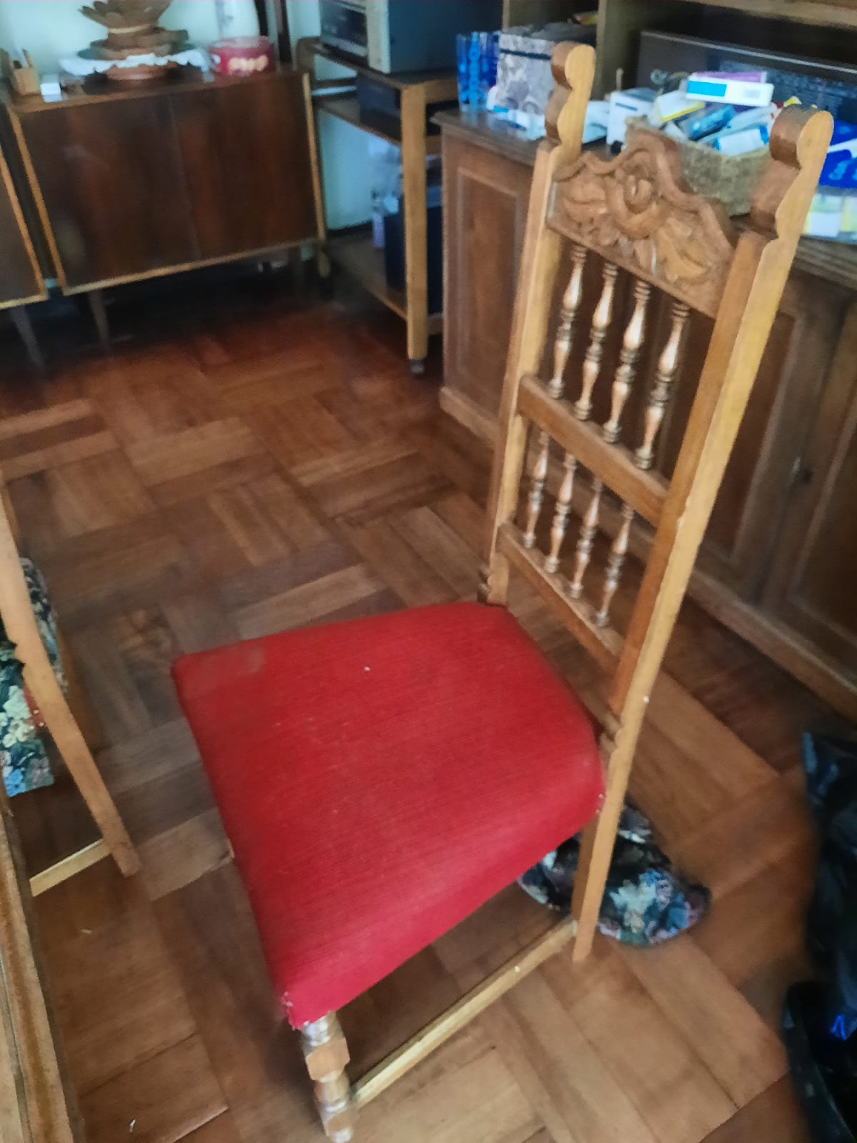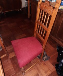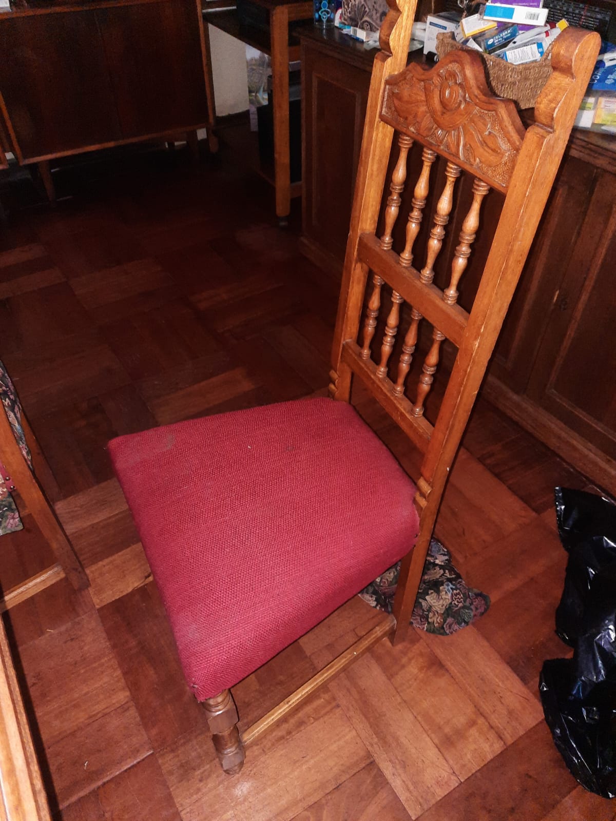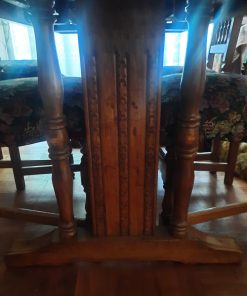 Detalle en asiento de sillas, son 6 iguales y 2 diferentes. cubierta de mesa con manchas