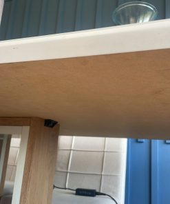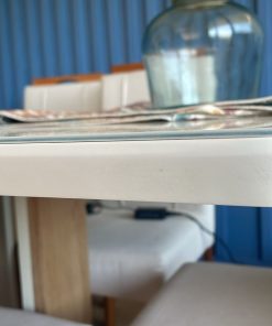 Detalle de silla con saltadura, cubierta de madera con sobrecubierta de vidrio biselado