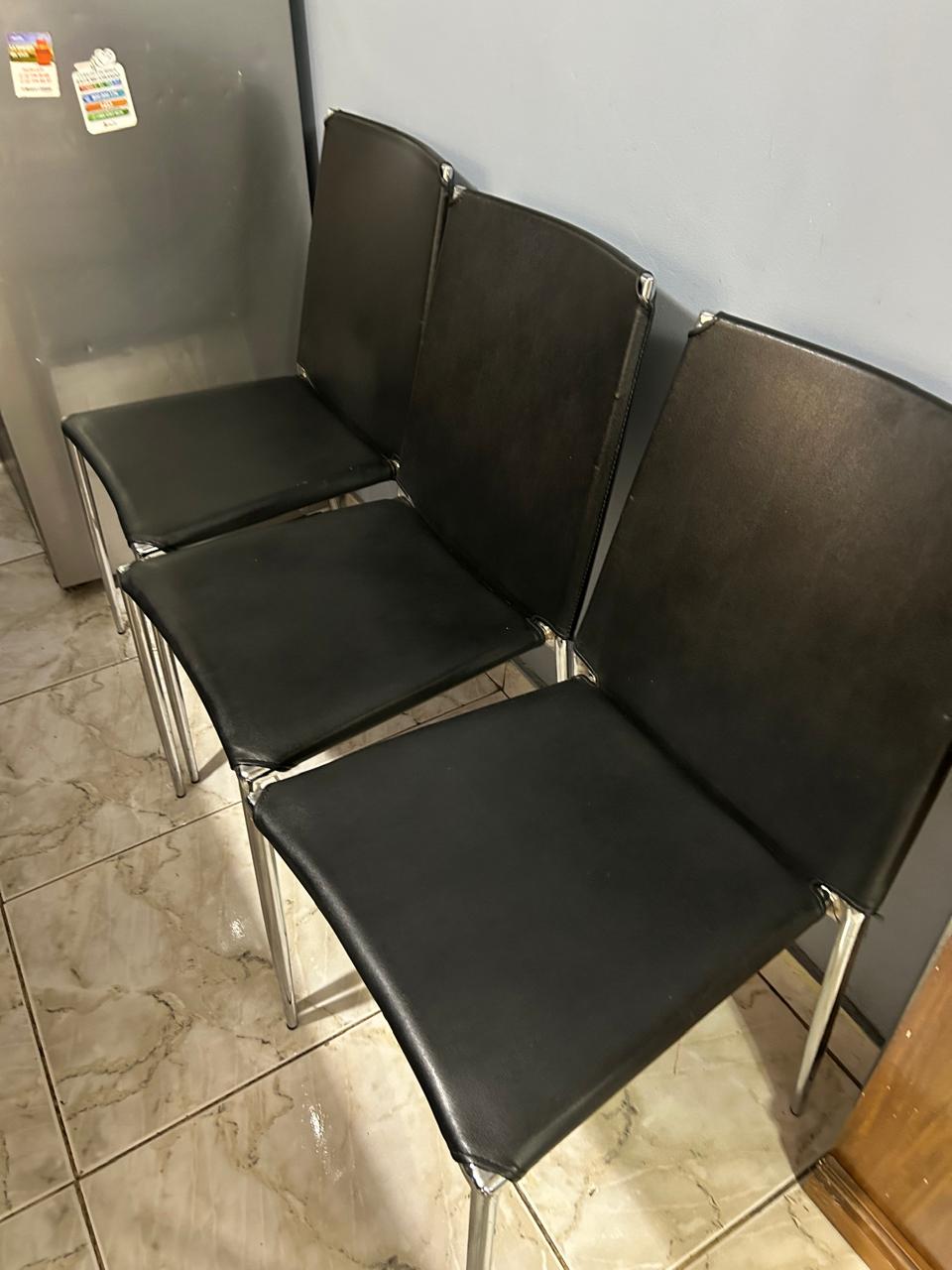 4 años uso, buen estado, leve trizadura en un costado poco notoria. Tapiz sillas cuerina negro.