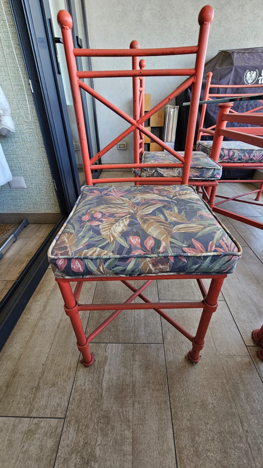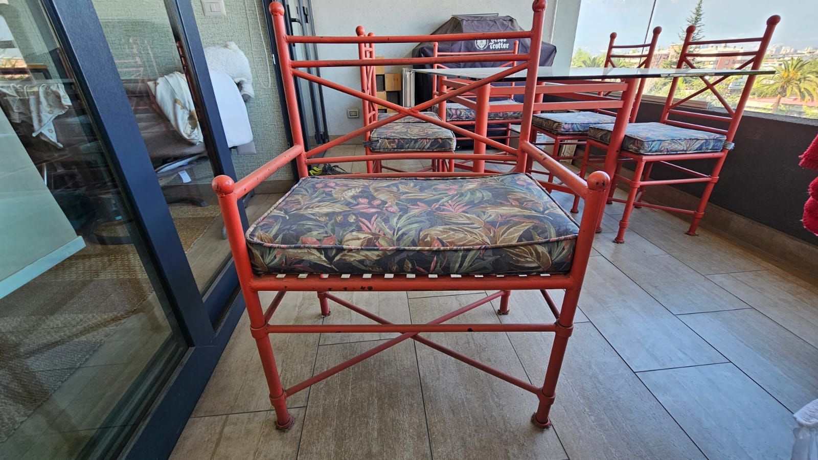 Detalles en pintura, vidrio grosor 15 mm, son 6 sillas y 2 banquetas