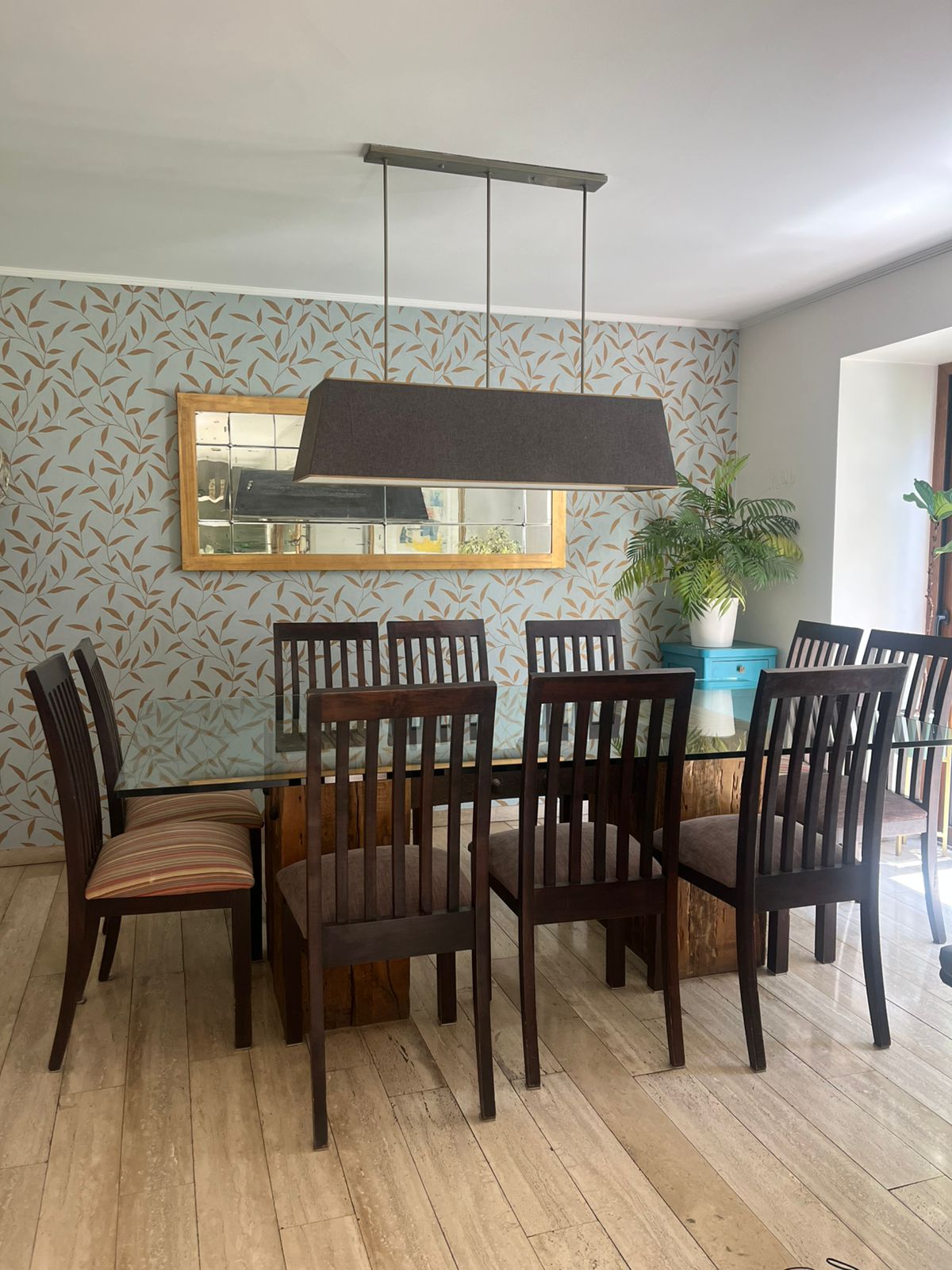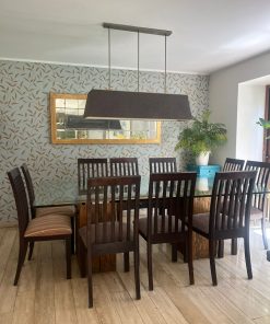 Juego de comedor vidrio templado madera y fierro con 12 sillas
