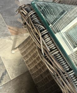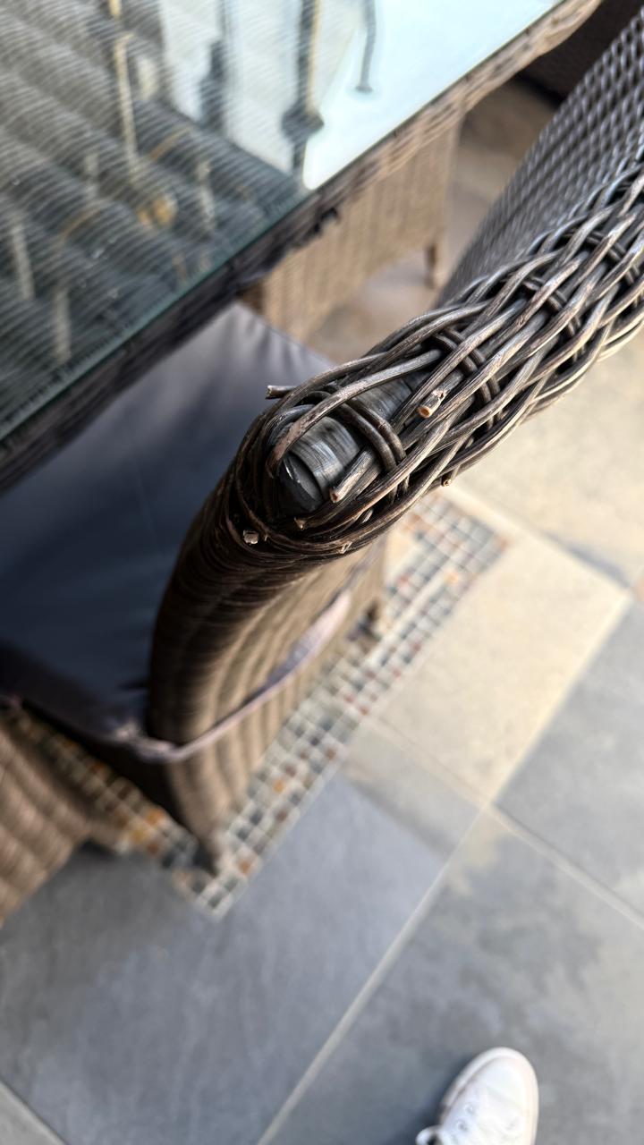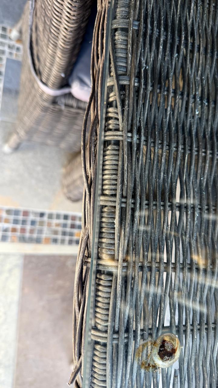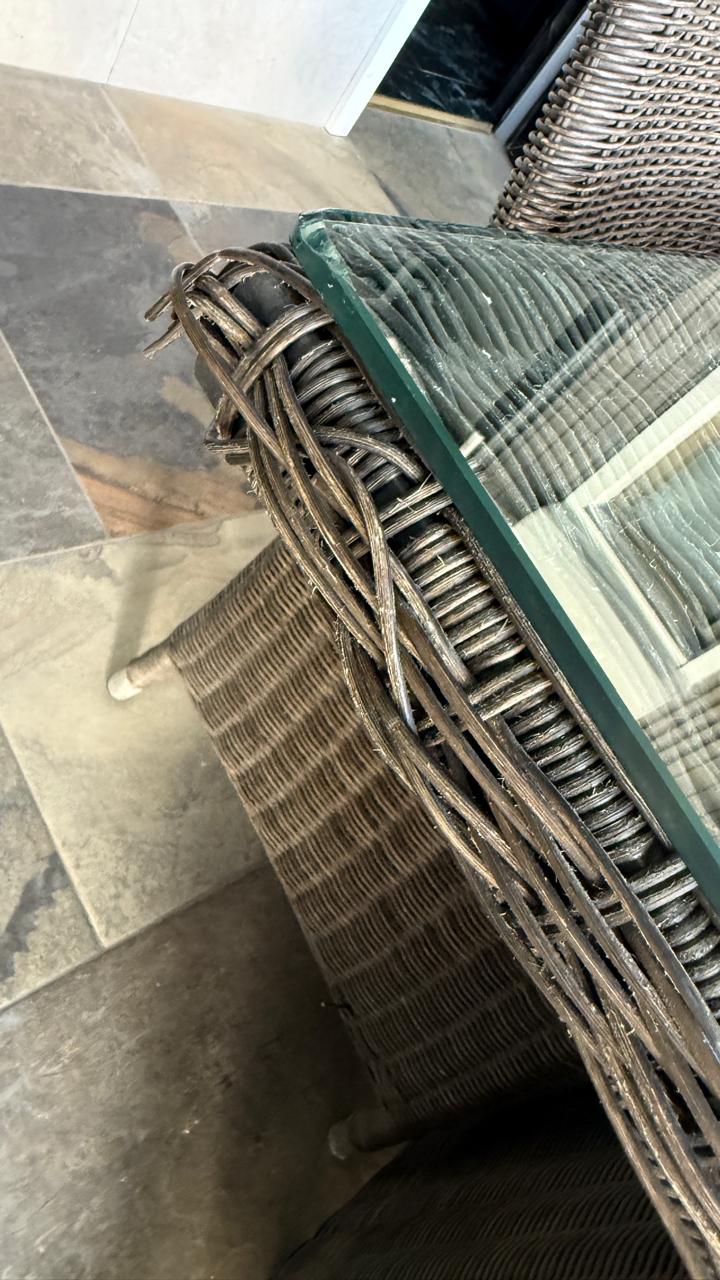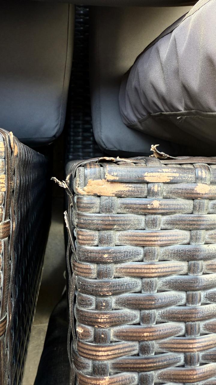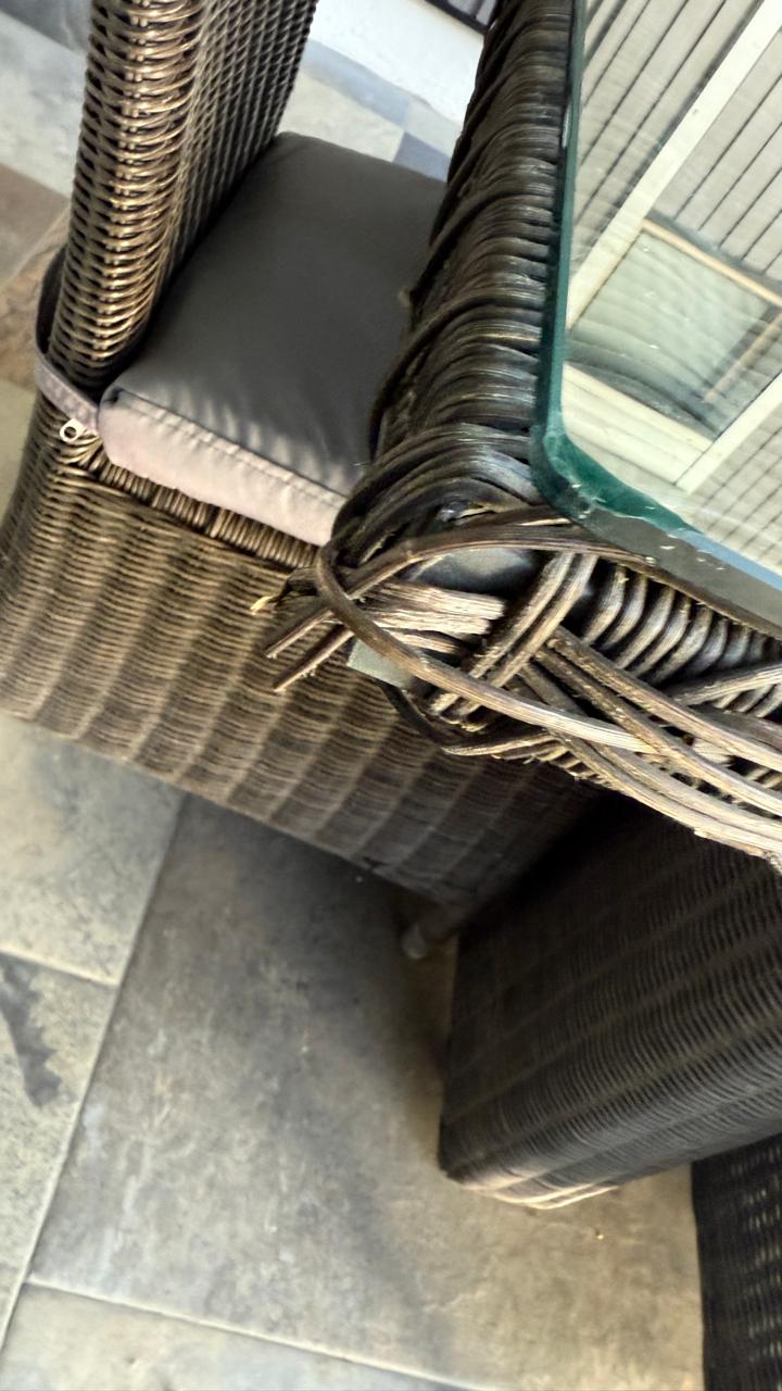 Detalle en mesa de comedor con rattan suelto, detalles en algunas sillas con orillas gastadas y requiere mano de pintura, sillón con detalles de pintura y cojines descoloridos