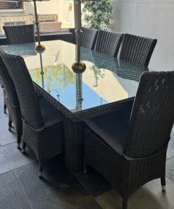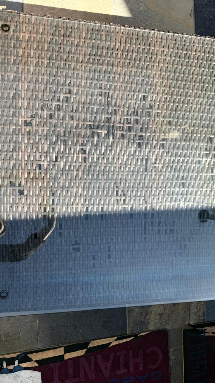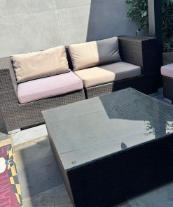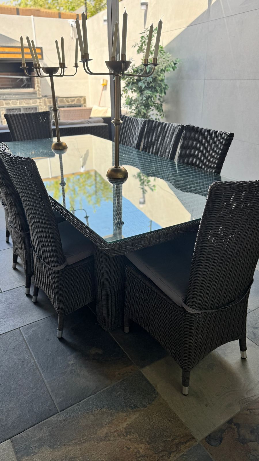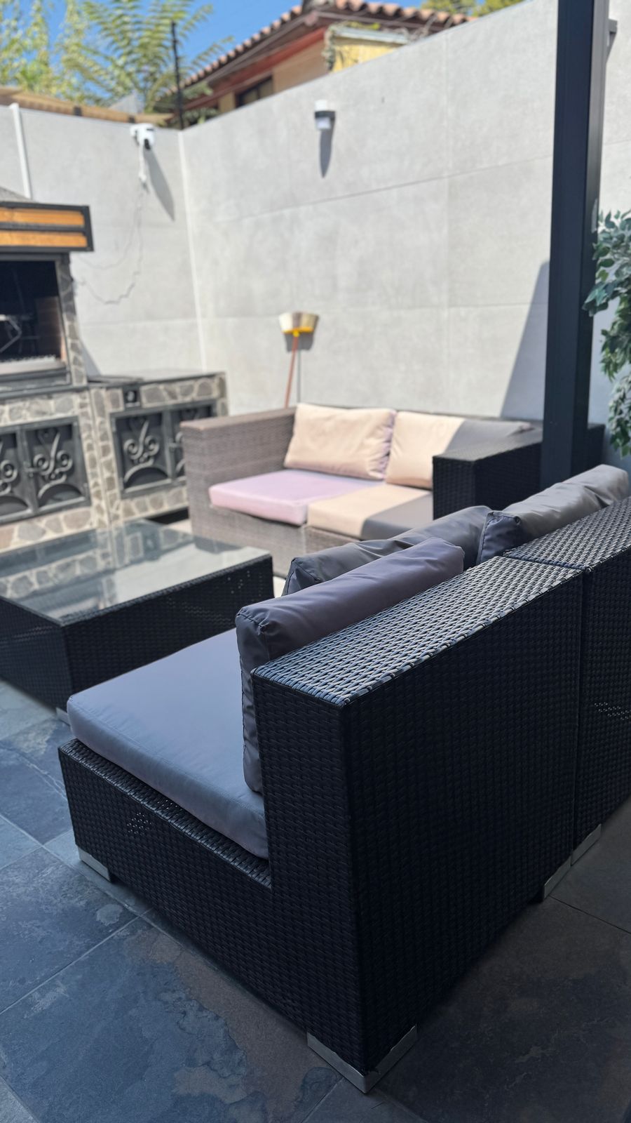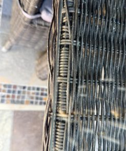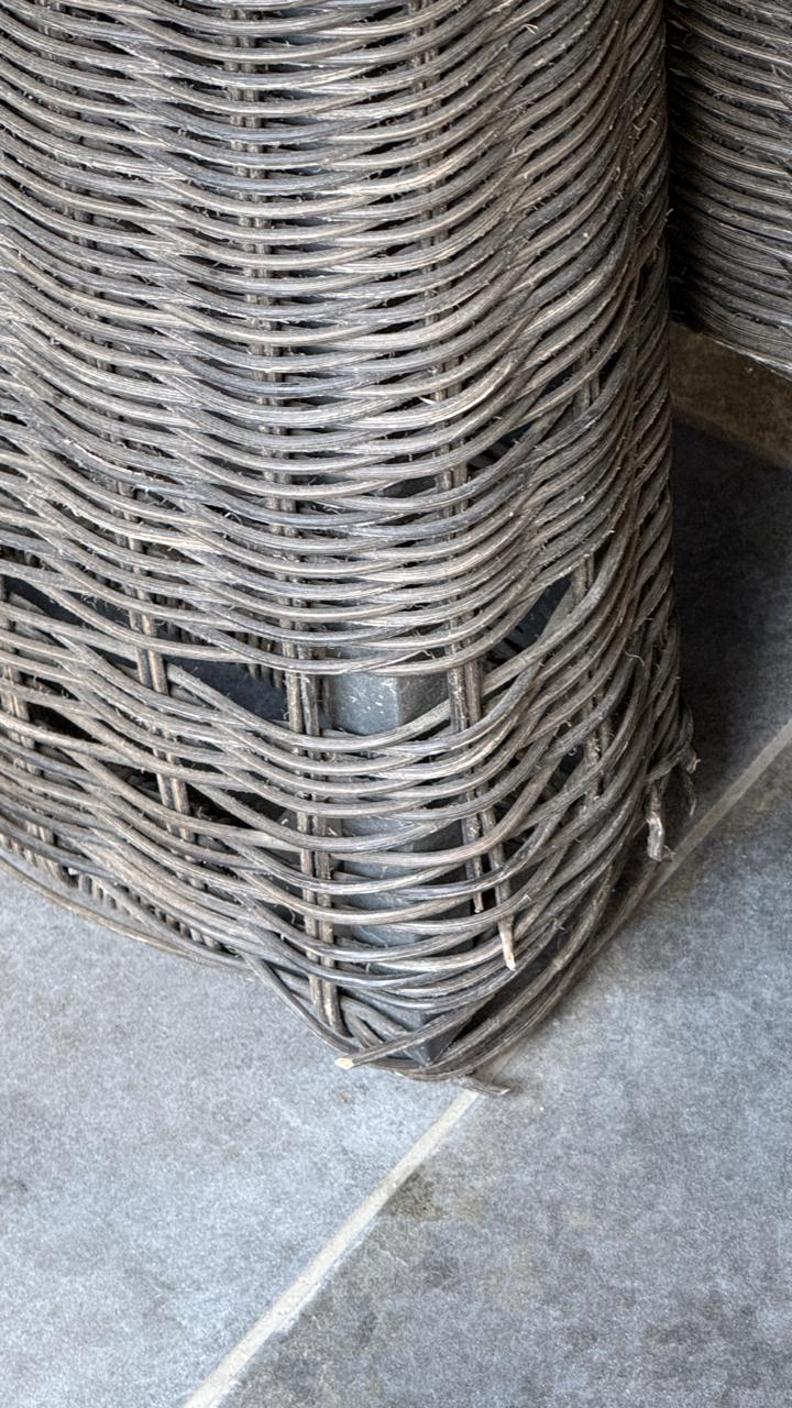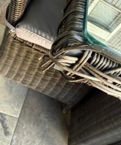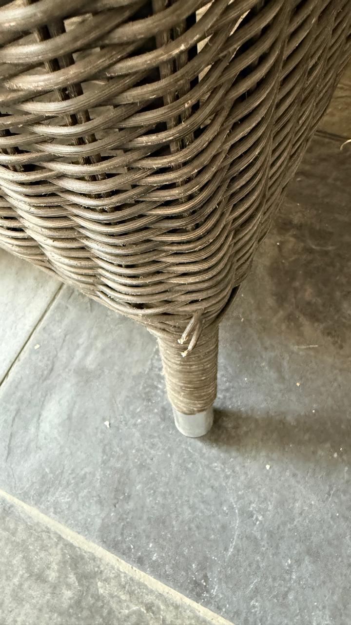 Detalle en mesa de comedor con rattan suelto, detalles en algunas sillas con orillas gastadas y requiere mano de pintura, sillón con detalles de pintura y cojines descoloridos