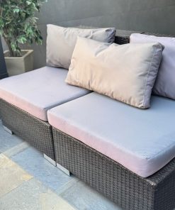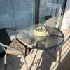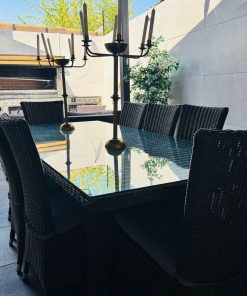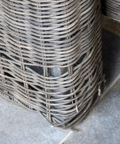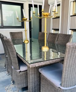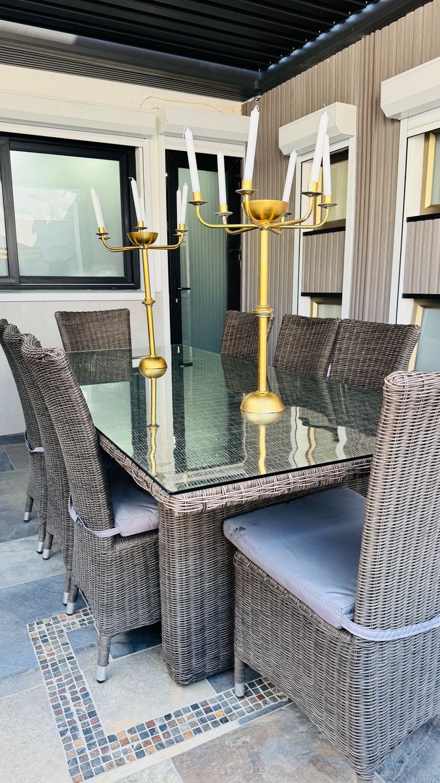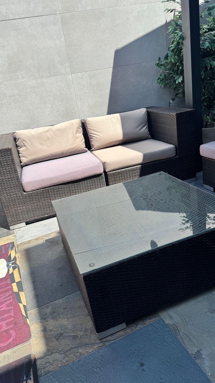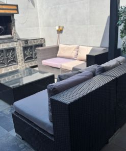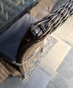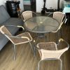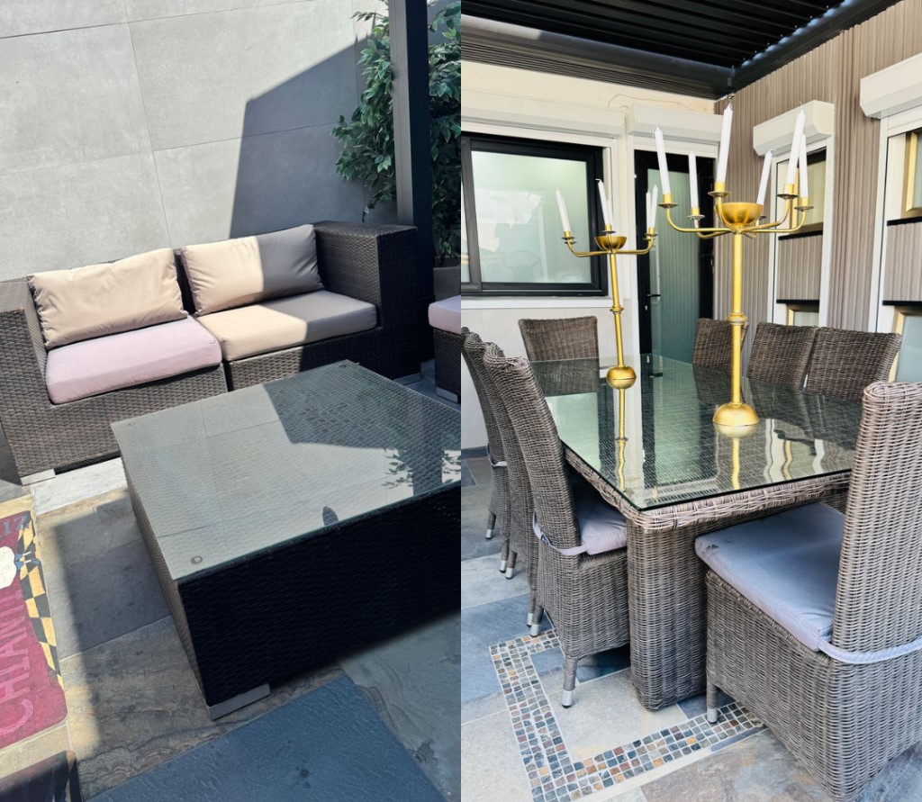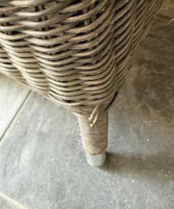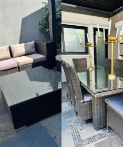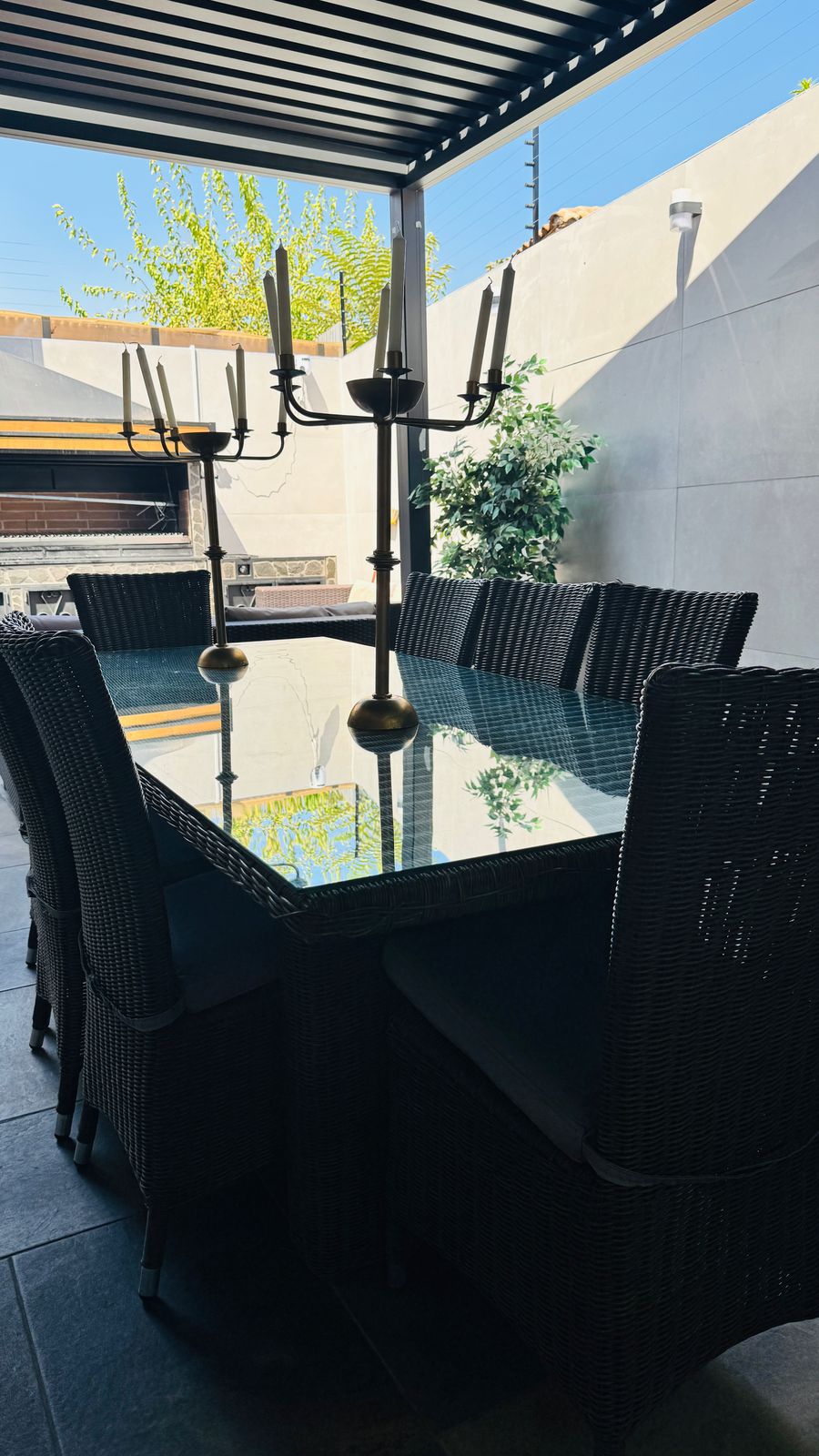 Detalle en mesa de comedor con rattan suelto, detalles en algunas sillas con orillas gastadas y requiere mano de pintura, sillón con detalles de pintura y cojines descoloridos