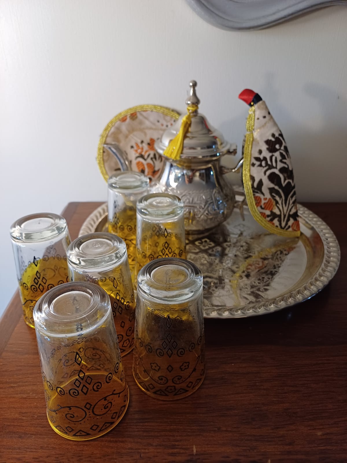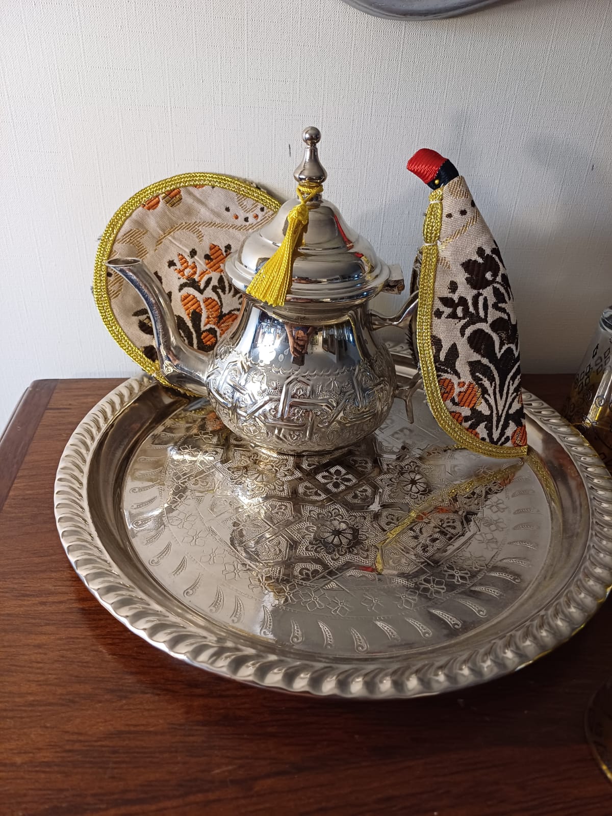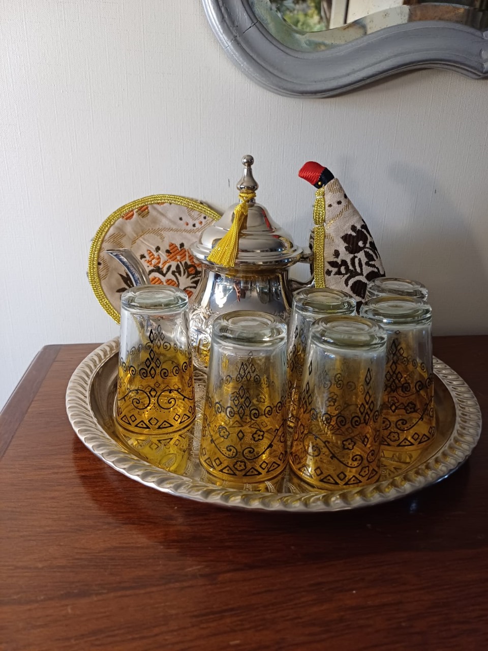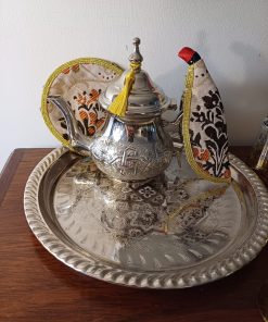 Medidas tetera 23 x 18 cm, vasos 9 cm alto y bandeja 29 cm Diam