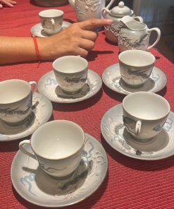 Incluye 6 tazas y 6 platos de té, azucarero, cremero y tetera