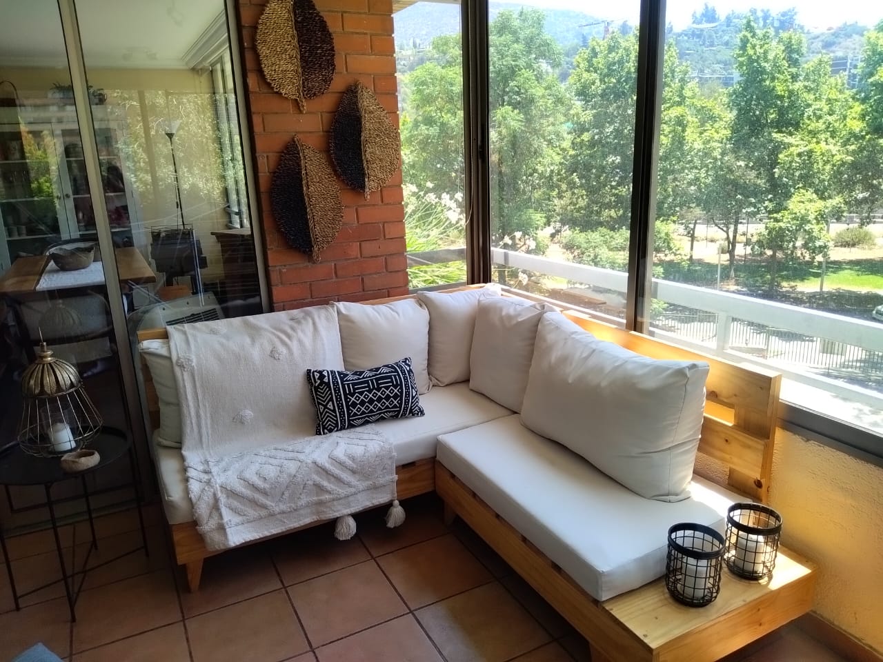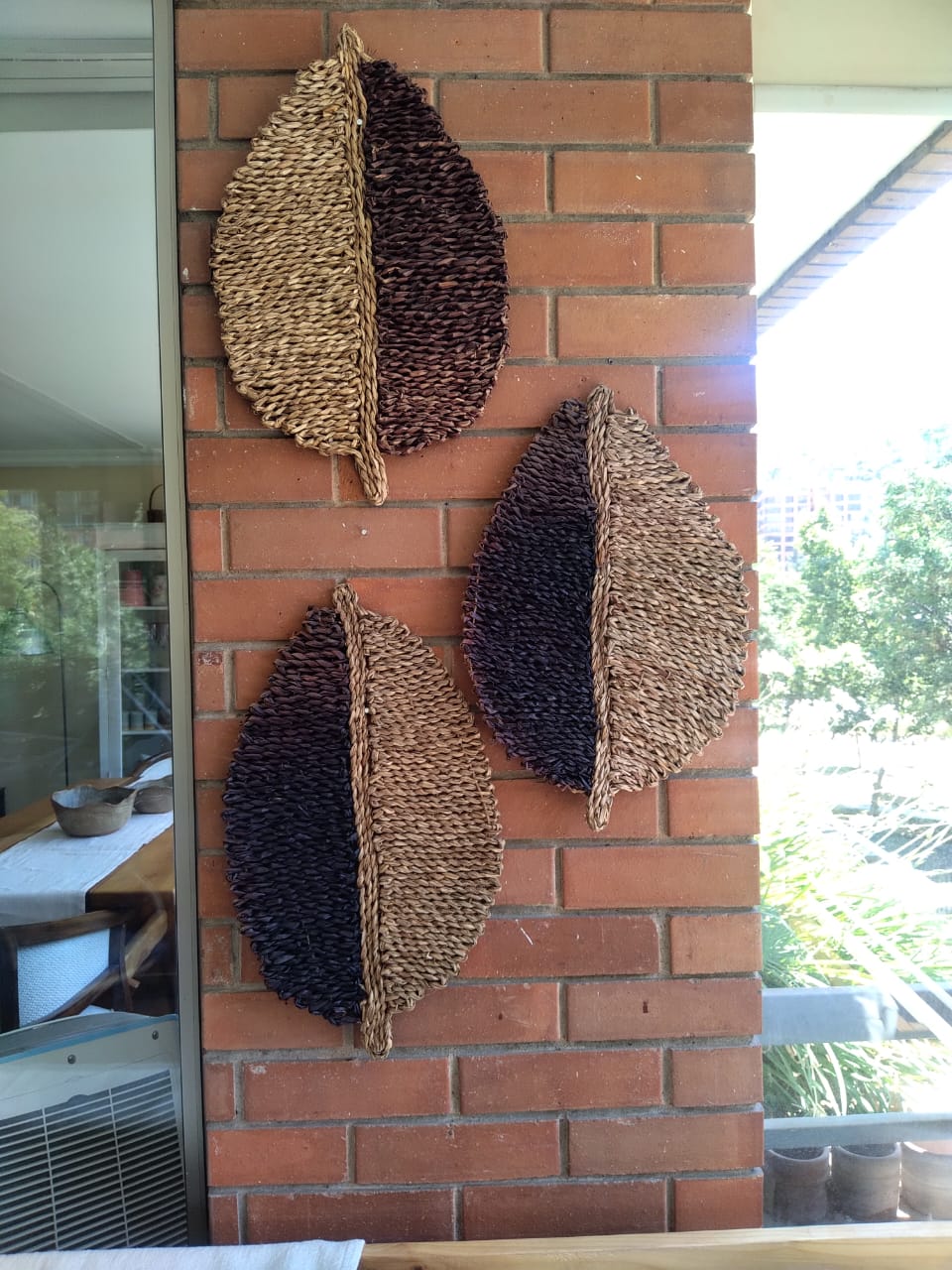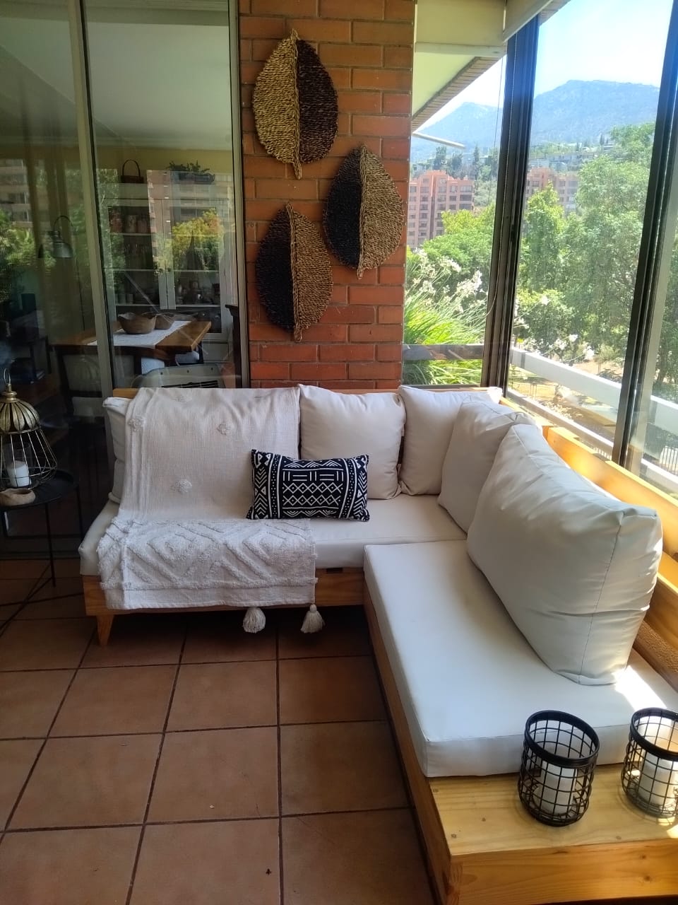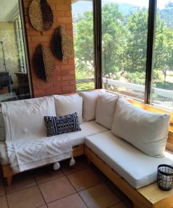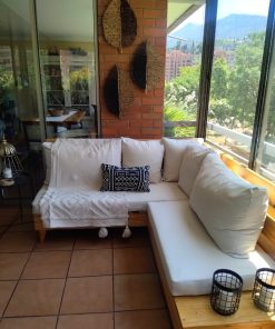 Incluye sofá seccional, mesa lateral negra, fanales dorados, porta-velas, chal, cojín y adornos pared hojas