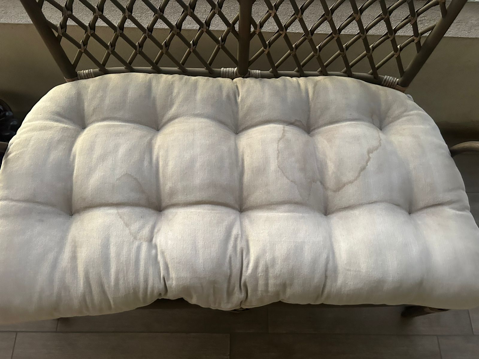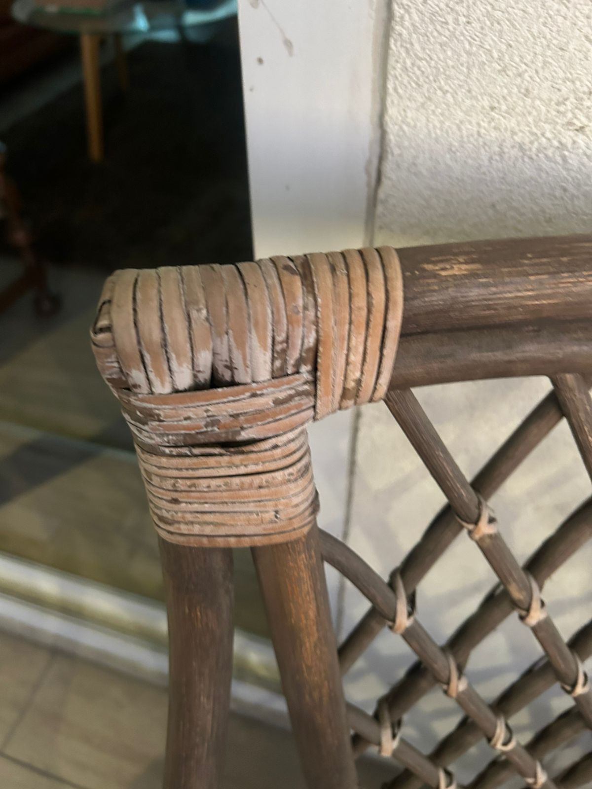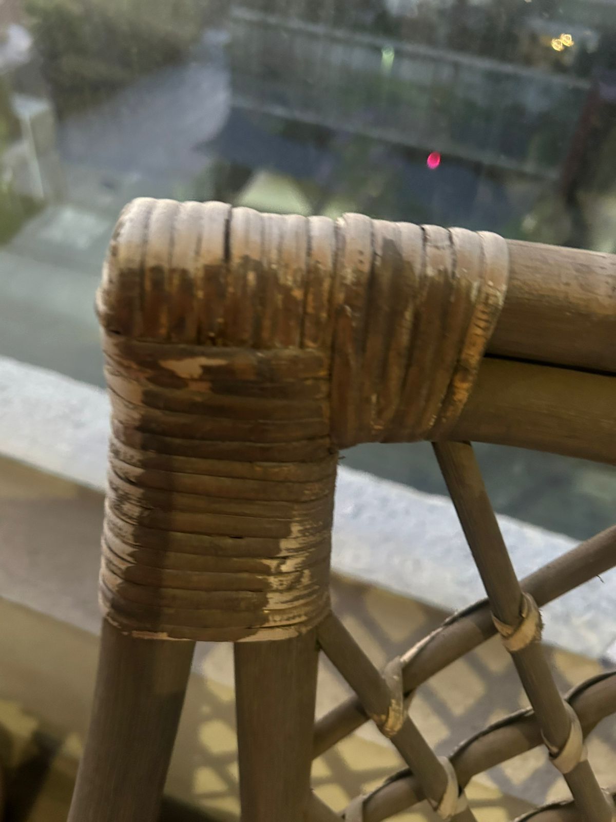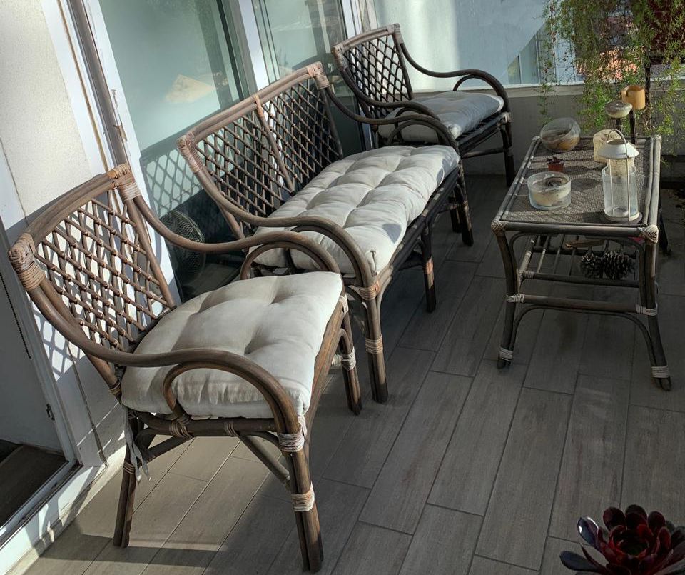 Buen estado, usados 5 años, detalle de desgaste en cojines (manchas y roturas), muebles para repintar, detalle de manchas en mesa