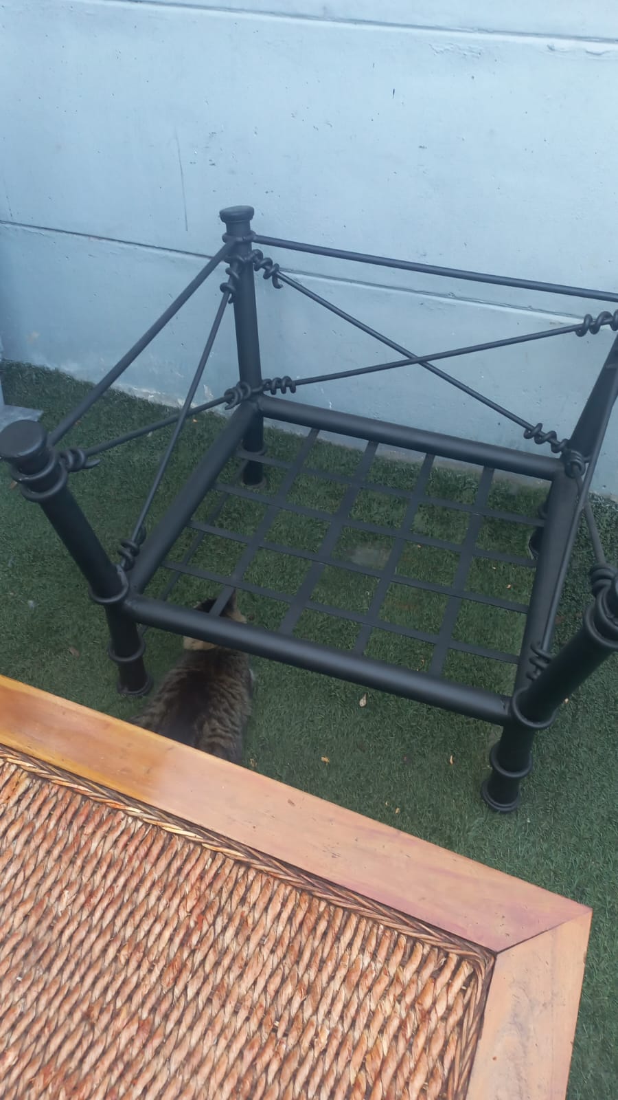 Fundas de cojines con flores, mesa de centro restaurada, vidrio se quebró