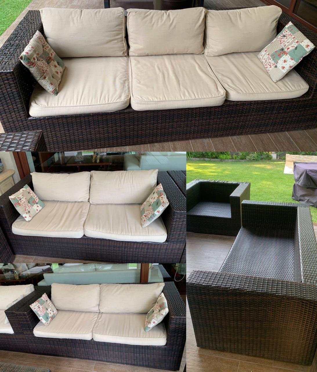 Incluye 2 sillones, 2 sofás 2 cuerpos y 2 sofás 3 cuerpos. Buen estado general, incluye espumas y fundas. No incluye cojines decorativos.