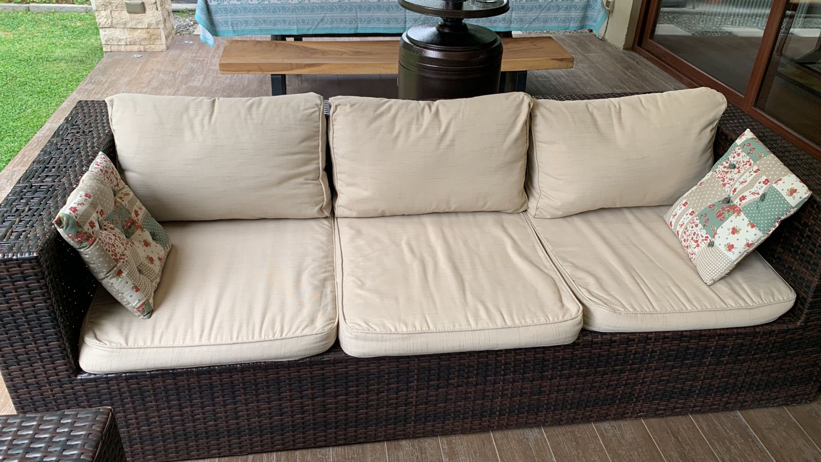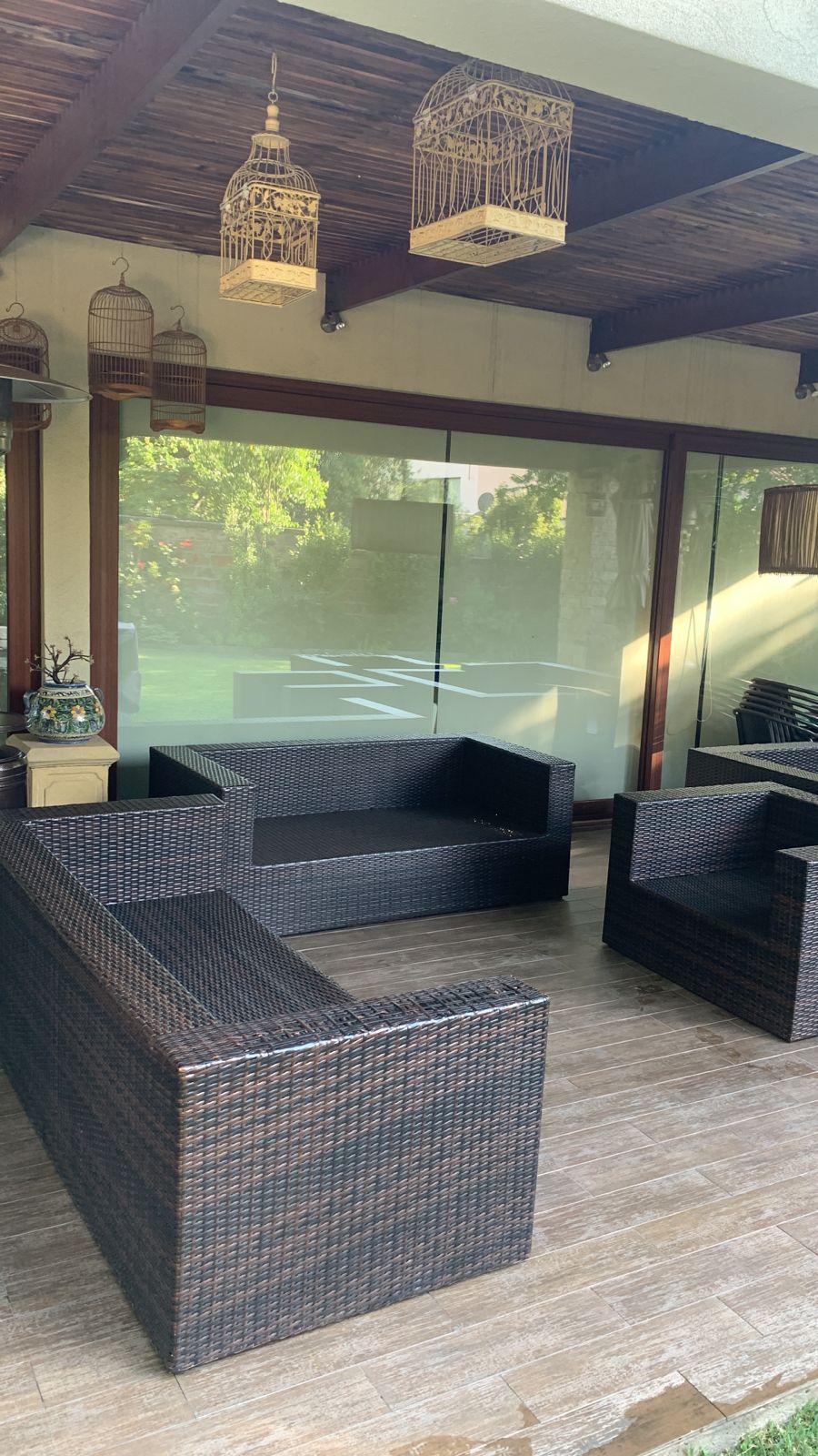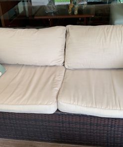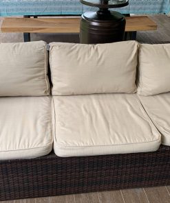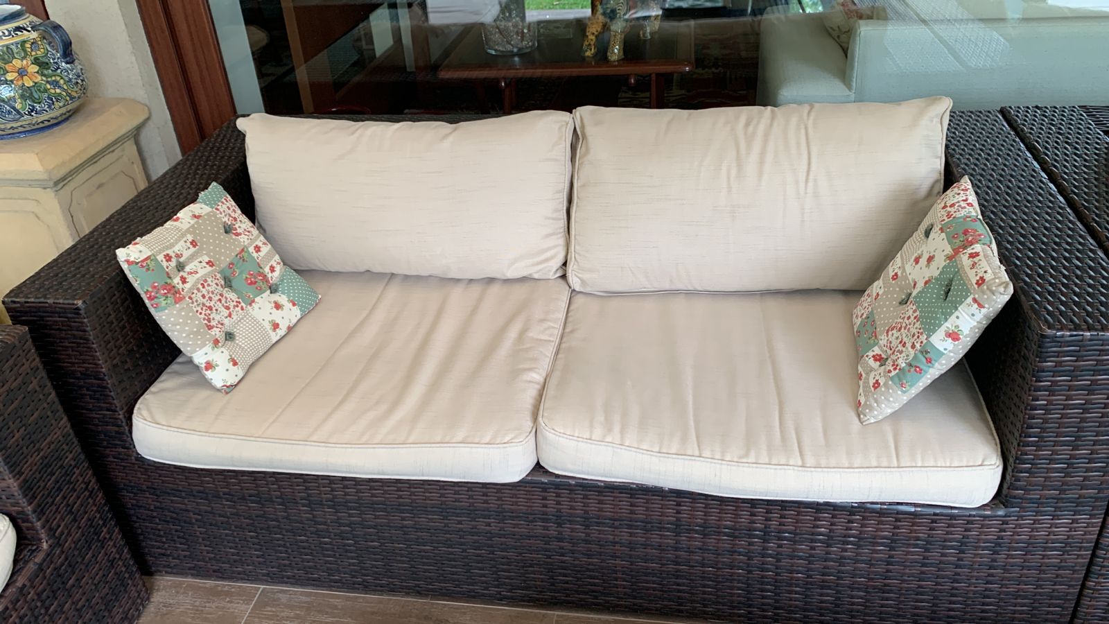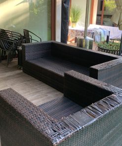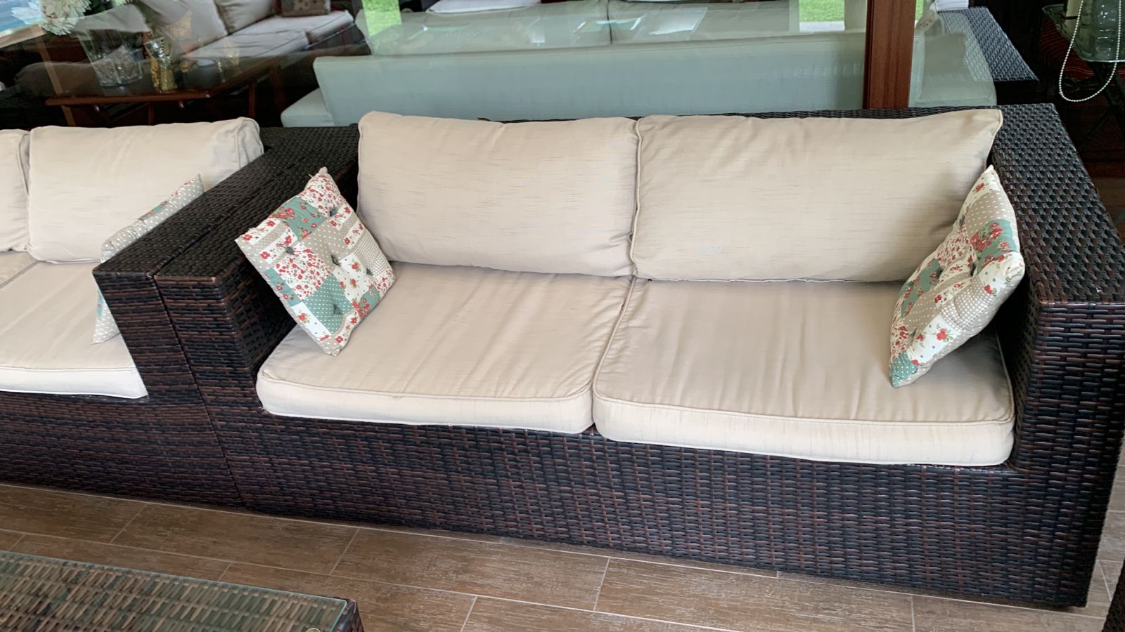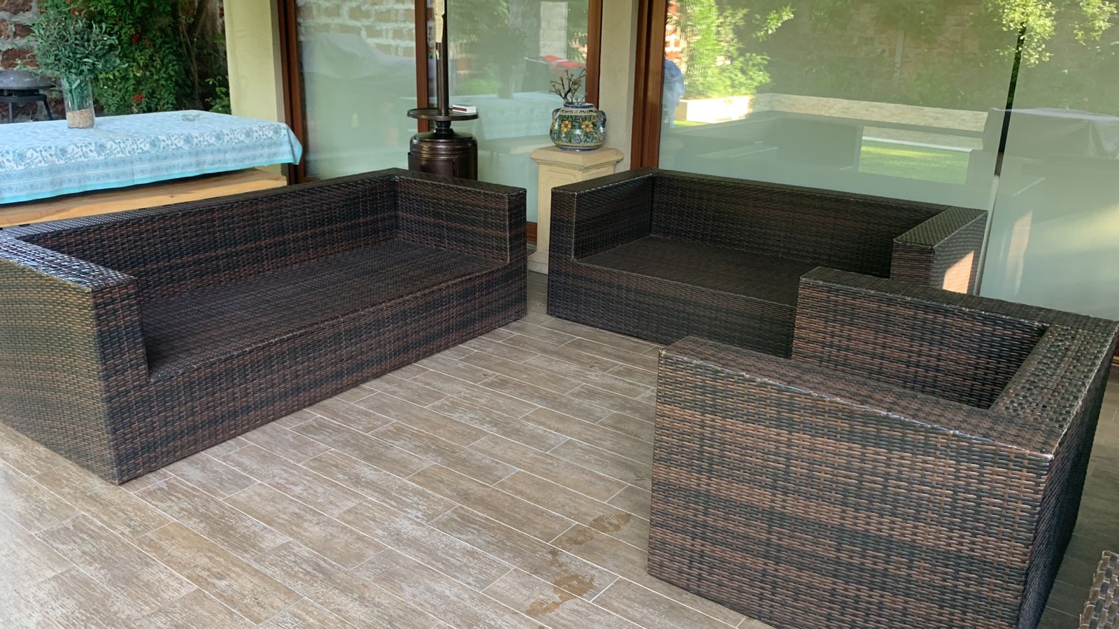 Los sillones individuales tienen roto el rattan en algunas partes, no afecta uso, detalle en brazo de sofá 3 cuerpos