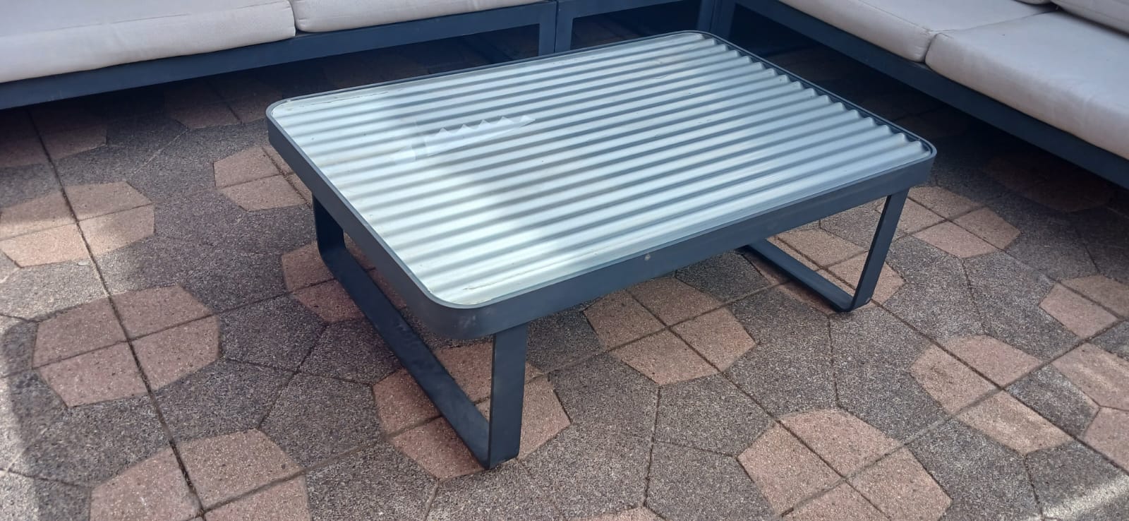 Material aluminio, incluye cojines, 2 Sillones, 2 sofá y mesa de centro