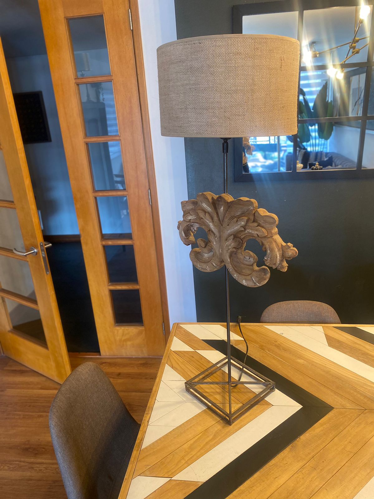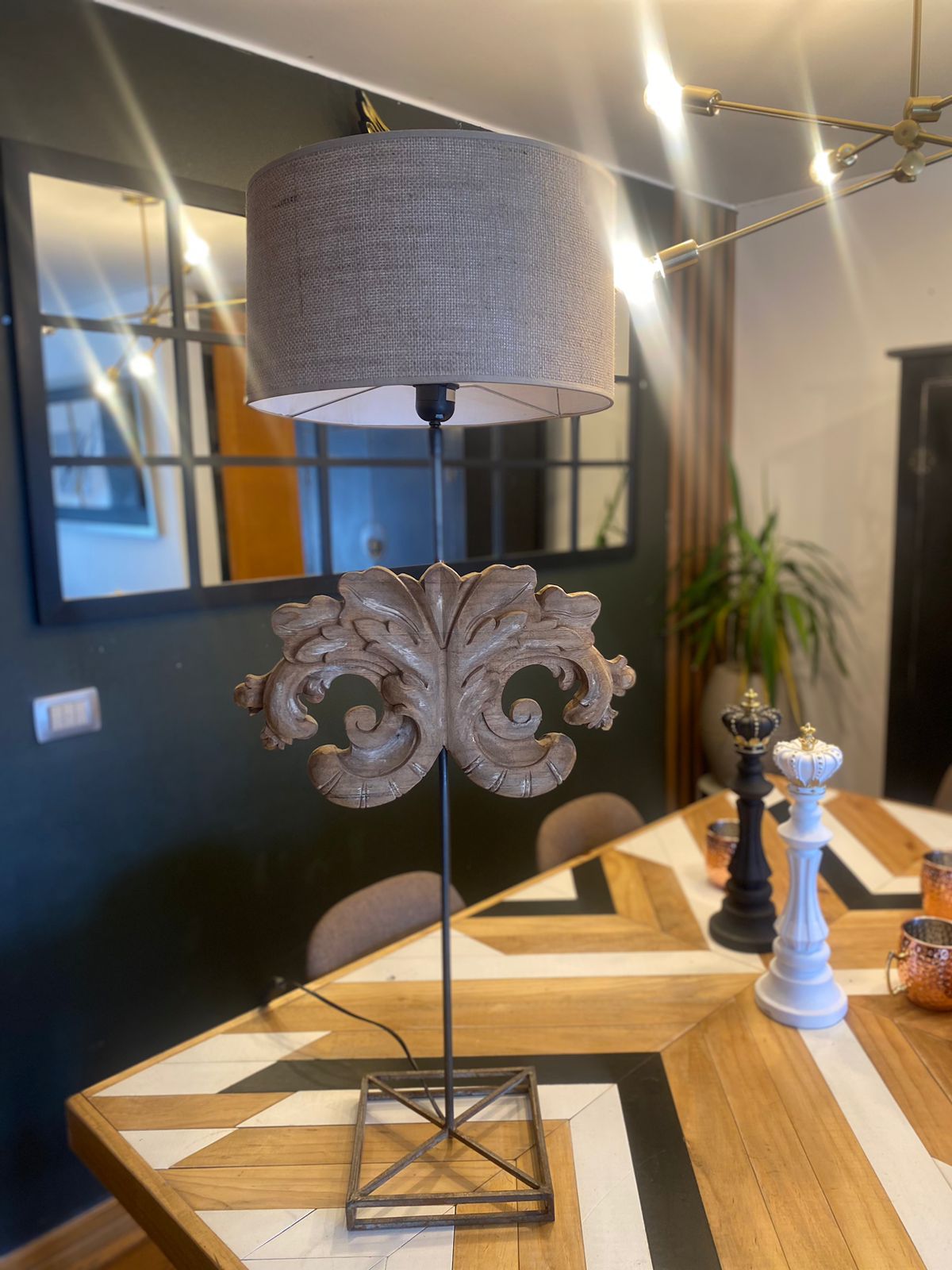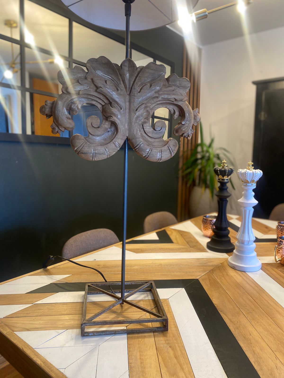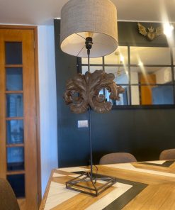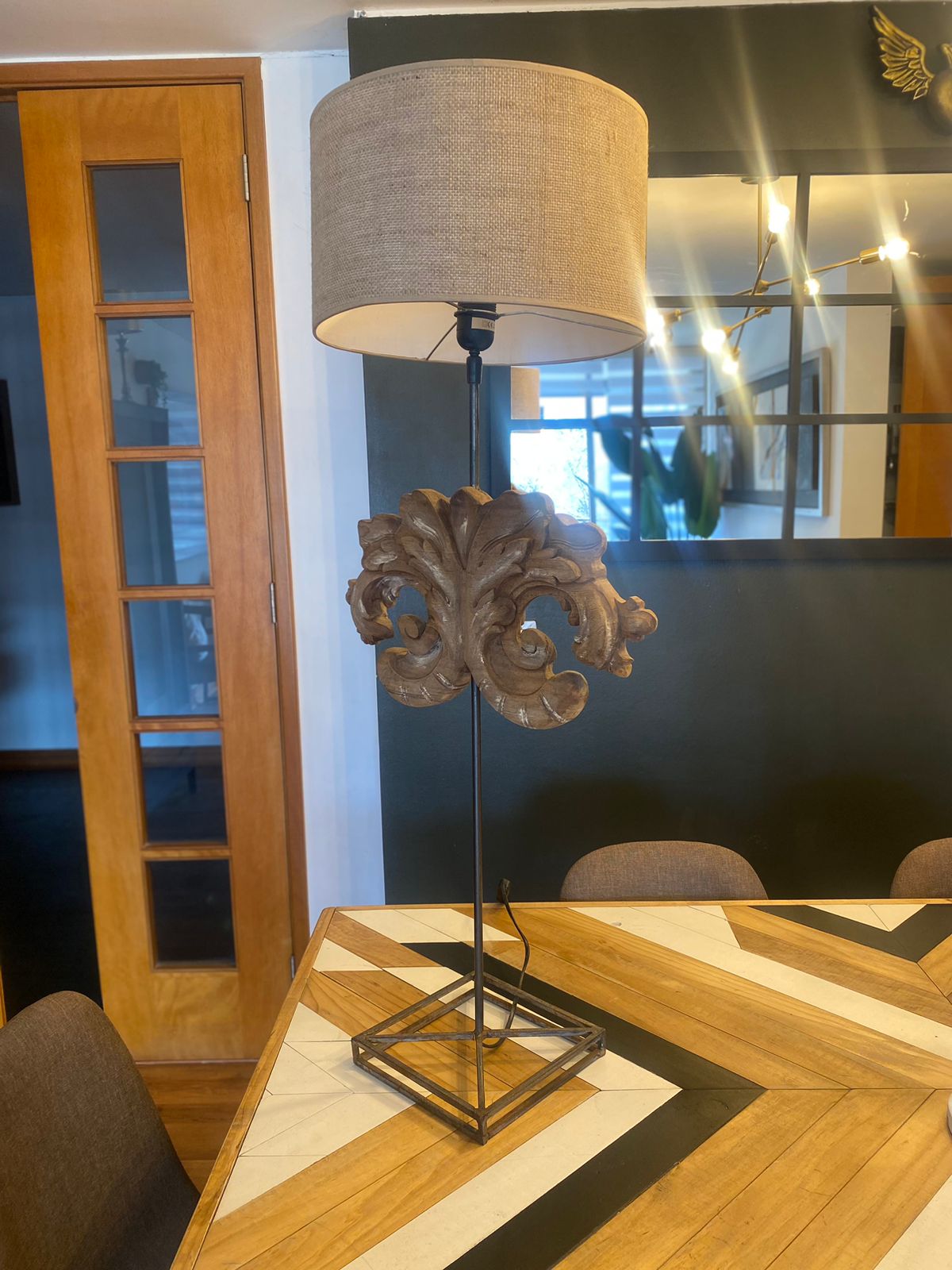 Material fierro forjado con madera tallada y pantalla de fibra natural