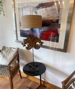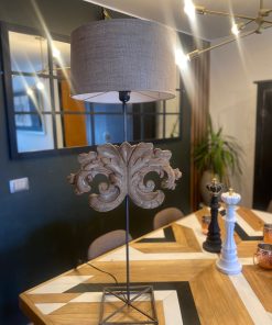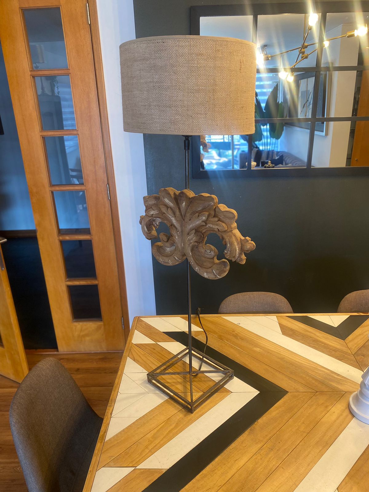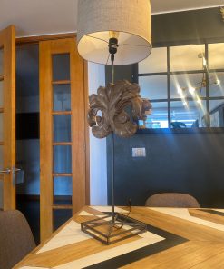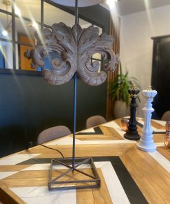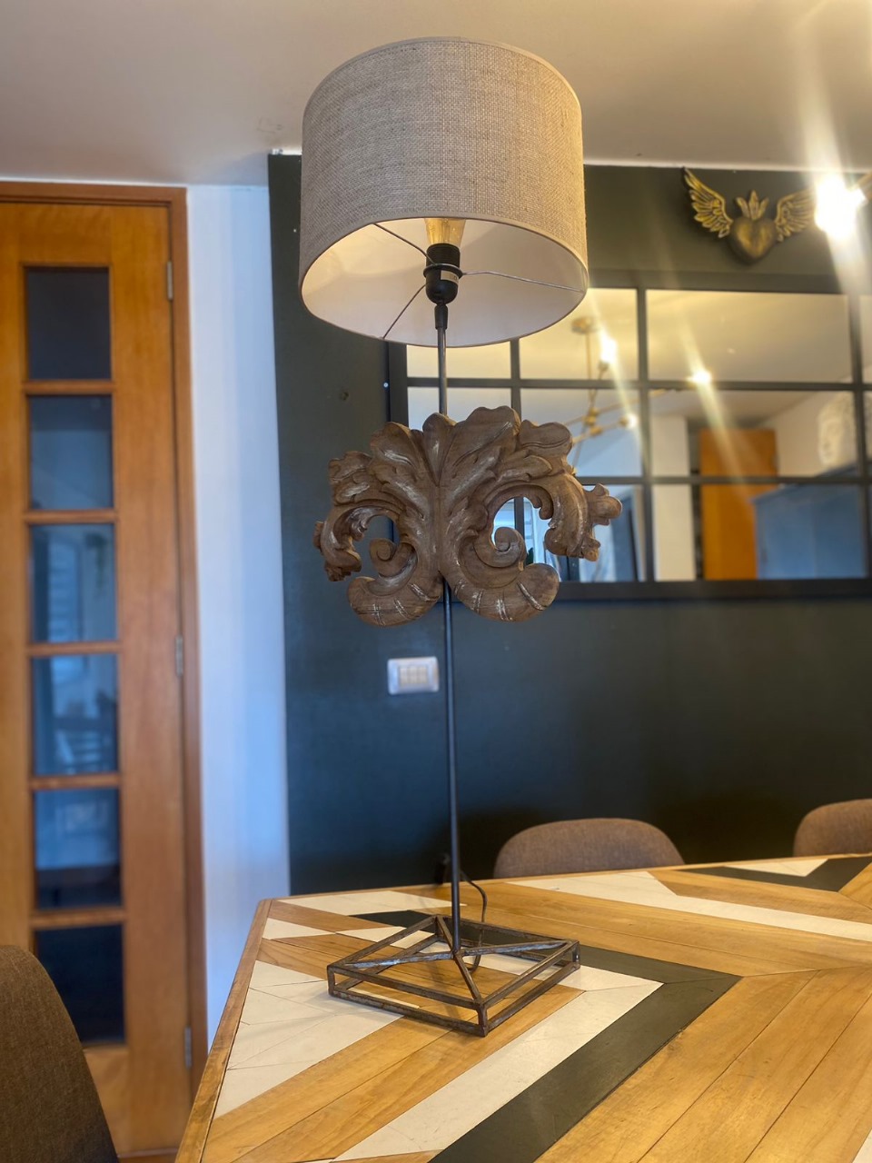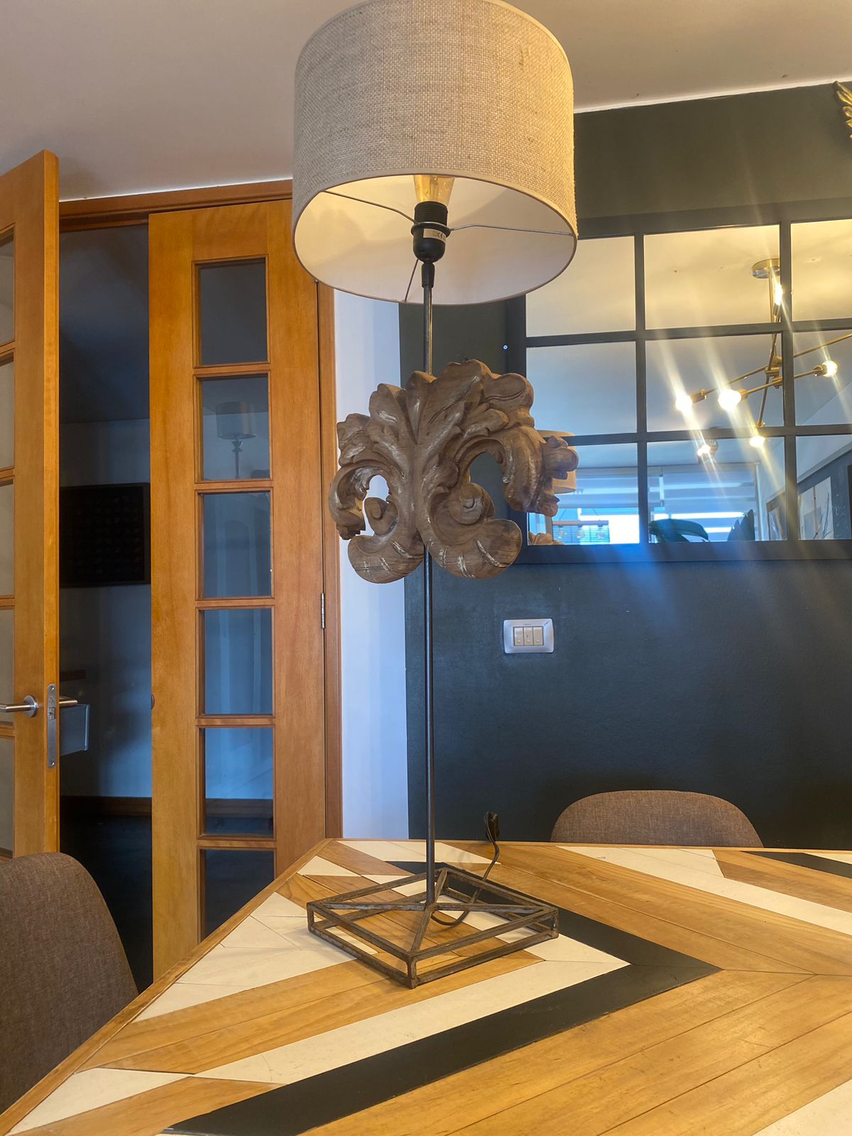Material fierro forjado con madera tallada y pantalla de fibra natural