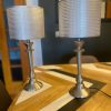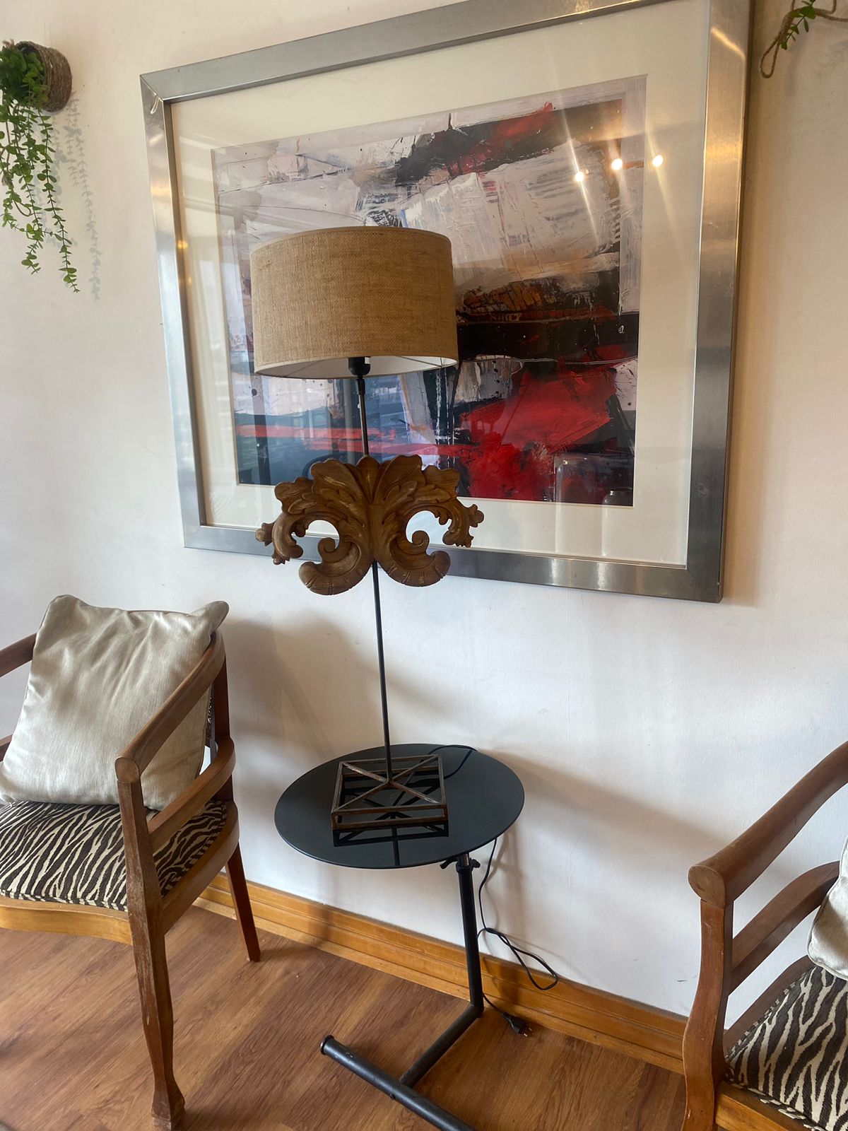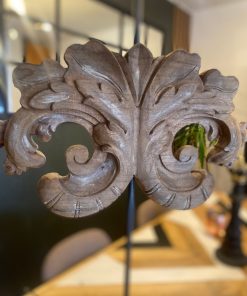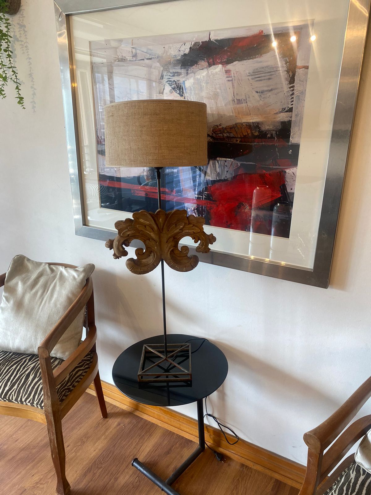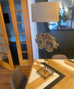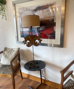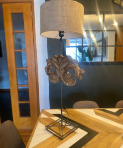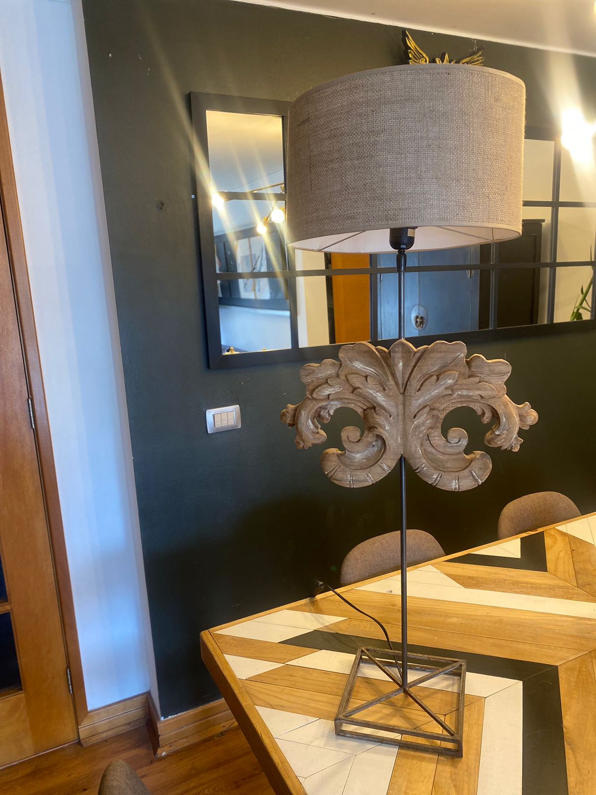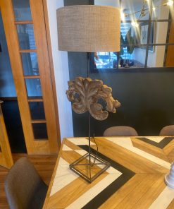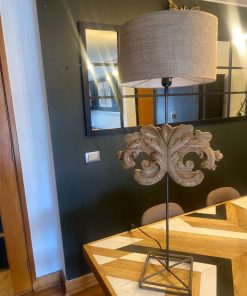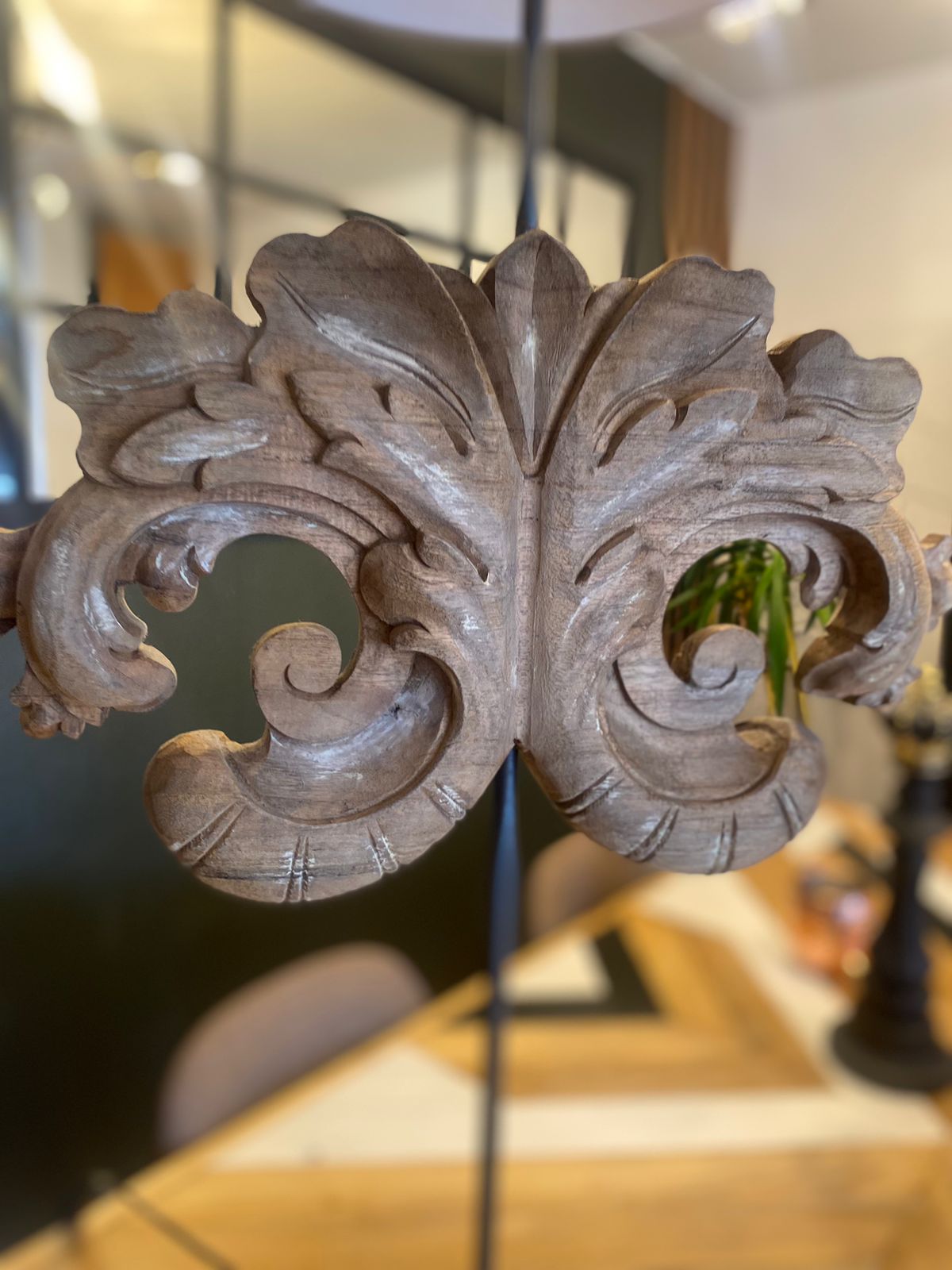 Material fierro forjado con madera tallada y pantalla de fibra natural
