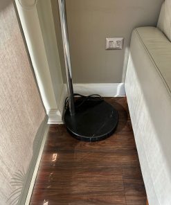 Base de mármol, estructura de acero lacado y pantalla de circular de tela negra