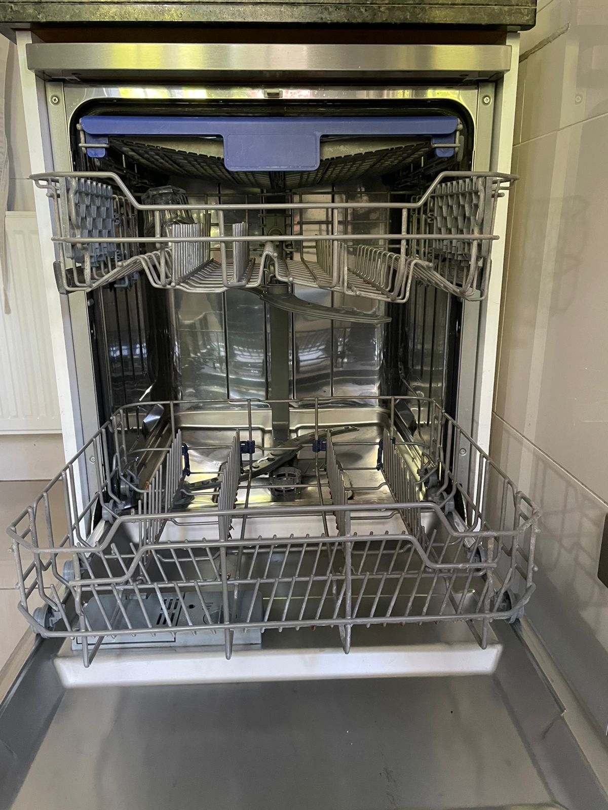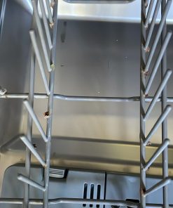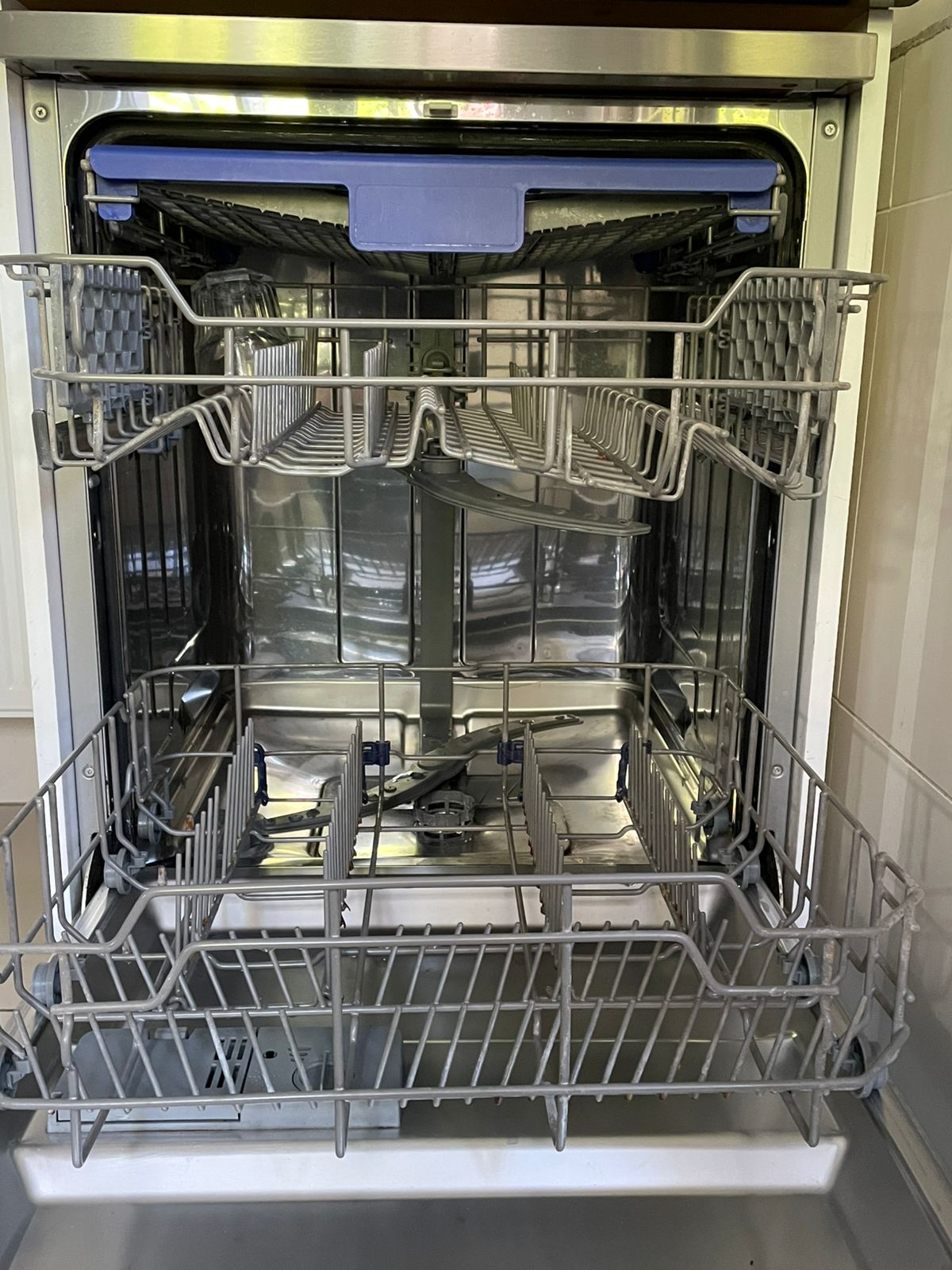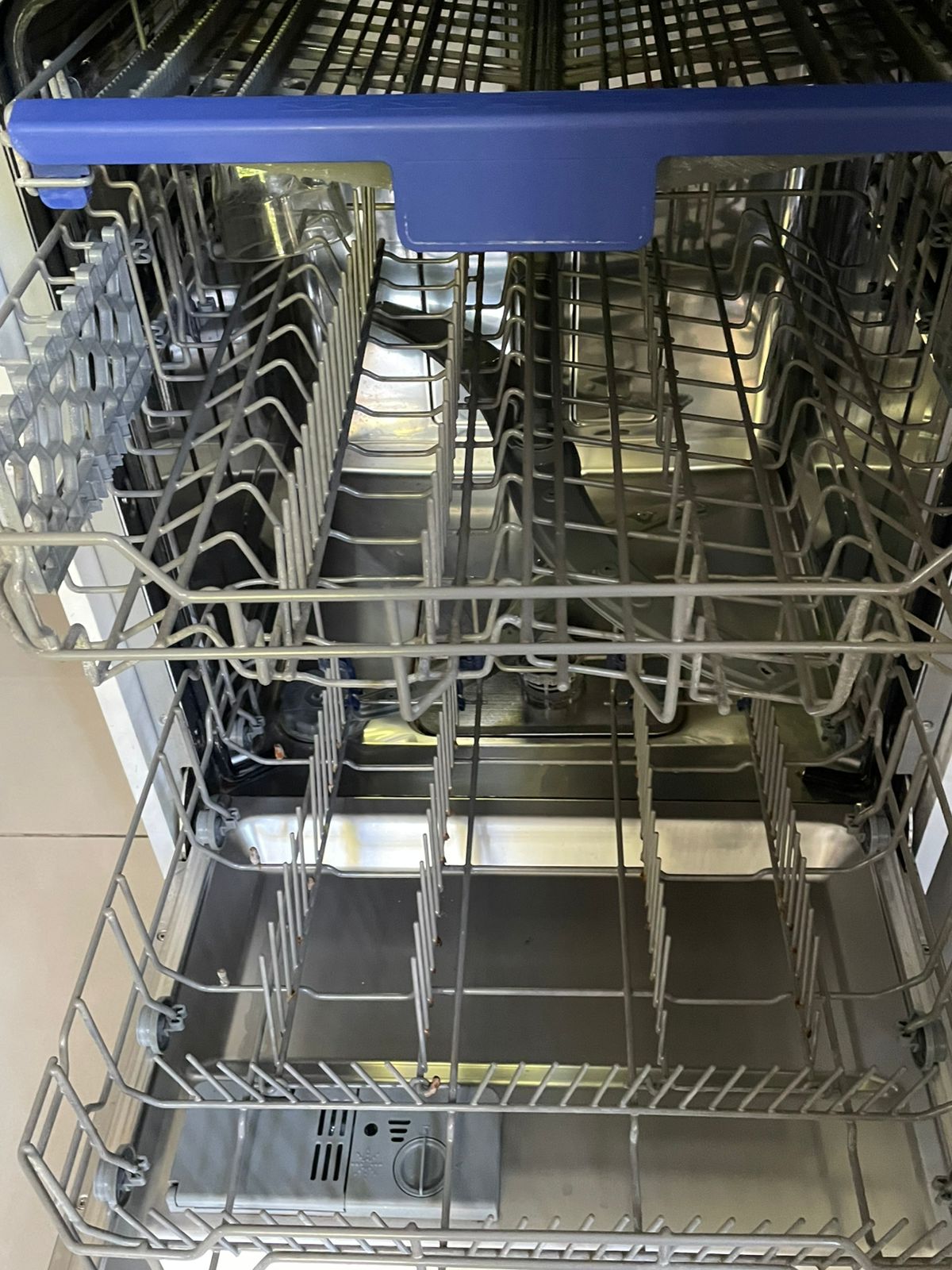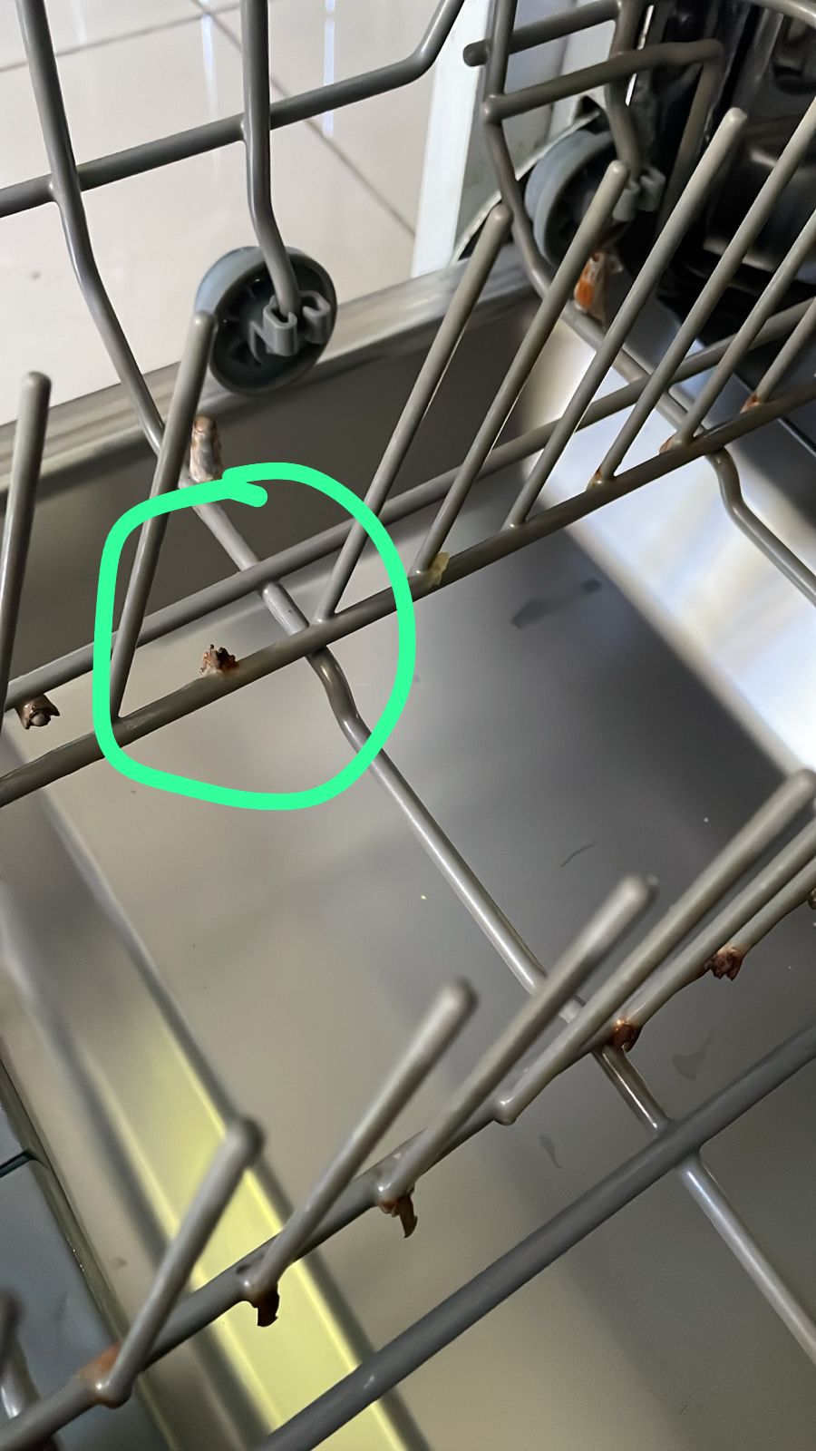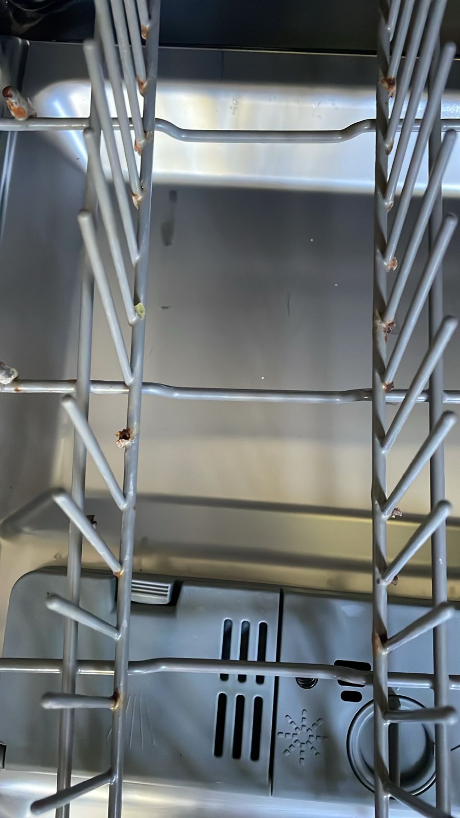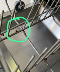 Detalle de canasto inferior con patita para platos rota y un poco de oxido