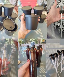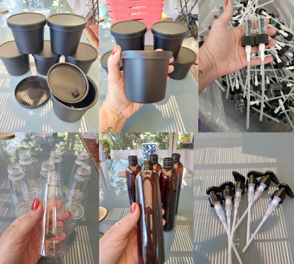 Incluye: 150 envases Lush negros con doble tapa rosca de 200 gr, 50 envases Lush negros de 100 gr, 150 envases pet transparentes 120 ml, 170 botellas ámbar pet de 220 ml, 320 difusores con tapa, 130 atomizadores para crema
