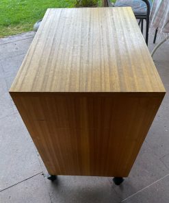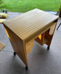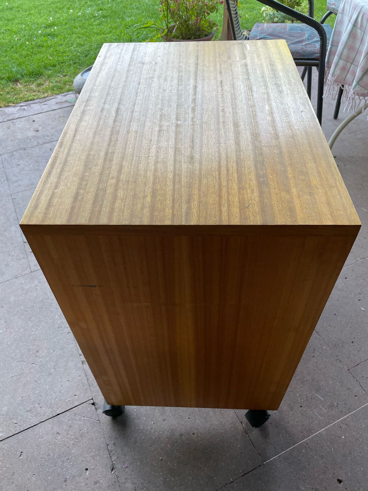 Tiene ruedas en base, compartimiento para computador de escritorio y para teclado