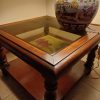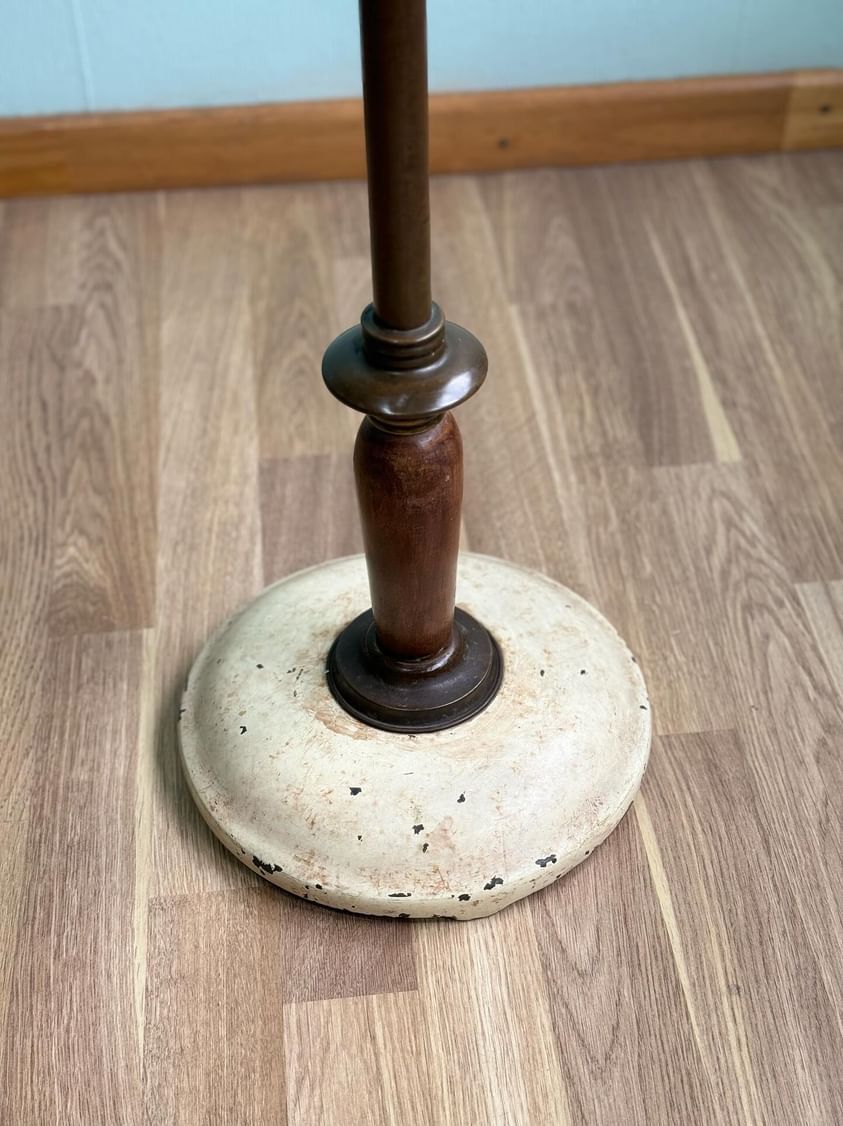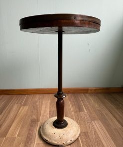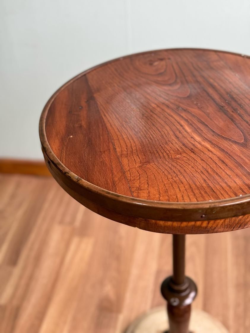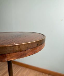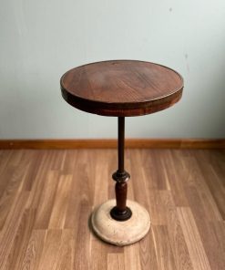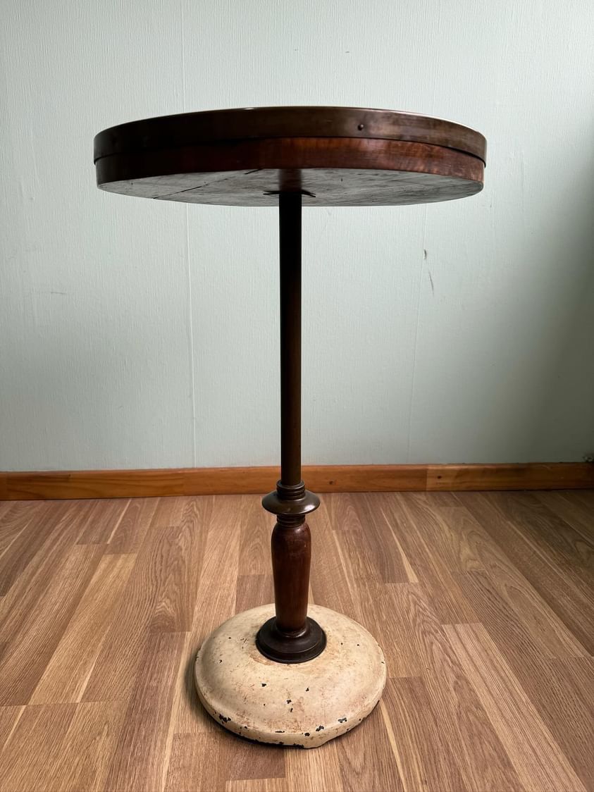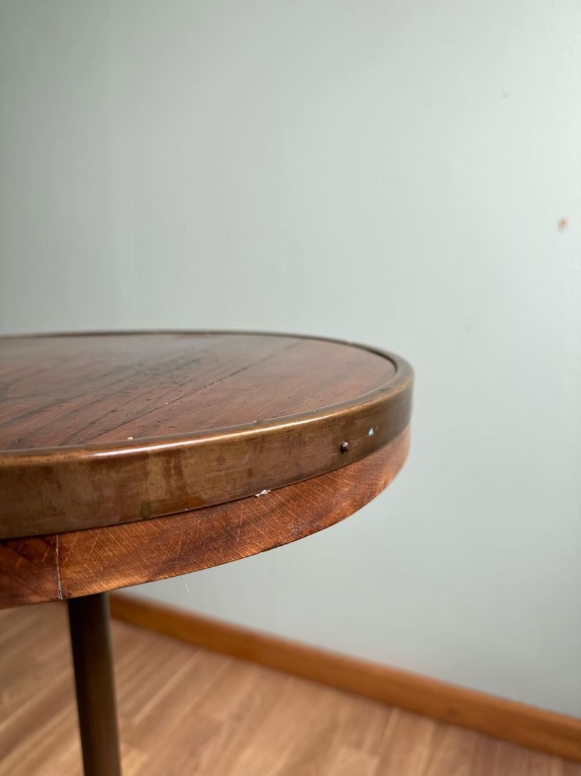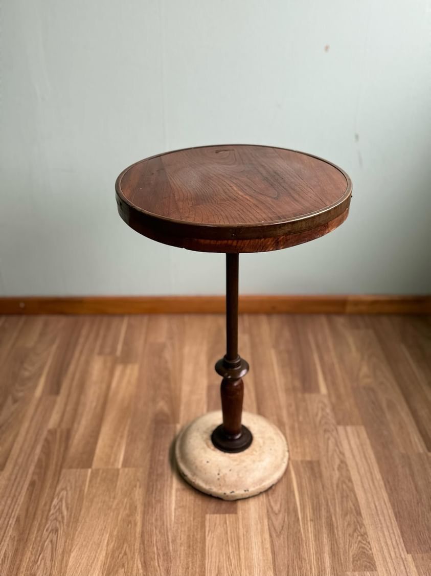 Base de hierro sólida, pata madera torneada y metal, cubierta madera excelente calidad, contorno superficie de bronce