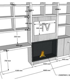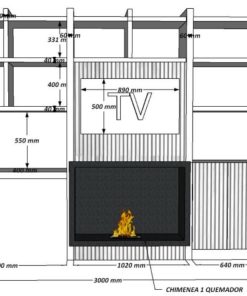 Medidas: 300 largo, 40 fondo máximo y 228 cm alto. Espacio TV 89×50 cm. Desglose de medidas interiores en imagen.
