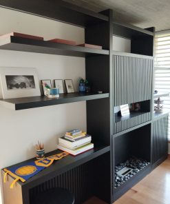 Tienda Natural Warm, madera pintado negro, iluminación led, escritorio, estufa etanol incorporada, palillaje en TV.