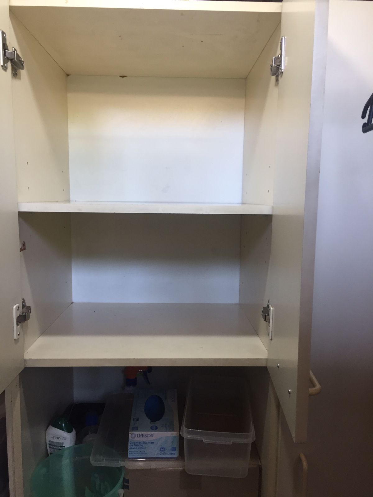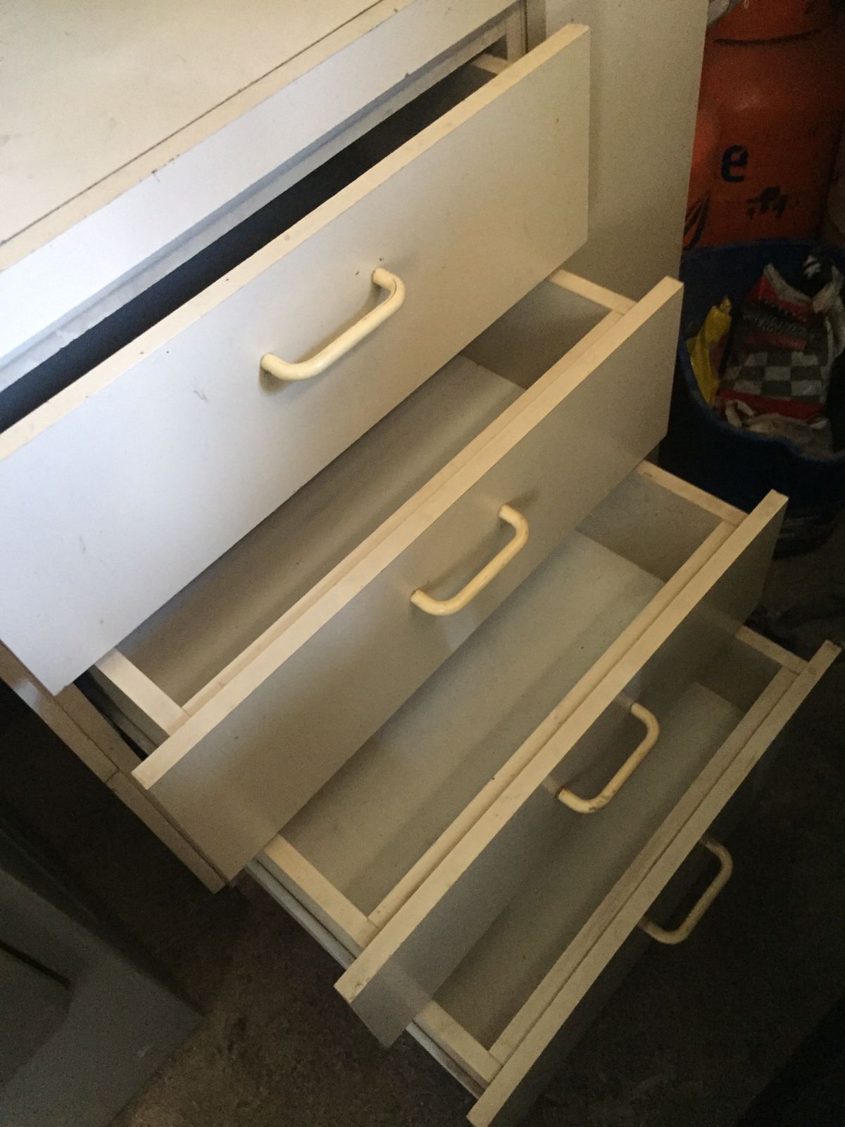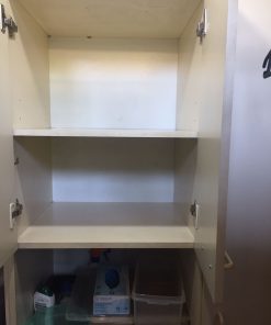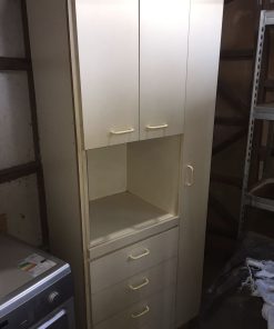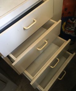 Divisiones: 4 cajones, 1 repisa, 2 puertas superiores con divisiones y puerta de utensilios