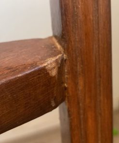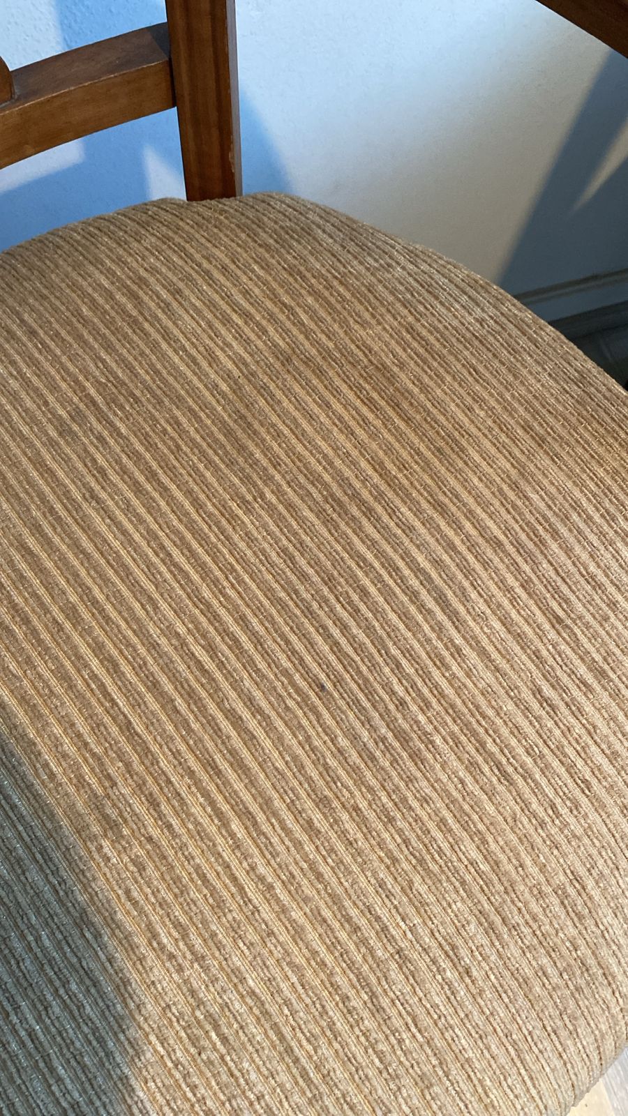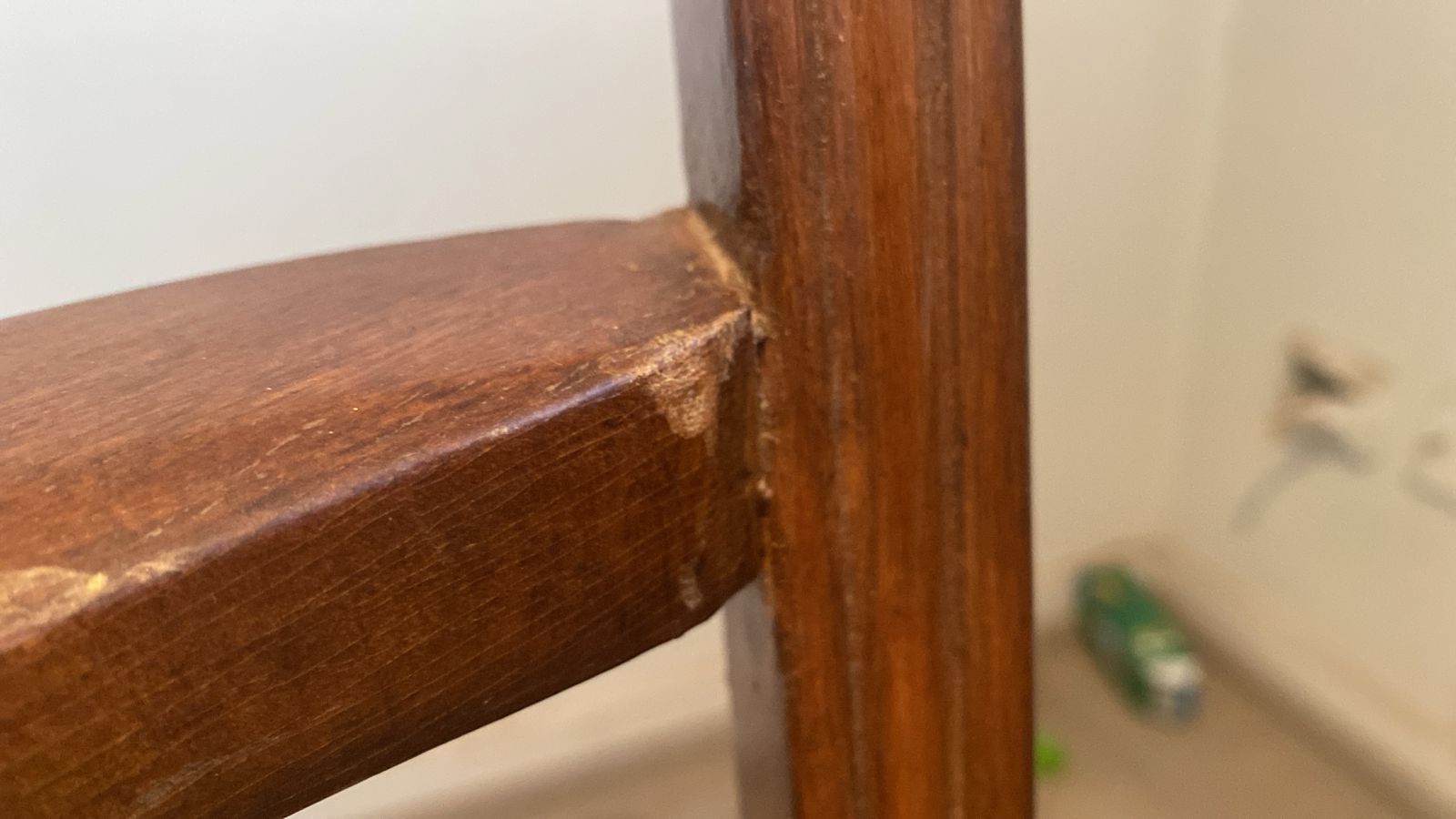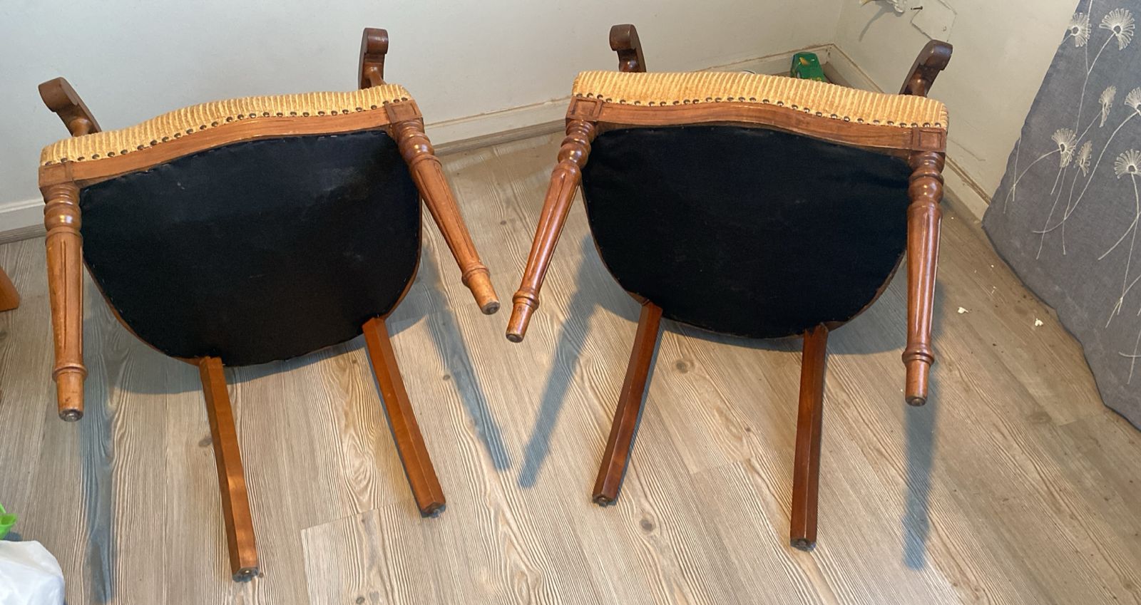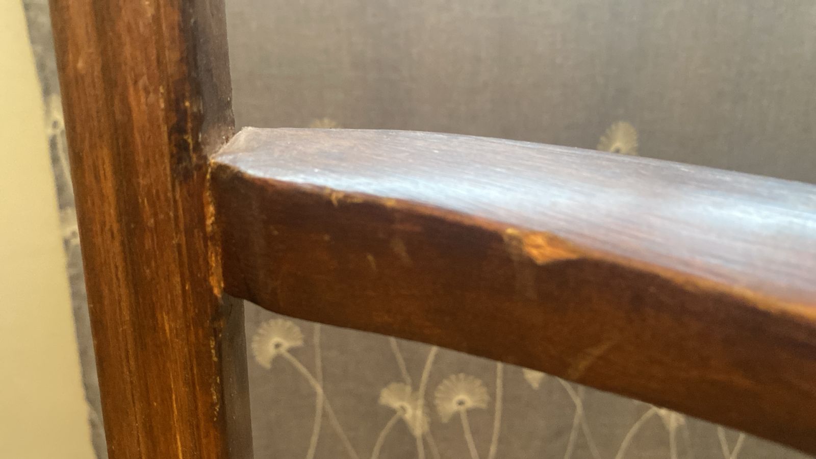 Detalle estético en madera de respaldo, algunas manchas en tapiz, una con más uso que la otra.