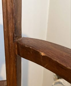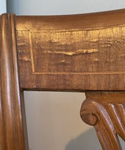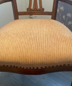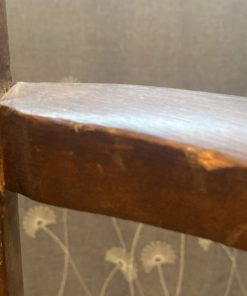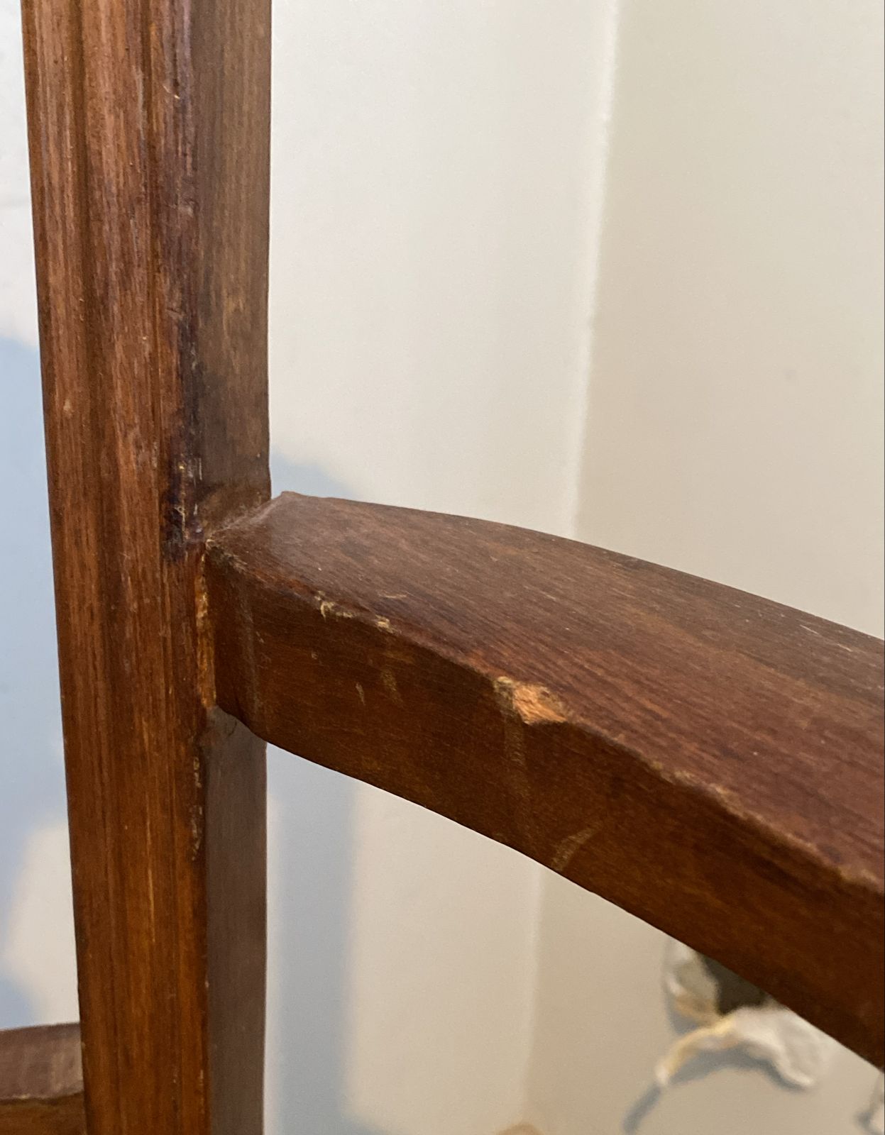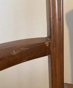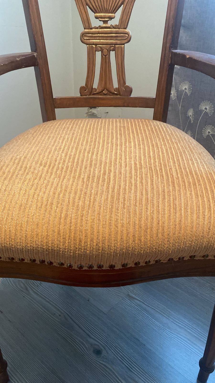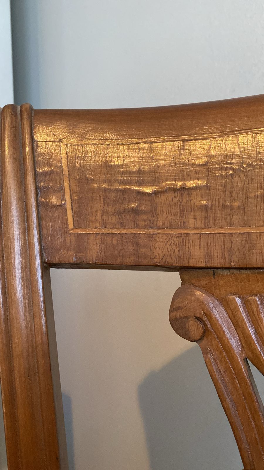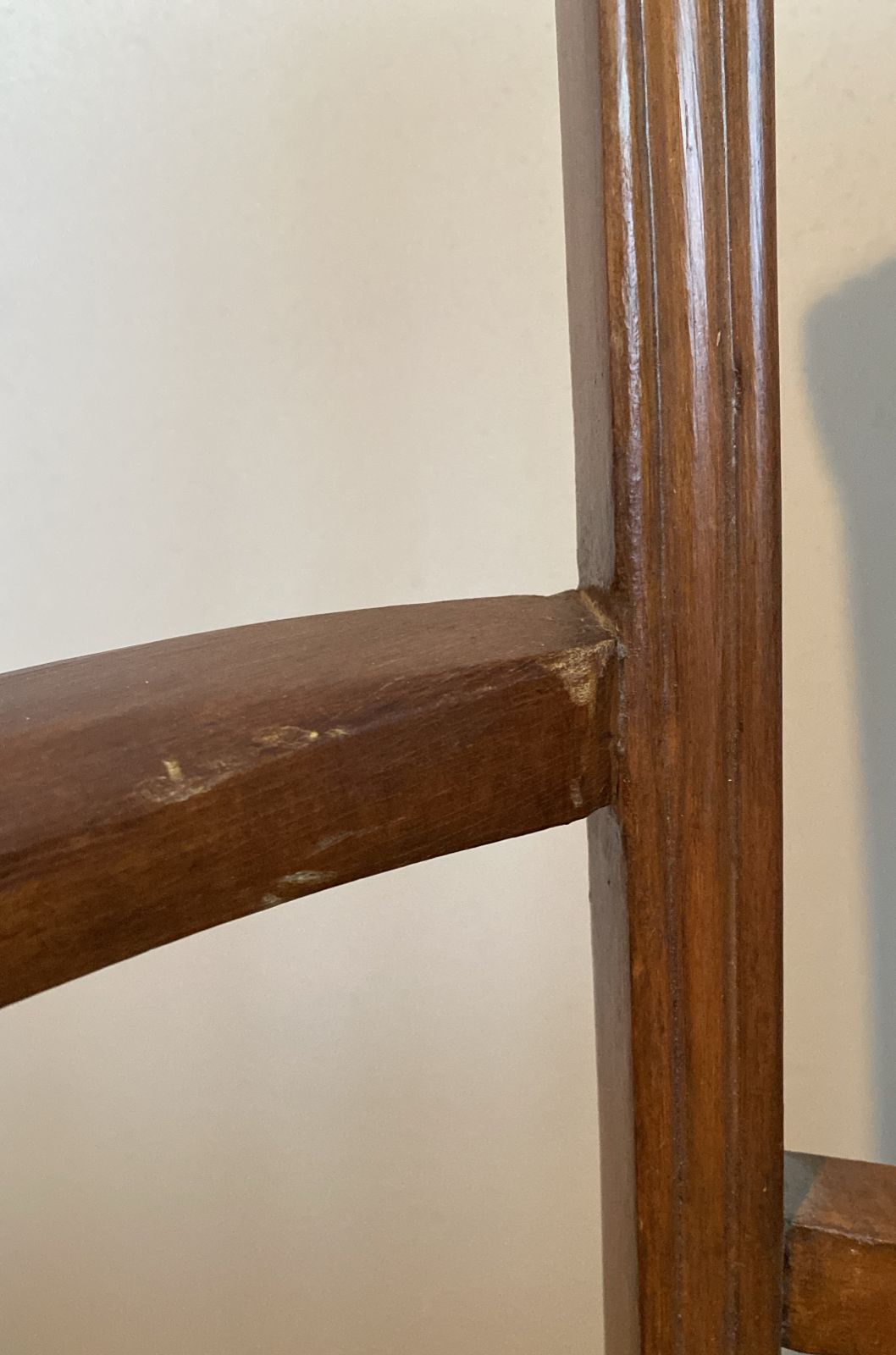 Detalle estético en madera de respaldo, algunas manchas en tapiz, una con más uso que la otra.