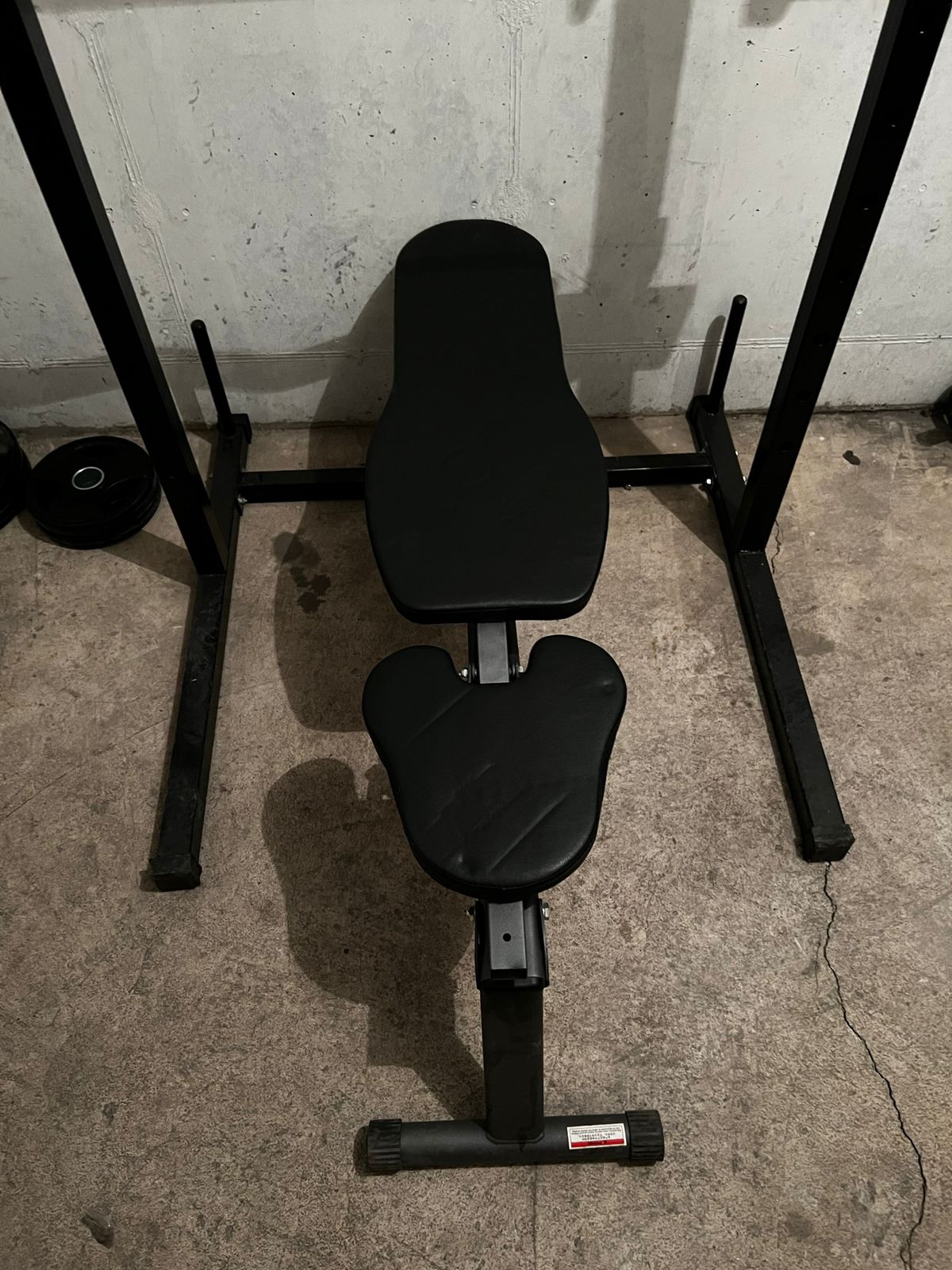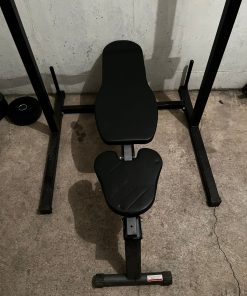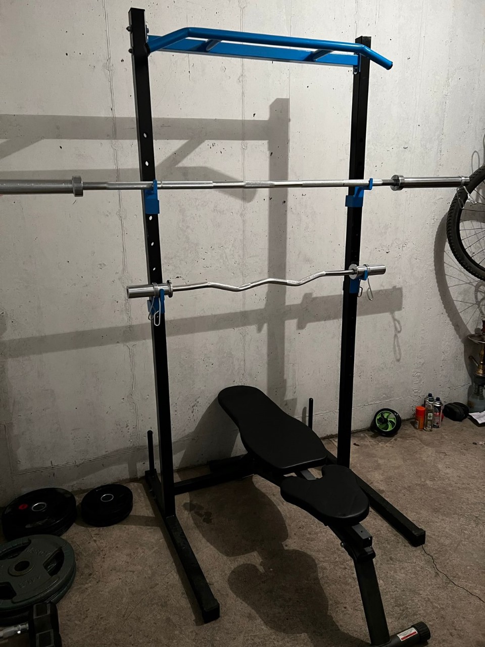 Incluye: rack, banca press iron side, barra olímpica de 220 cm, barra Z de 120 cm y discos