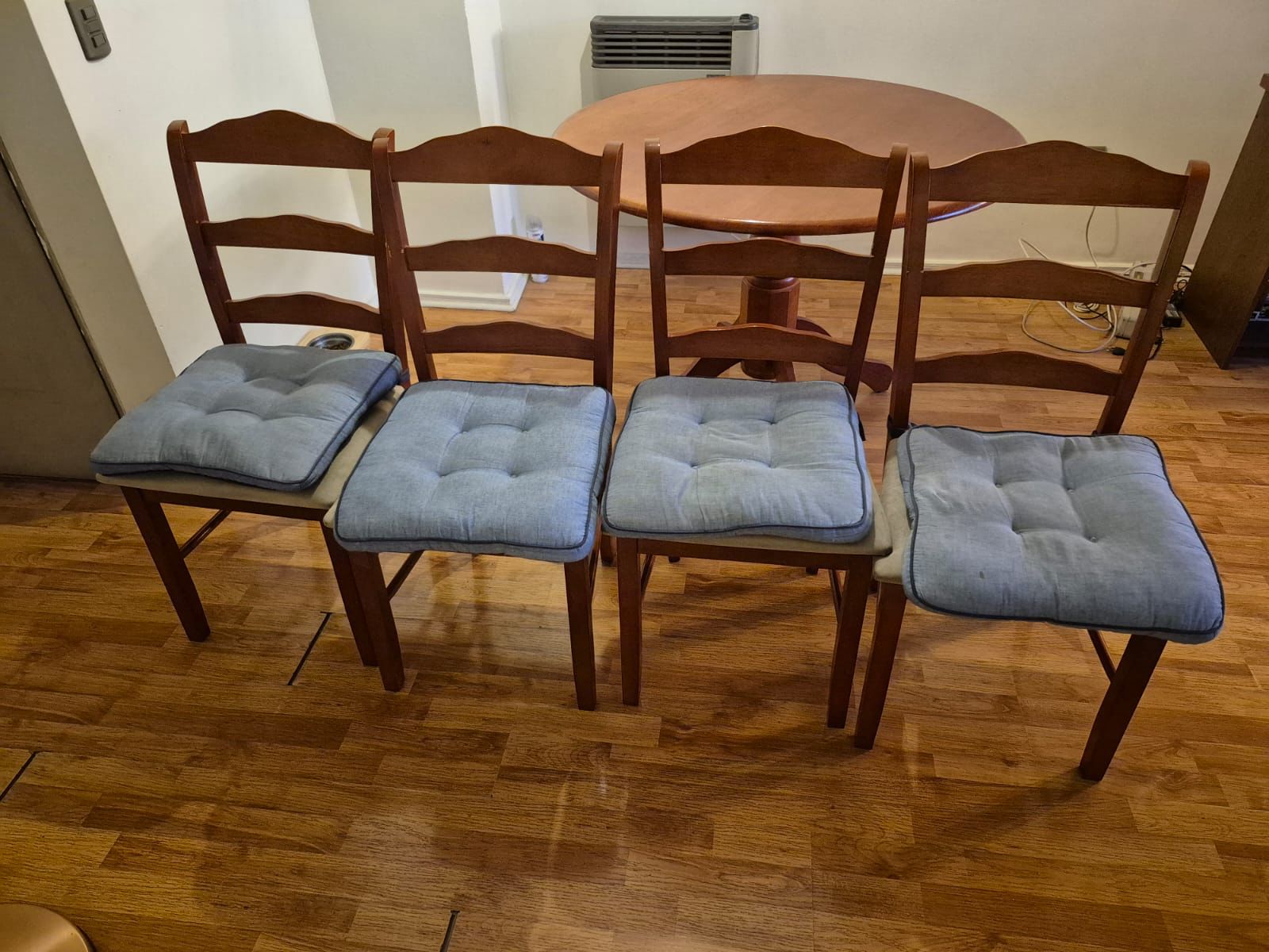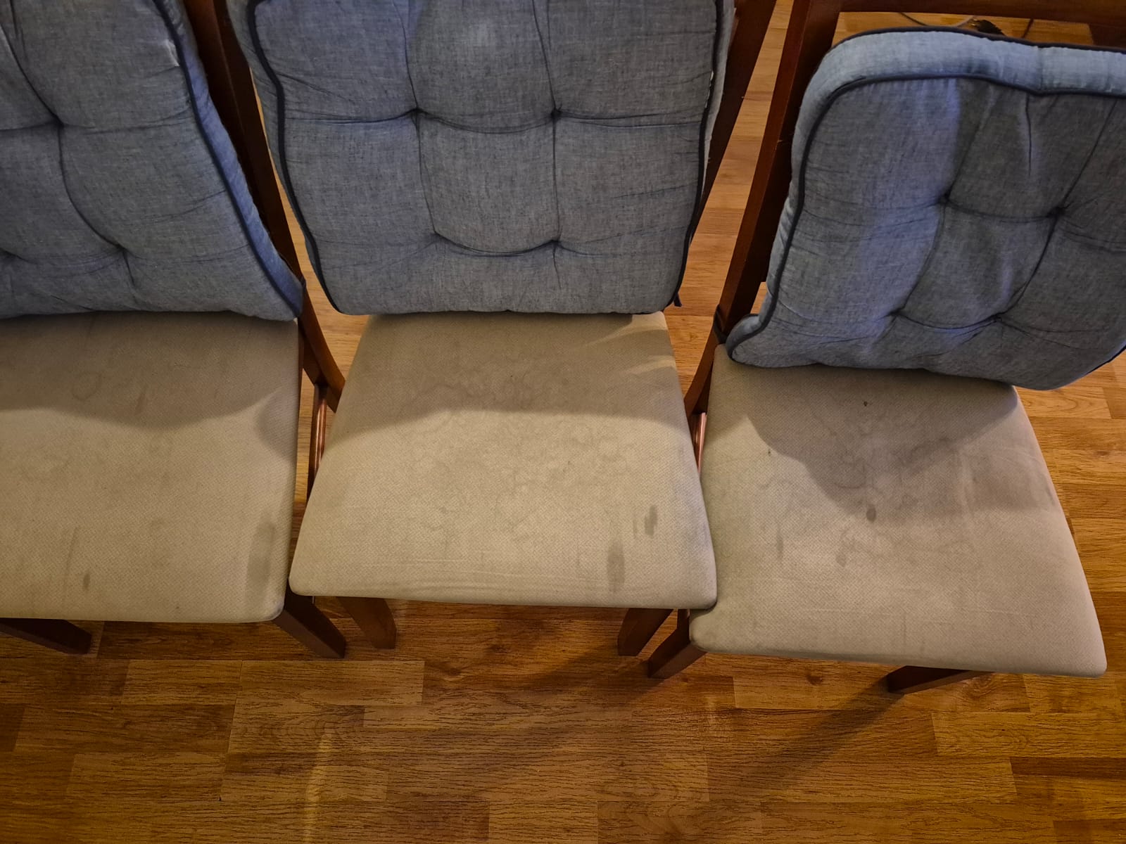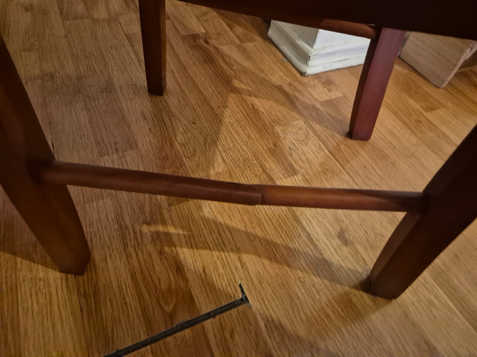 Picaduras por choque con la mesa, tapiz sucio, una de las sillas tiene un travesaño partido